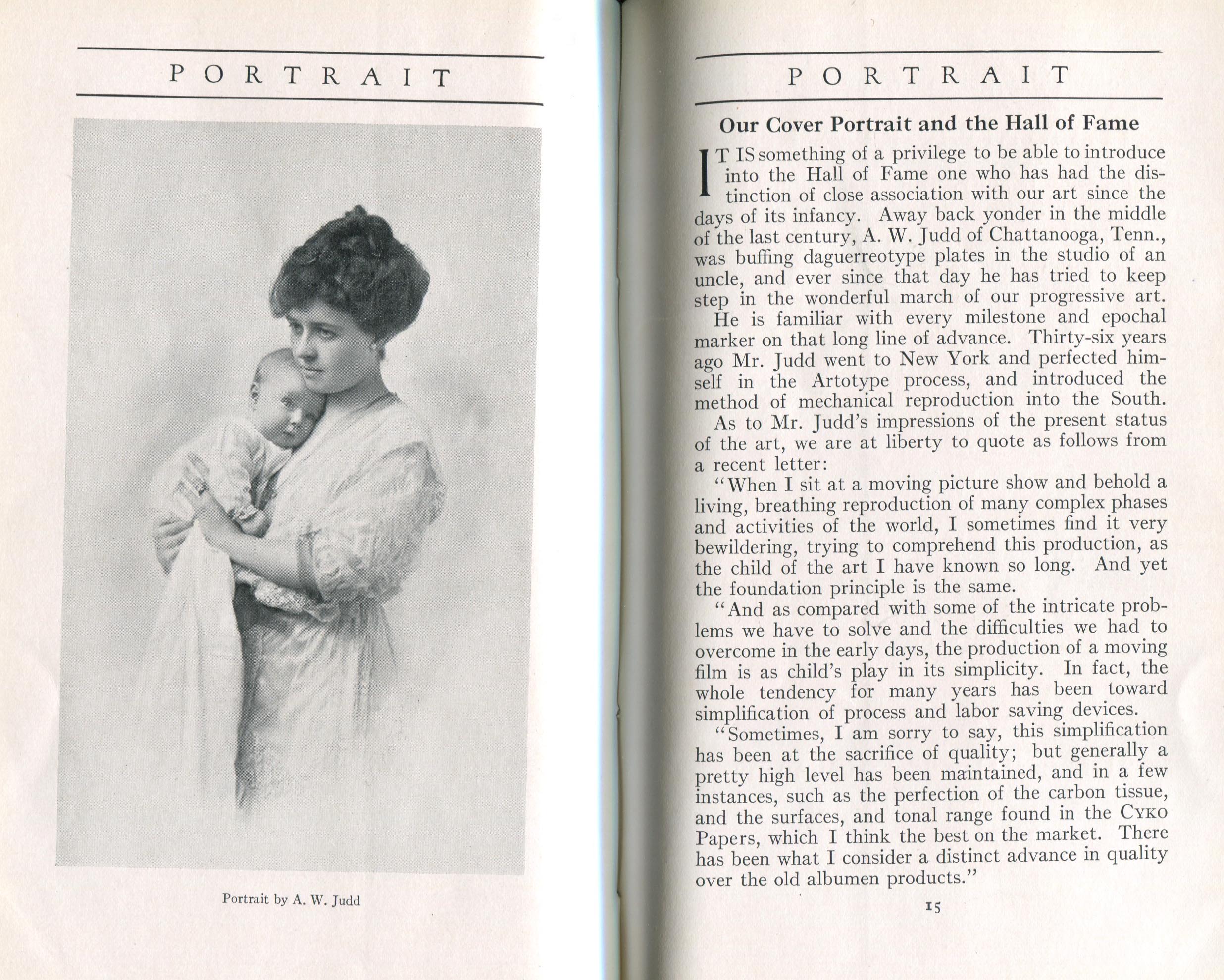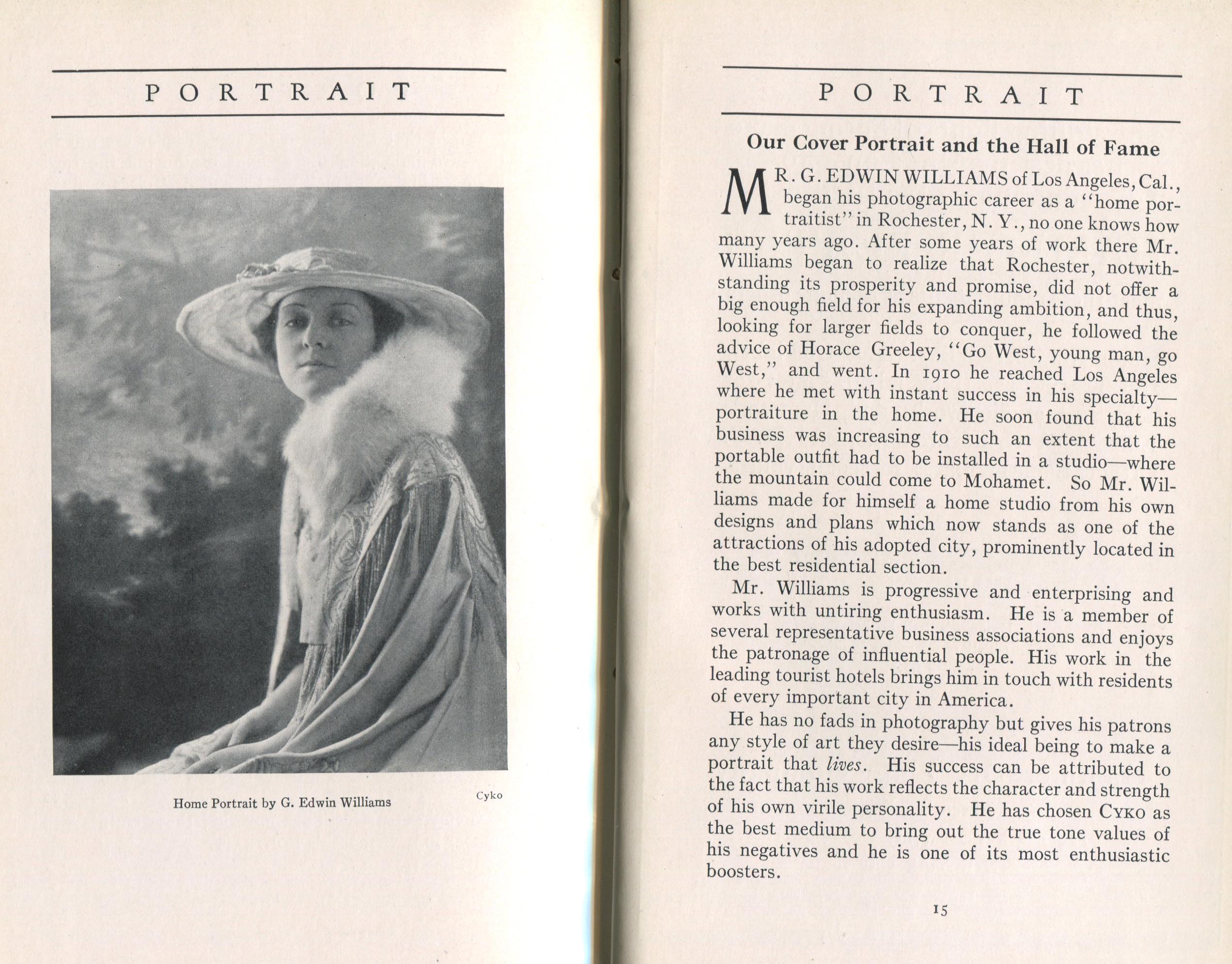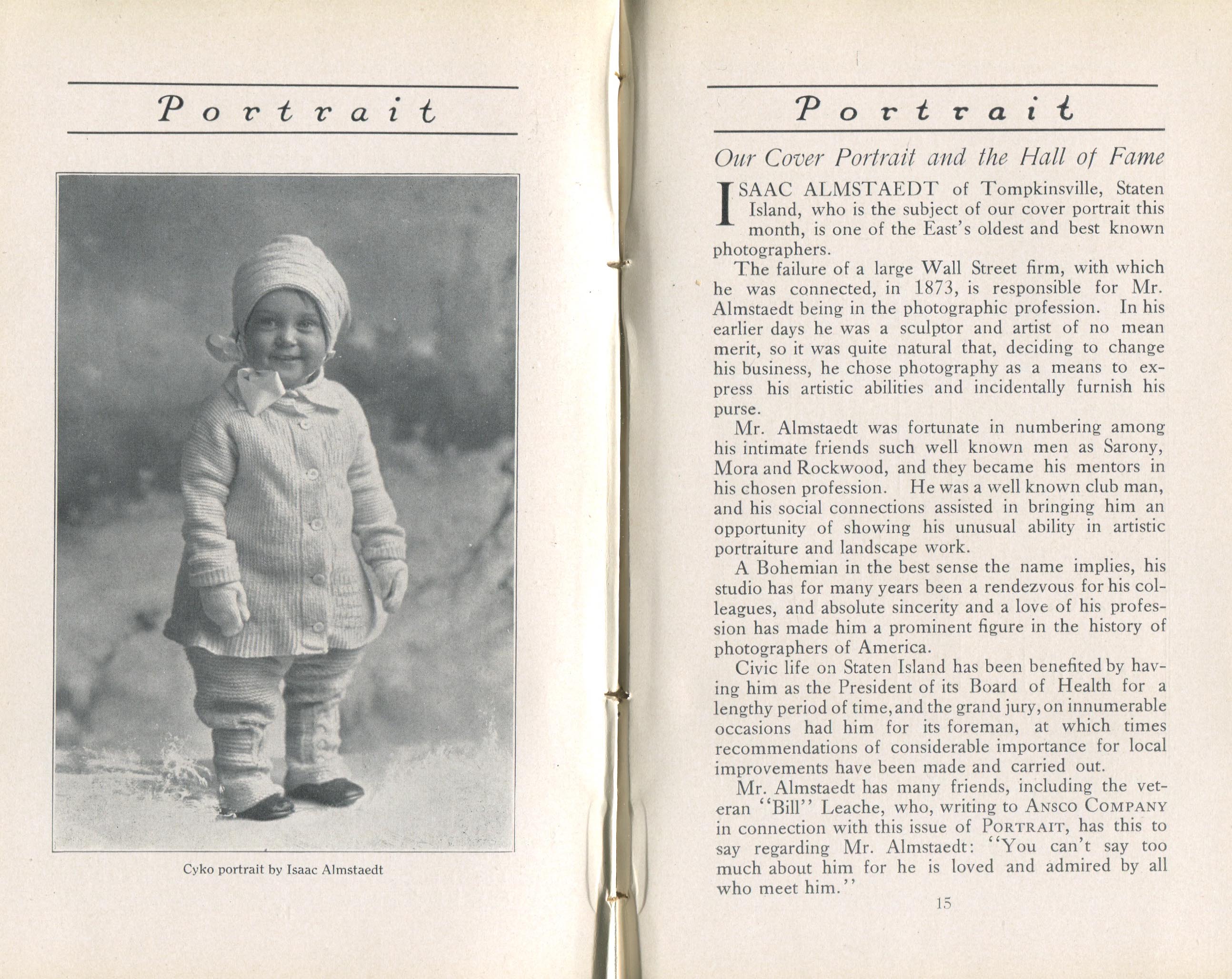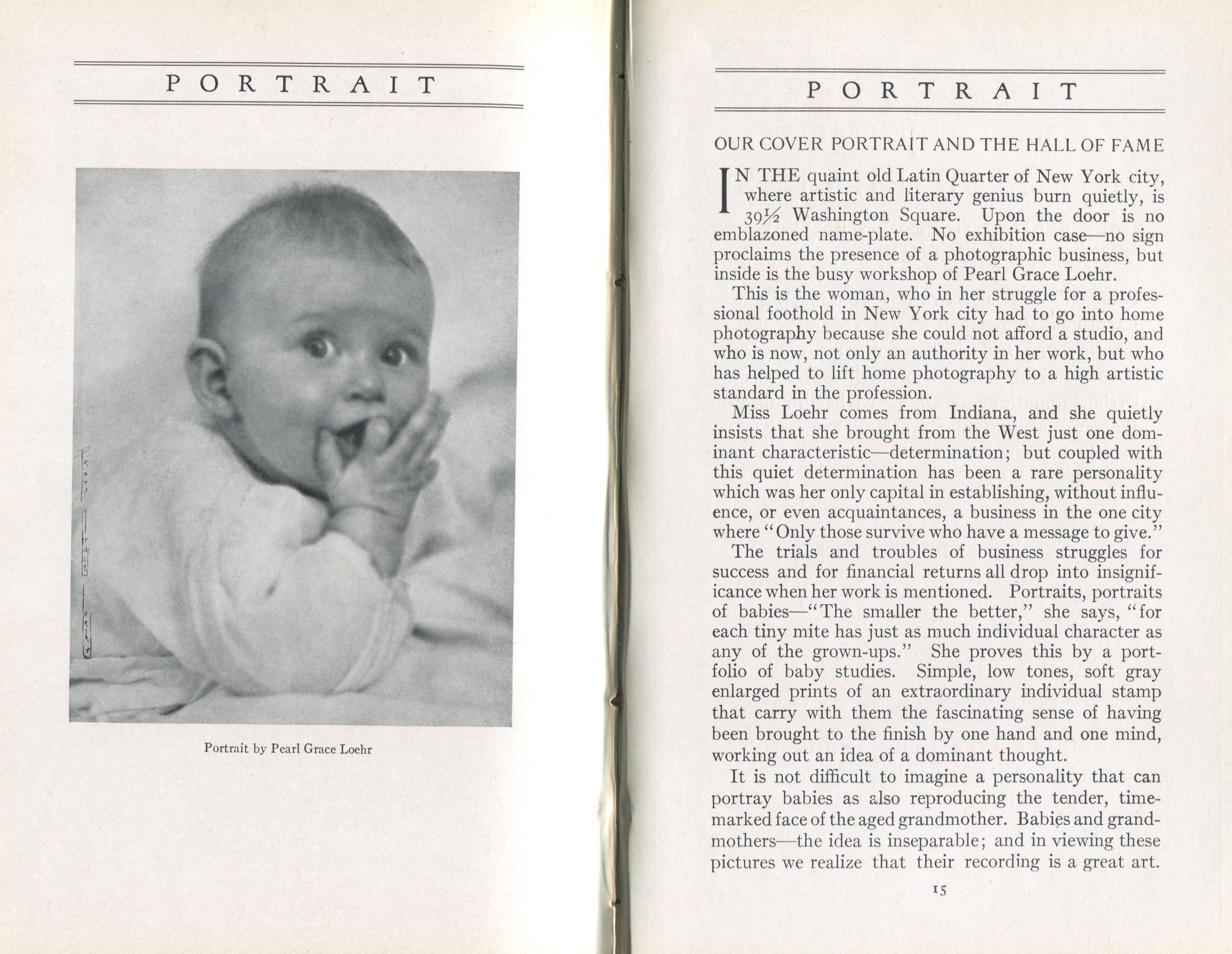Featured photographers included several members of the Coterie, an informal group of the leading professional portrait photographers in the United States: E.B. ("Pop") Core, Pirie MacDonald, Commodore M.J. Steffens, and Julius C. Strauss. Others, well known in their own day if not our own, included Louis F. and Walter K. Bachrach; Alice Boughton; Mary Carnell; William Shewell Ellis; John Garo; O. Pierre Havens; Lejaren à Hiller; Dudley Hoyt; Gertrude Kaesebier; Alexander L. and Gotthelf Pach; Ryland W. Phillips; George G. Rockwood; and Edward Weston. (The reproductions of Weston's photographs in 1915 are of considerable interest because he later tried to suppress this early work.) A few of those featured were not known particularly for portraiture, such as L.F. Hammer, of Hammer Dry Plates fame, and William H. Rau, more renowned for his production of lantern slides. Dozens of other photographers honored in Portrait's `Hall of Fame' are now rather obscure and their profiles may be among the few sources available on them.