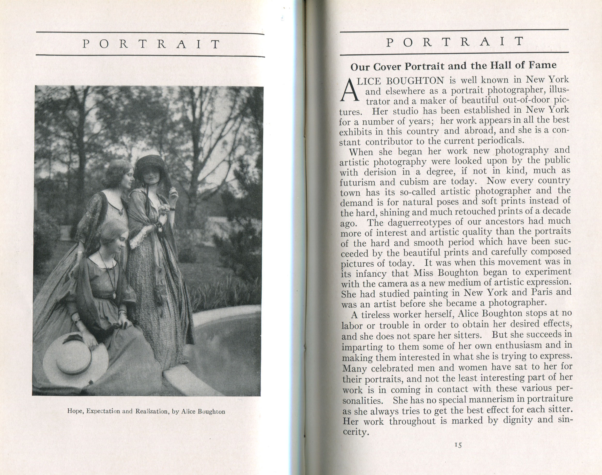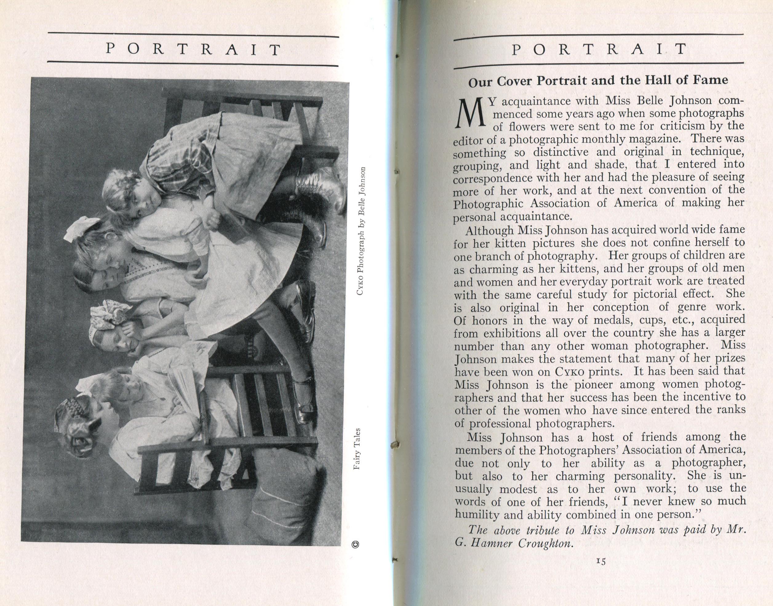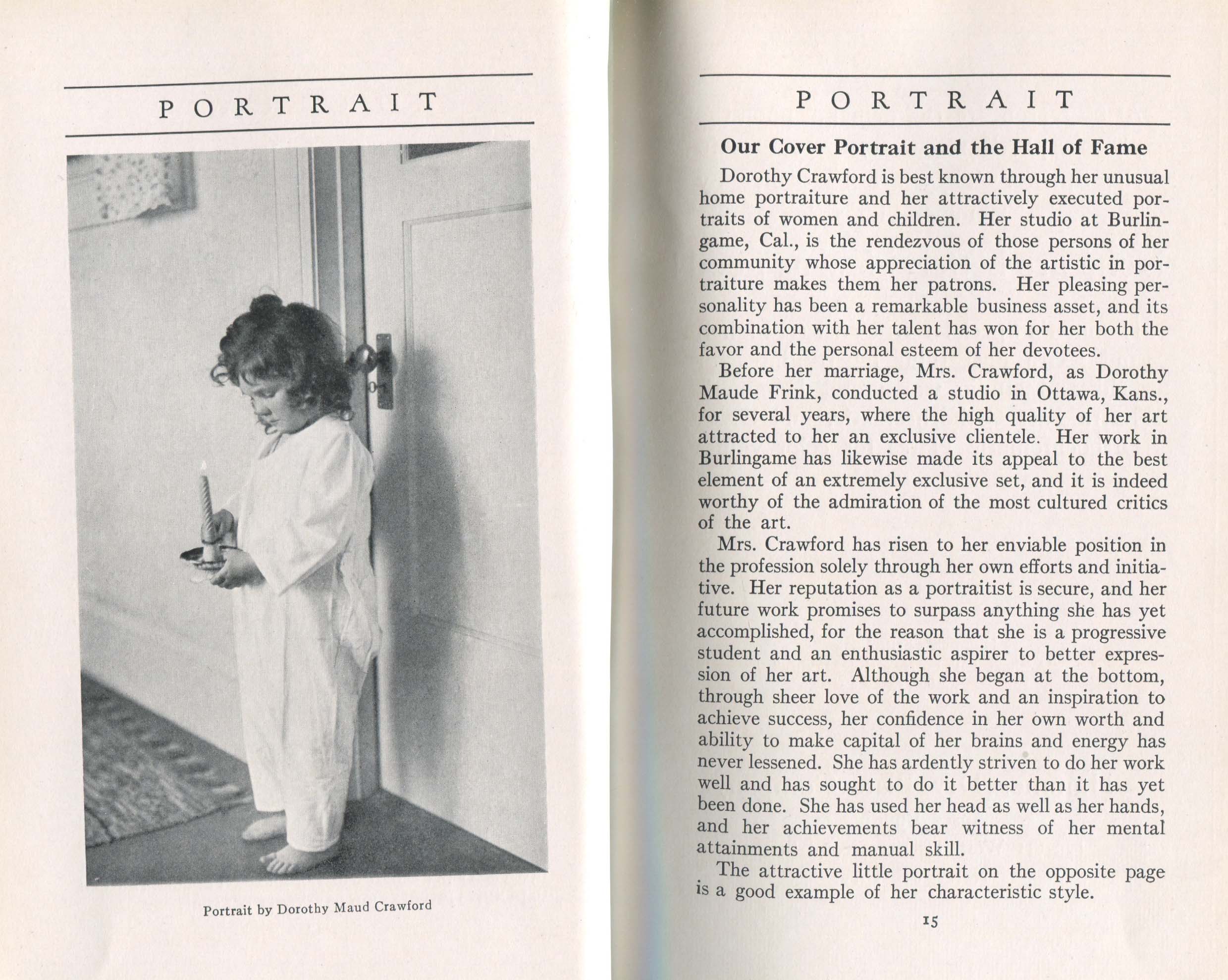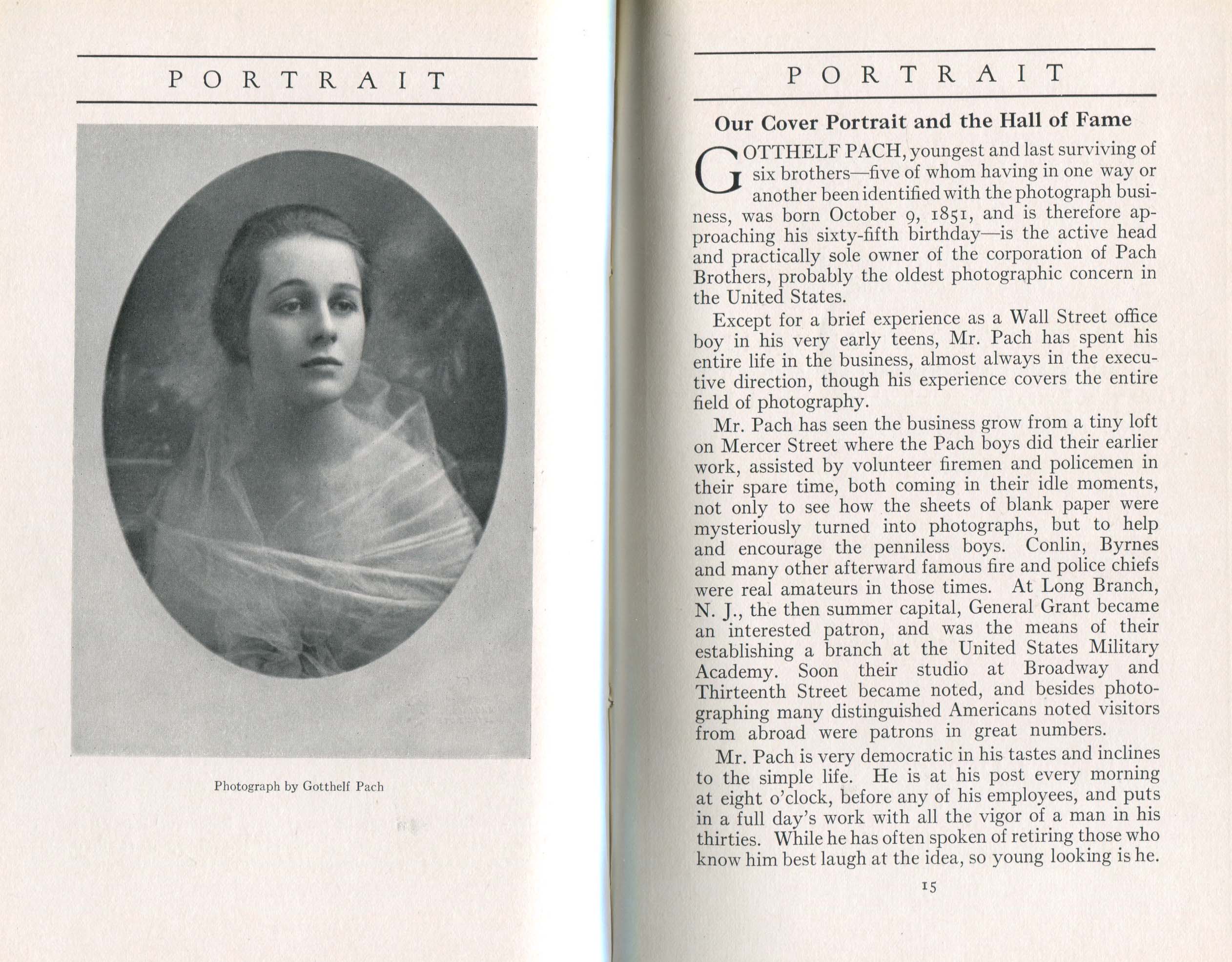 Featured photographers included several members of the Coterie, an informal group of the leading professional portrait photographers in the United States: E.B. ("Pop") Core, Pirie MacDonald, Commodore M.J. Steffens, and Julius C. Strauss. Others, well known in their own day if not our own, included Louis F. and Walter K. Bachrach; Alice Boughton; Mary Carnell; William Shewell Ellis; John Garo; O. Pierre Havens; Lejaren à Hiller; Dudley Hoyt; Gertrude Kaesebier; Alexander L. and Gotthelf Pach; Ryland W. Phillips; George G. Rockwood; and Edward Weston. (The reproductions of Weston's photographs in 1915 are of considerable interest because he later tried to suppress this early work.) A few of those featured were not known particularly for portraiture, such as L.F. Hammer, of Hammer Dry Plates fame, and William H. Rau, more renowned for his production of lantern slides. Dozens of other photographers honored in Portrait's `Hall of Fame' are now rather obscure and their profiles may be among the few sources available on them.