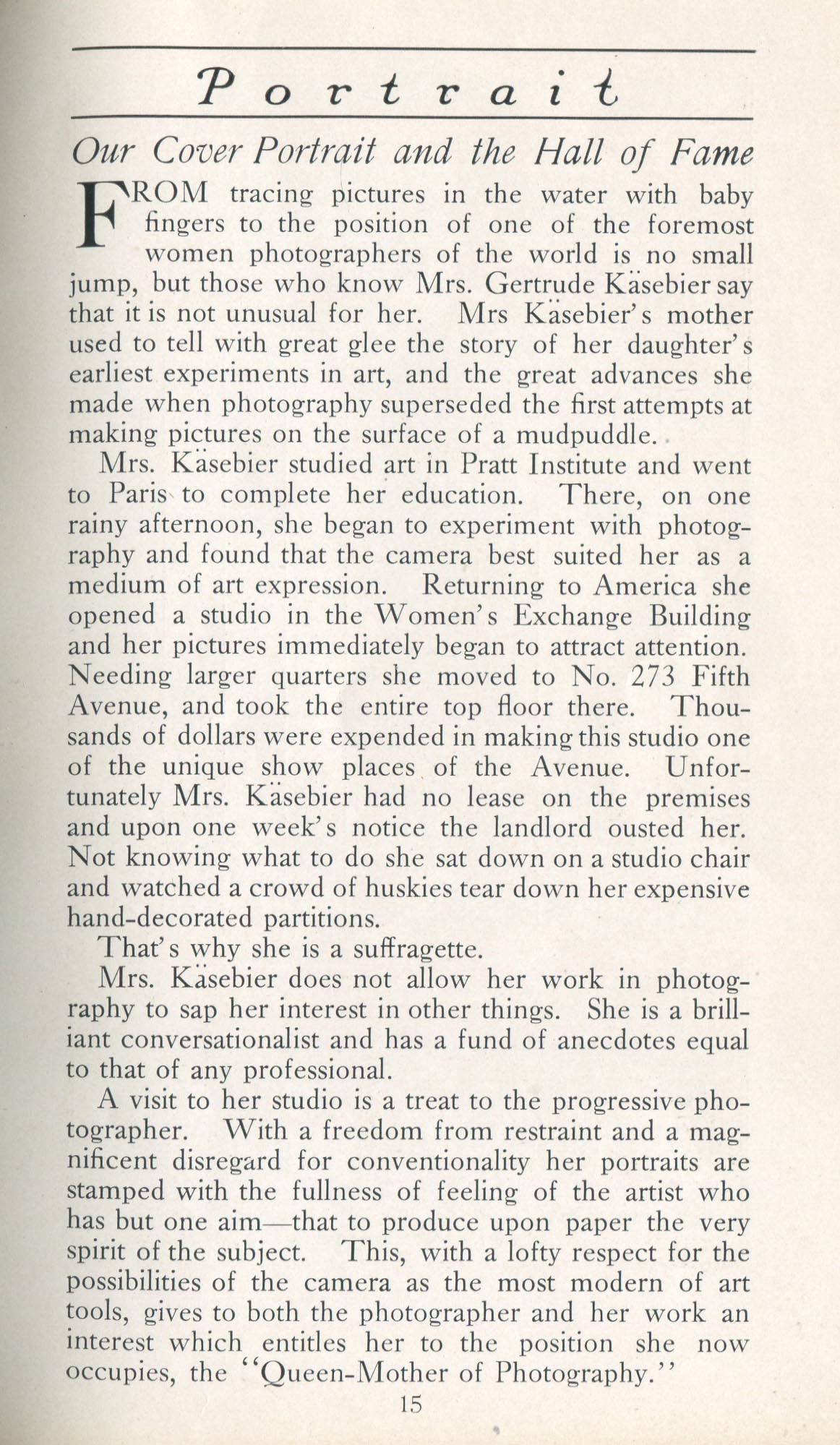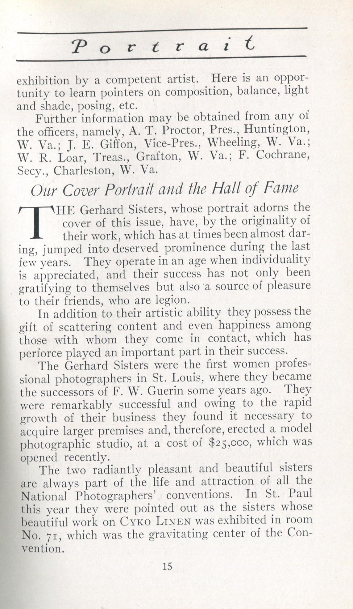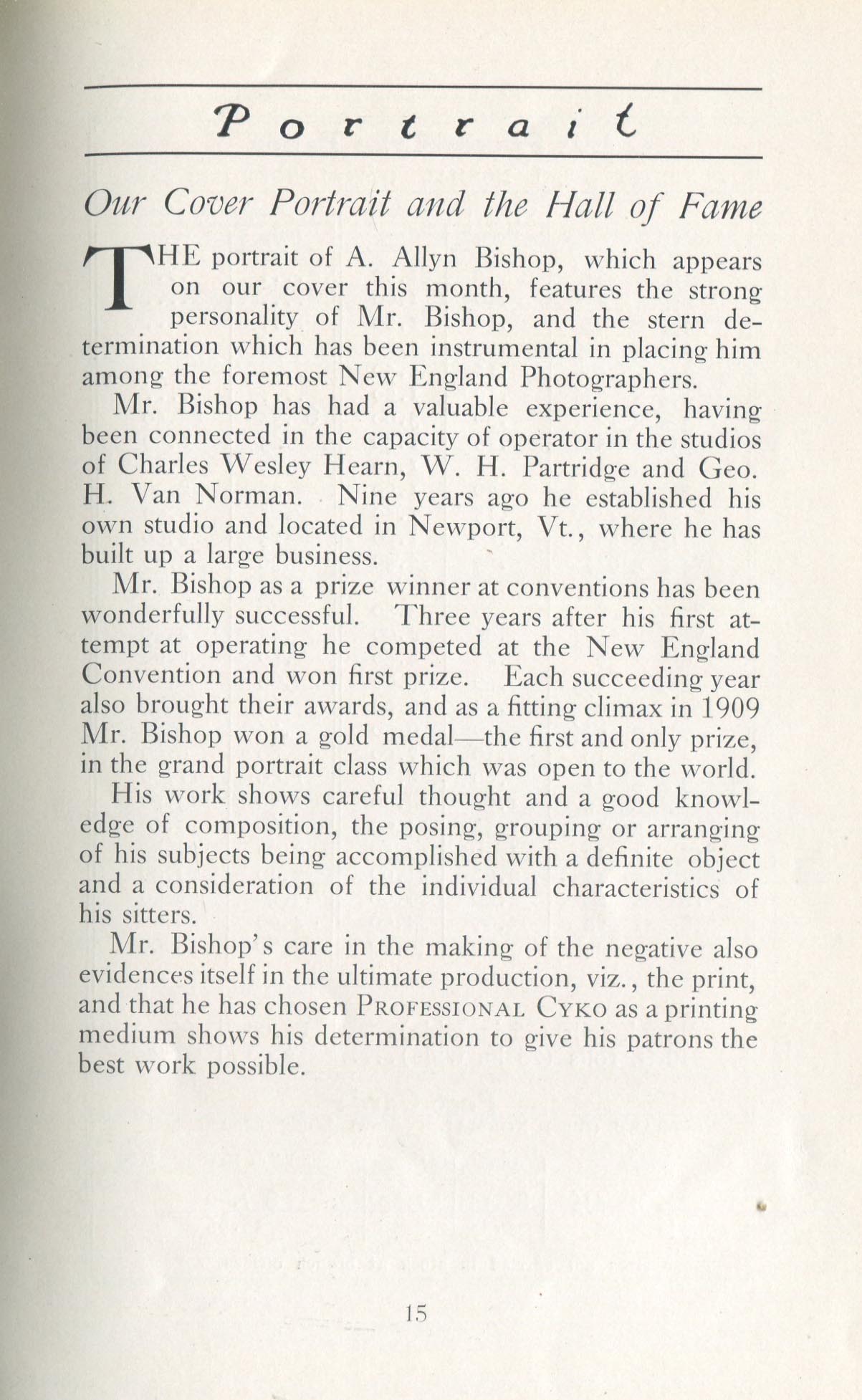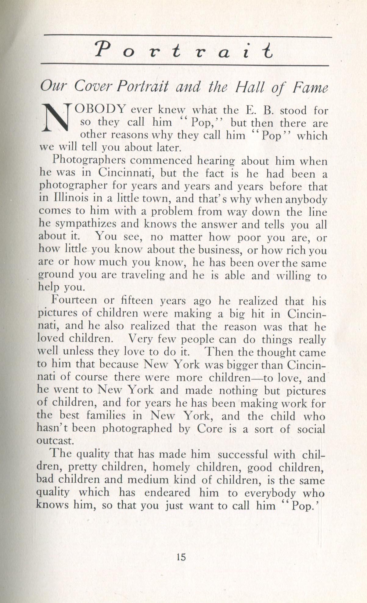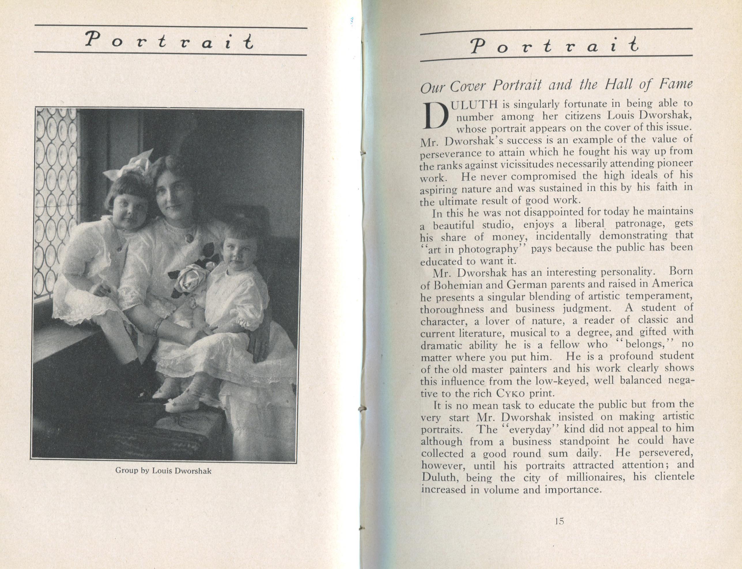 Featured photographers included several members of the Coterie, an informal group of the leading professional portrait photographers in the United States: E.B. ("Pop") Core, Pirie MacDonald, Commodore M.J. Steffens, and Julius C. Strauss. Others, well known in their own day if not our own, included Louis F. and Walter K. Bachrach; Alice Boughton; Mary Carnell; William Shewell Ellis; John Garo; O. Pierre Havens; Lejaren à Hiller; Dudley Hoyt; Gertrude Kaesebier; Alexander L. and Gotthelf Pach; Ryland W. Phillips; George G. Rockwood; and Edward Weston. (The reproductions of Weston's photographs in 1915 are of considerable interest because he later tried to suppress this early work.) A few of those featured were not known particularly for portraiture, such as L.F. Hammer, of Hammer Dry Plates fame, and William H. Rau, more renowned for his production of lantern slides. Dozens of other photographers honored in Portrait's `Hall of Fame' are now rather obscure and their profiles may be among the few sources available on them.