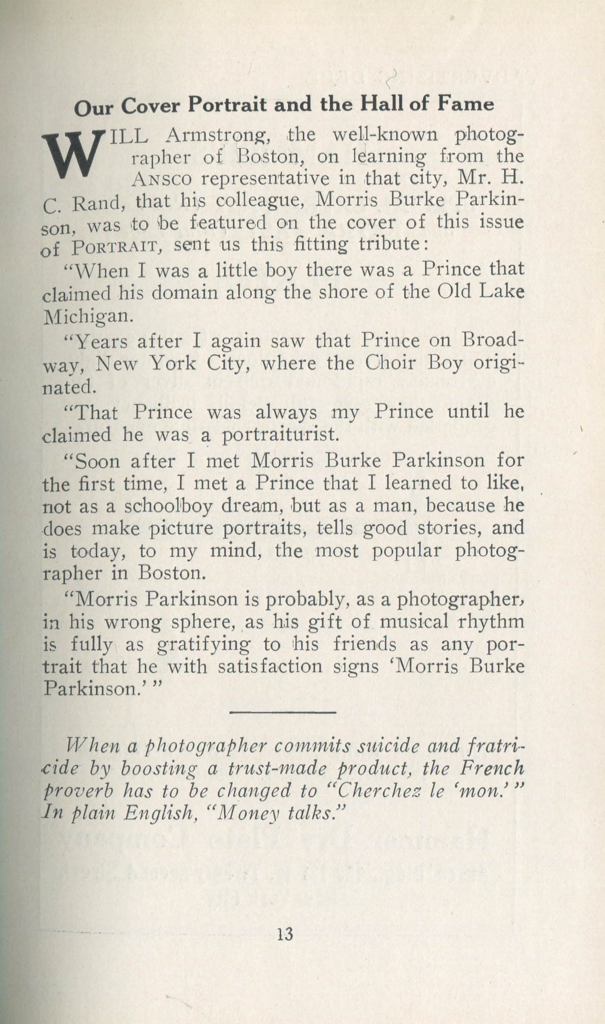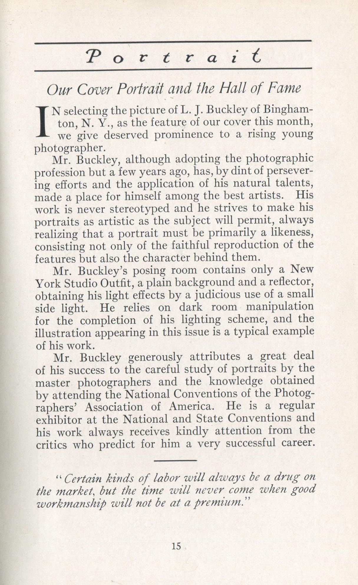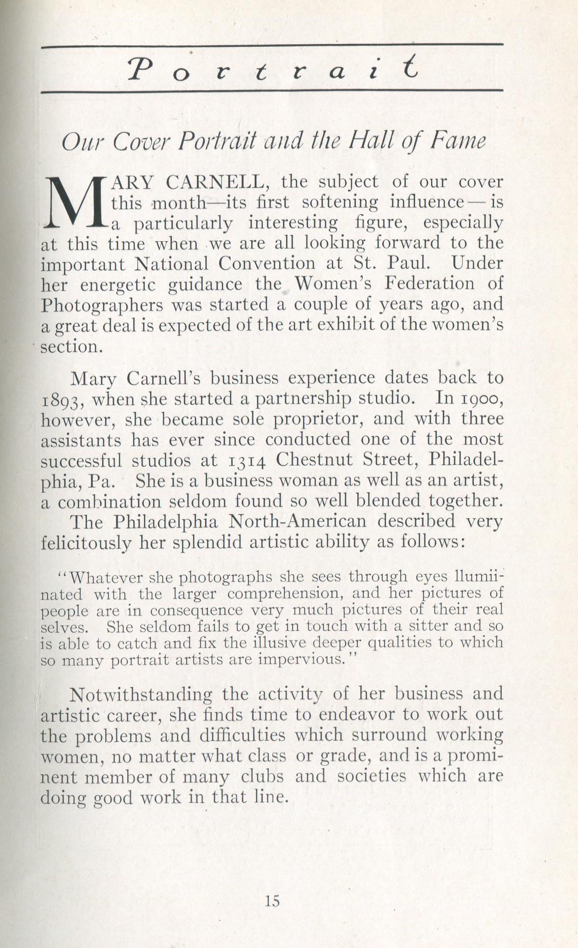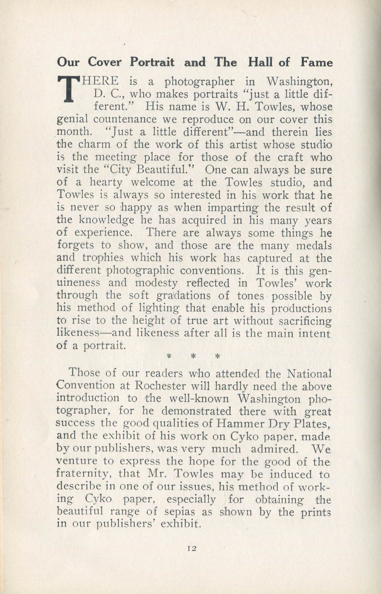 Featured photographers included several members of the Coterie, an informal group of the leading professional portrait photographers in the United States: E.B. ("Pop") Core, Pirie MacDonald, Commodore M.J. Steffens, and Julius C. Strauss. Others, well known in their own day if not our own, included Louis F. and Walter K. Bachrach; Alice Boughton; Mary Carnell; William Shewell Ellis; John Garo; O. Pierre Havens; Lejaren à Hiller; Dudley Hoyt; Gertrude Kaesebier; Alexander L. and Gotthelf Pach; Ryland W. Phillips; George G. Rockwood; and Edward Weston. (The reproductions of Weston's photographs in 1915 are of considerable interest because he later tried to suppress this early work.) A few of those featured were not known particularly for portraiture, such as L.F. Hammer, of Hammer Dry Plates fame, and William H. Rau, more renowned for his production of lantern slides. Dozens of other photographers honored in Portrait's `Hall of Fame' are now rather obscure and their profiles may be among the few sources available on them.