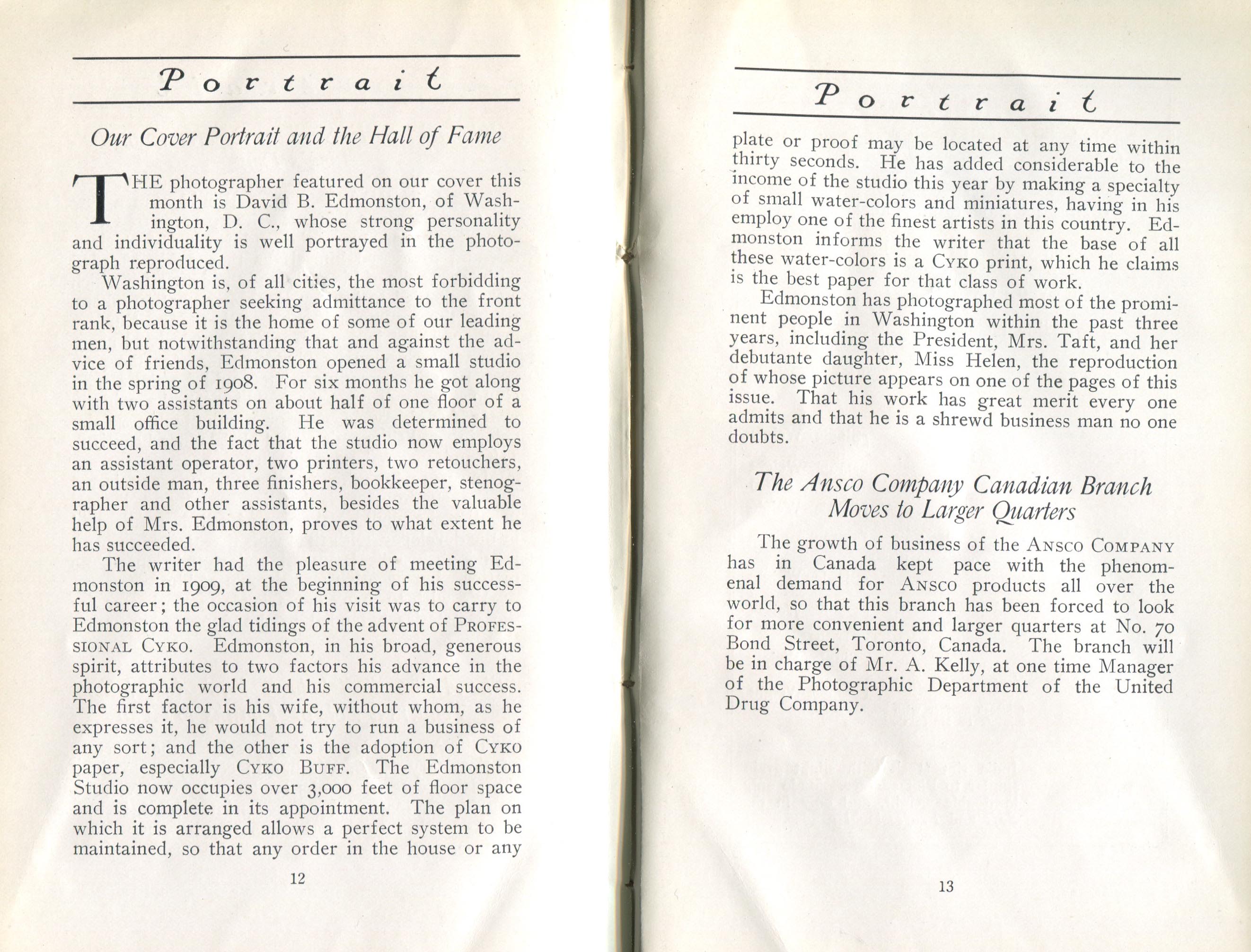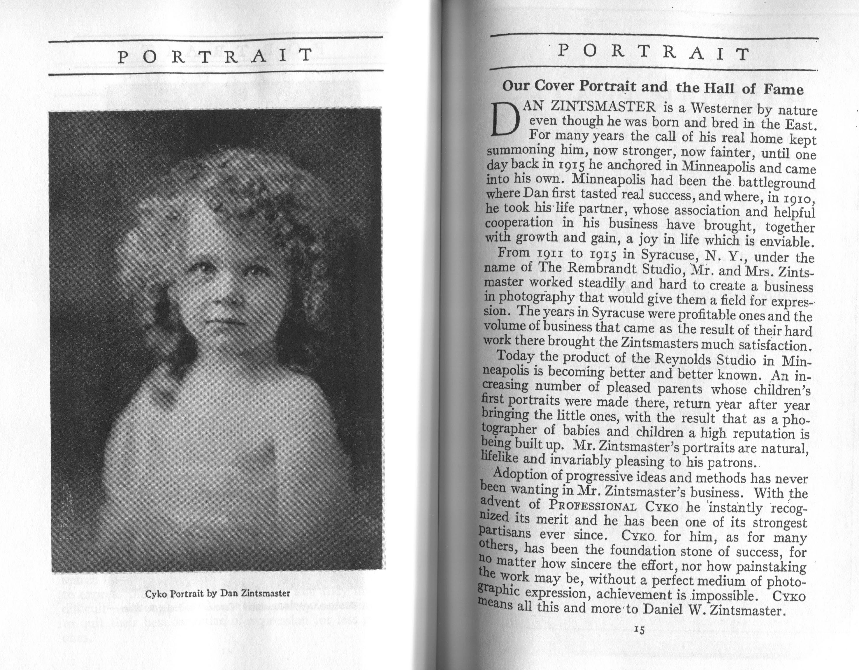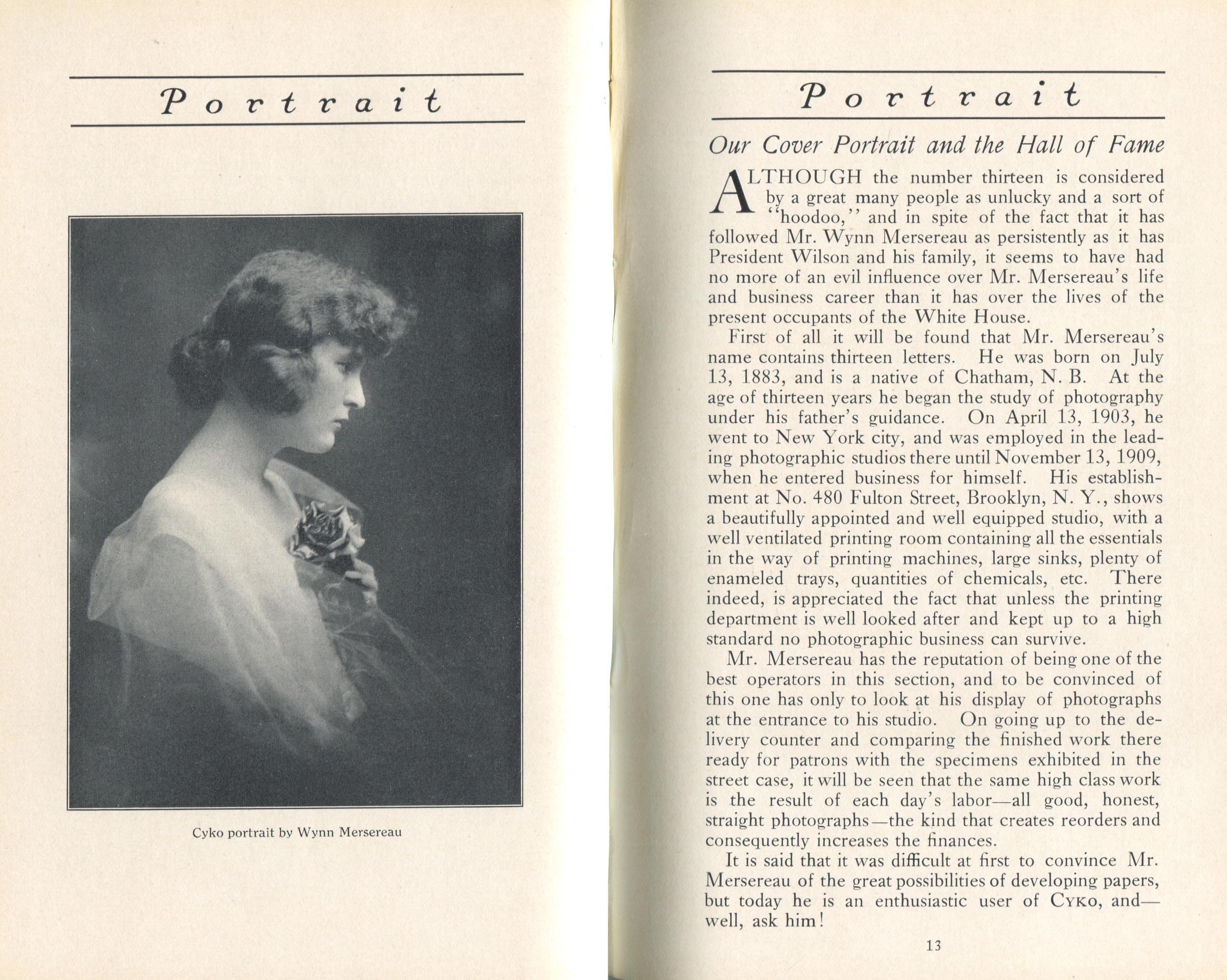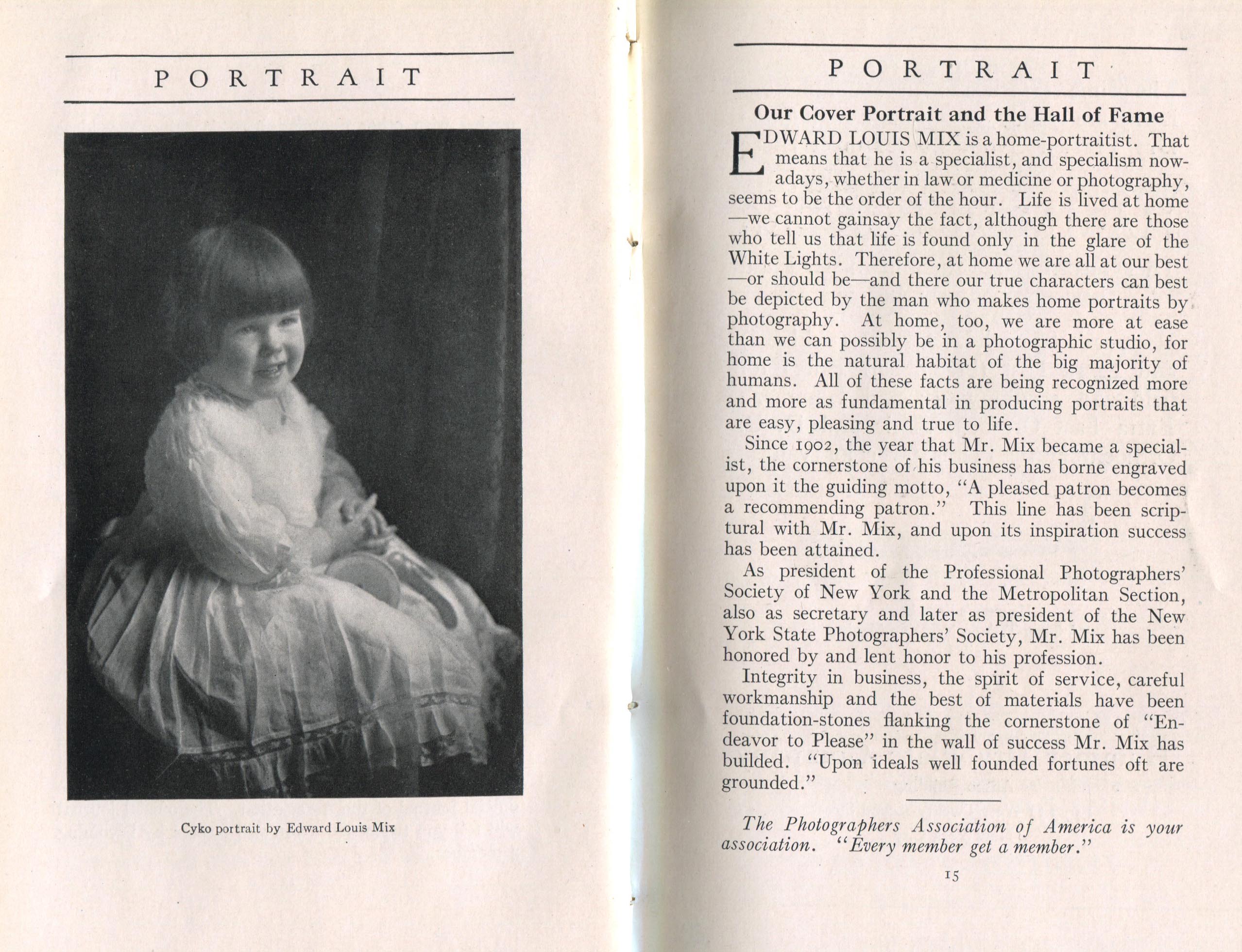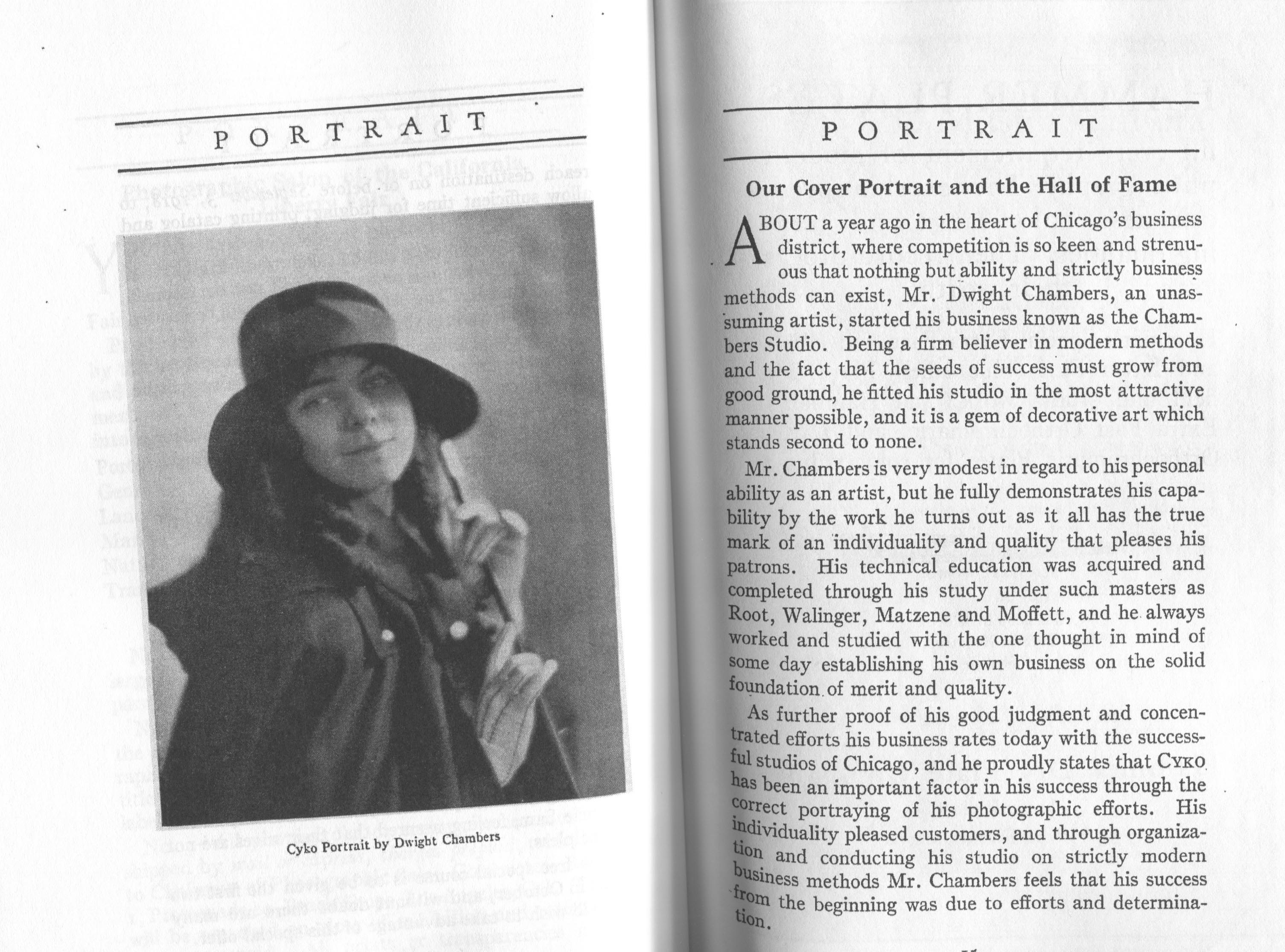 Portrait is also a good source for portraits of, and biographical information concerning, practitioners of `art-in-portraiture.' One hundred and forty-two photographers, including seventeen women, were honored with cover stories. (Since seven photographers had partners, the number of studios involved was 135.) Almost every issue featured a portrait of a U.S. or Canadian photographer on the cover, an appreciative profile, including the photographer's endorsement of ANSCO’s Cyko paper, and one or more examples of the photographer's work.