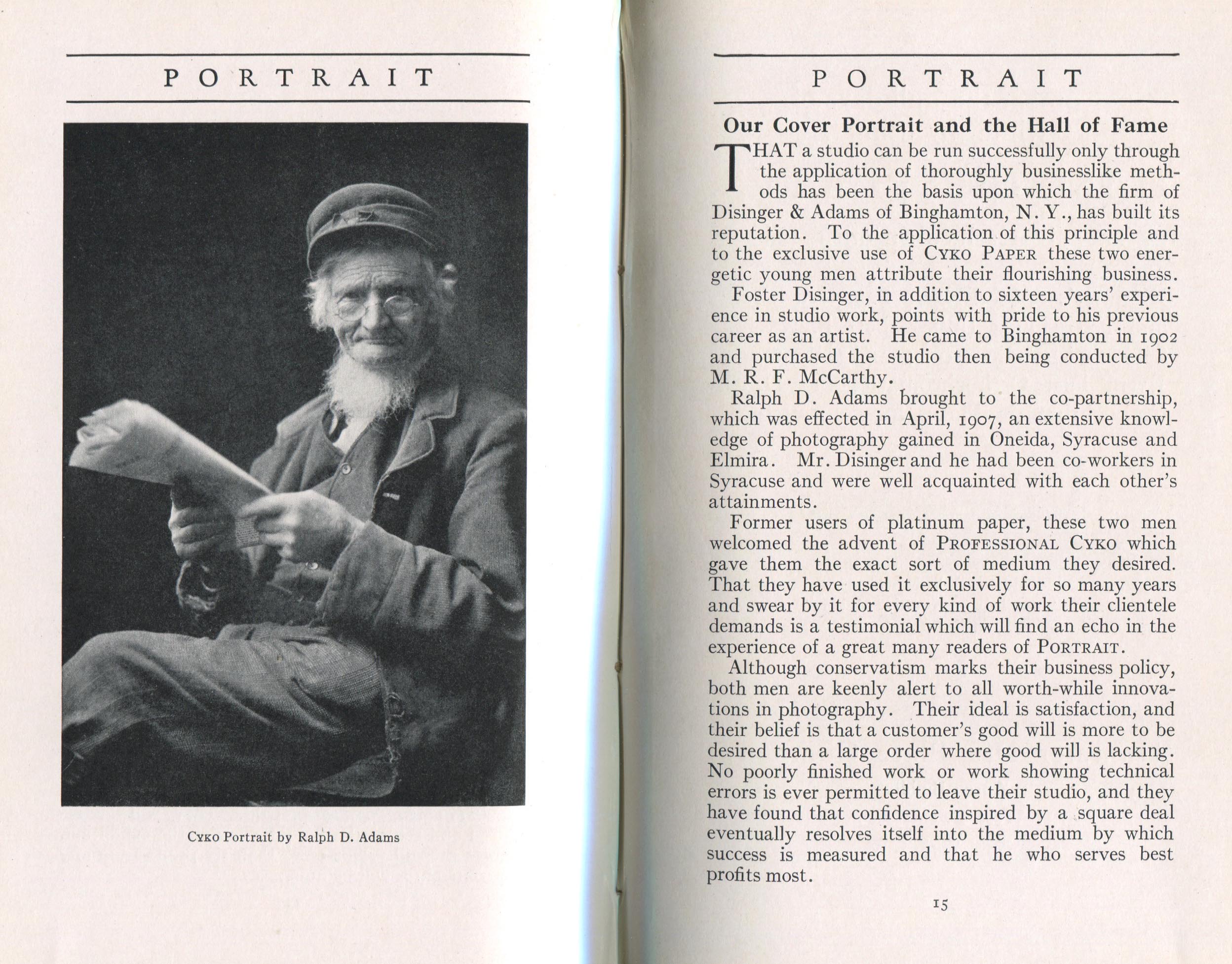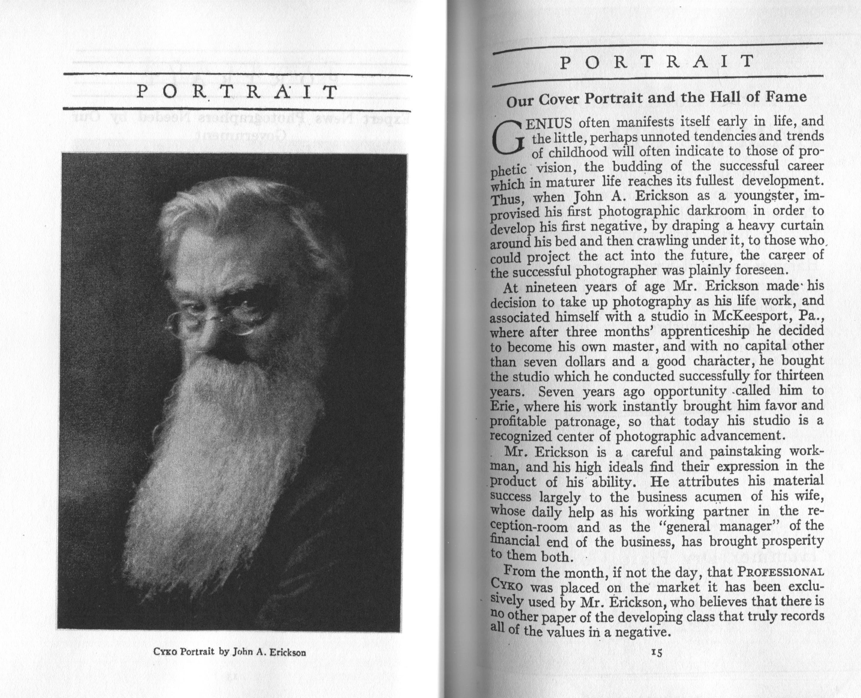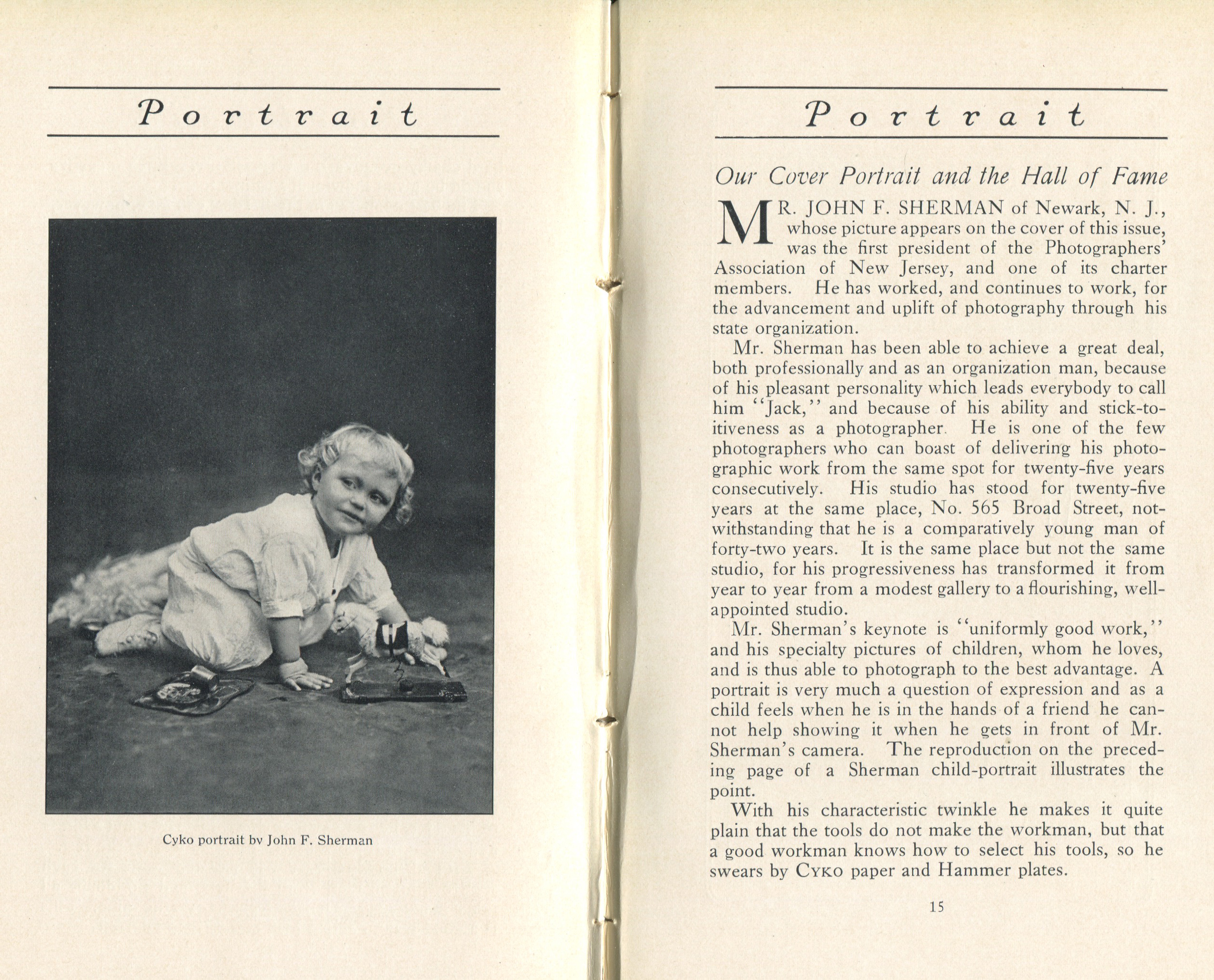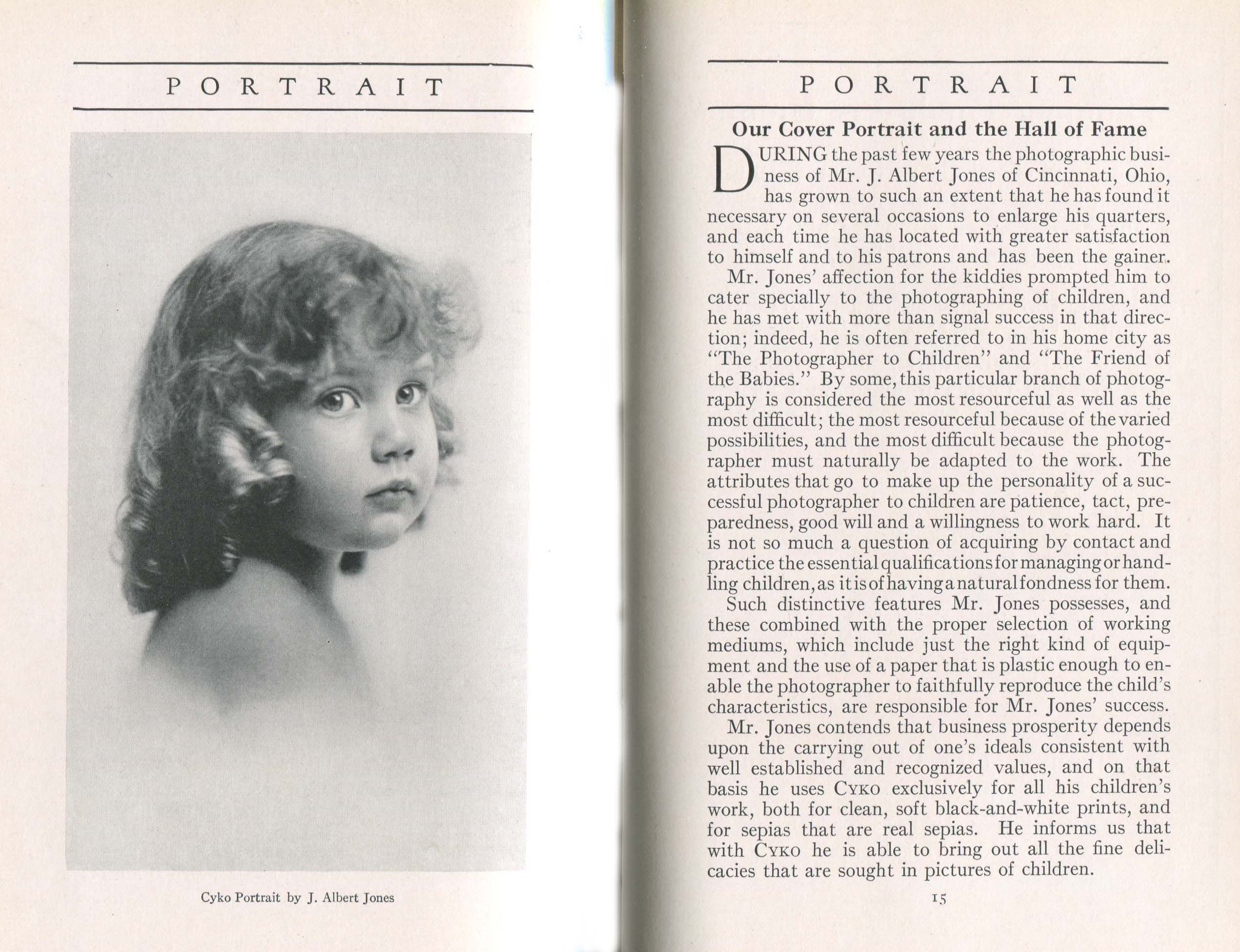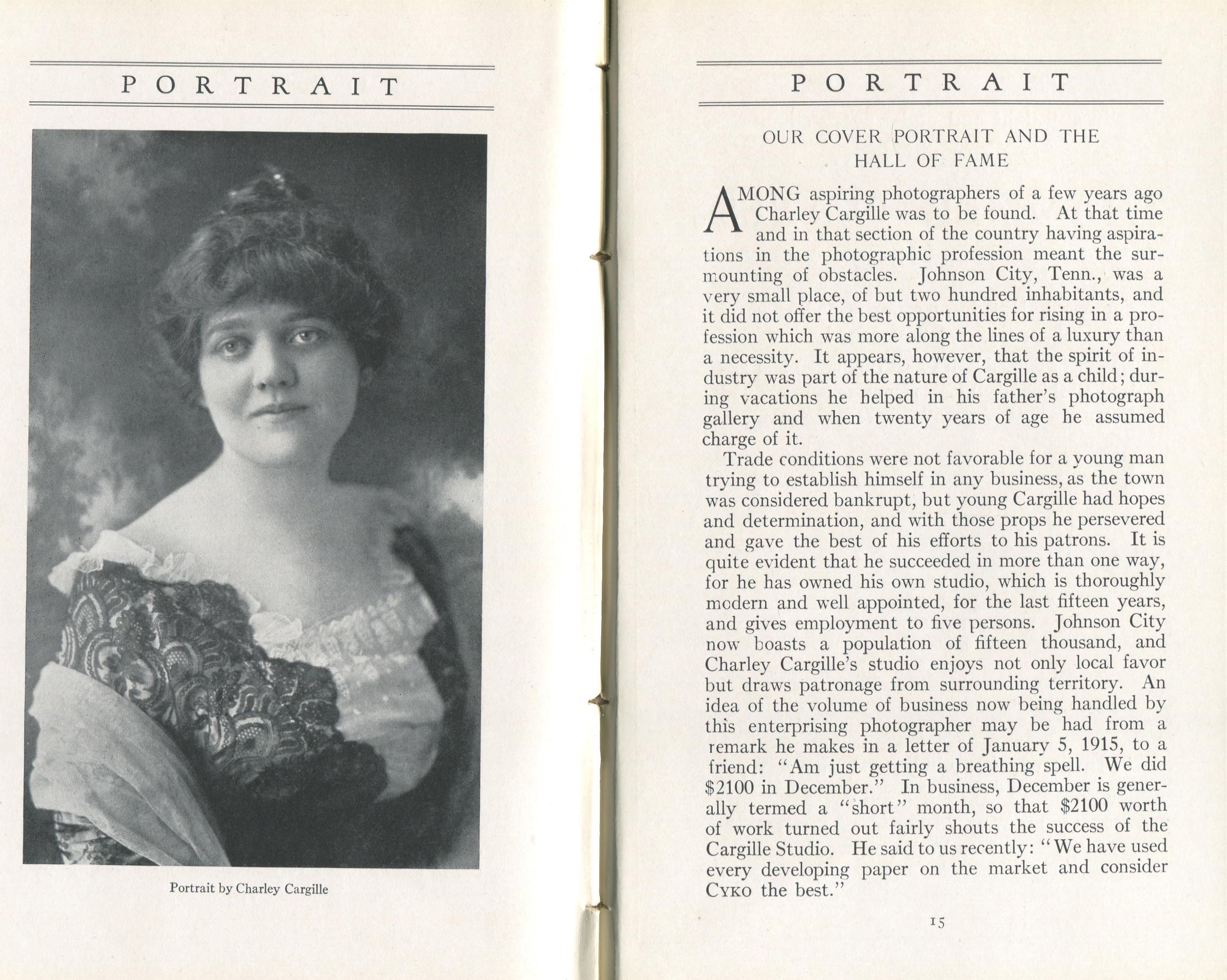 Portrait is also a good source for portraits of, and biographical information concerning, practitioners of `art-in-portraiture.' One hundred and forty-two photographers, including seventeen women, were honored with cover stories. (Since seven photographers had partners, the number of studios involved was 135.) Almost every issue featured a portrait of a U.S. or Canadian photographer on the cover, an appreciative profile, including the photographer's endorsement of ANSCO’s Cyko paper, and one or more examples of the photographer's work.