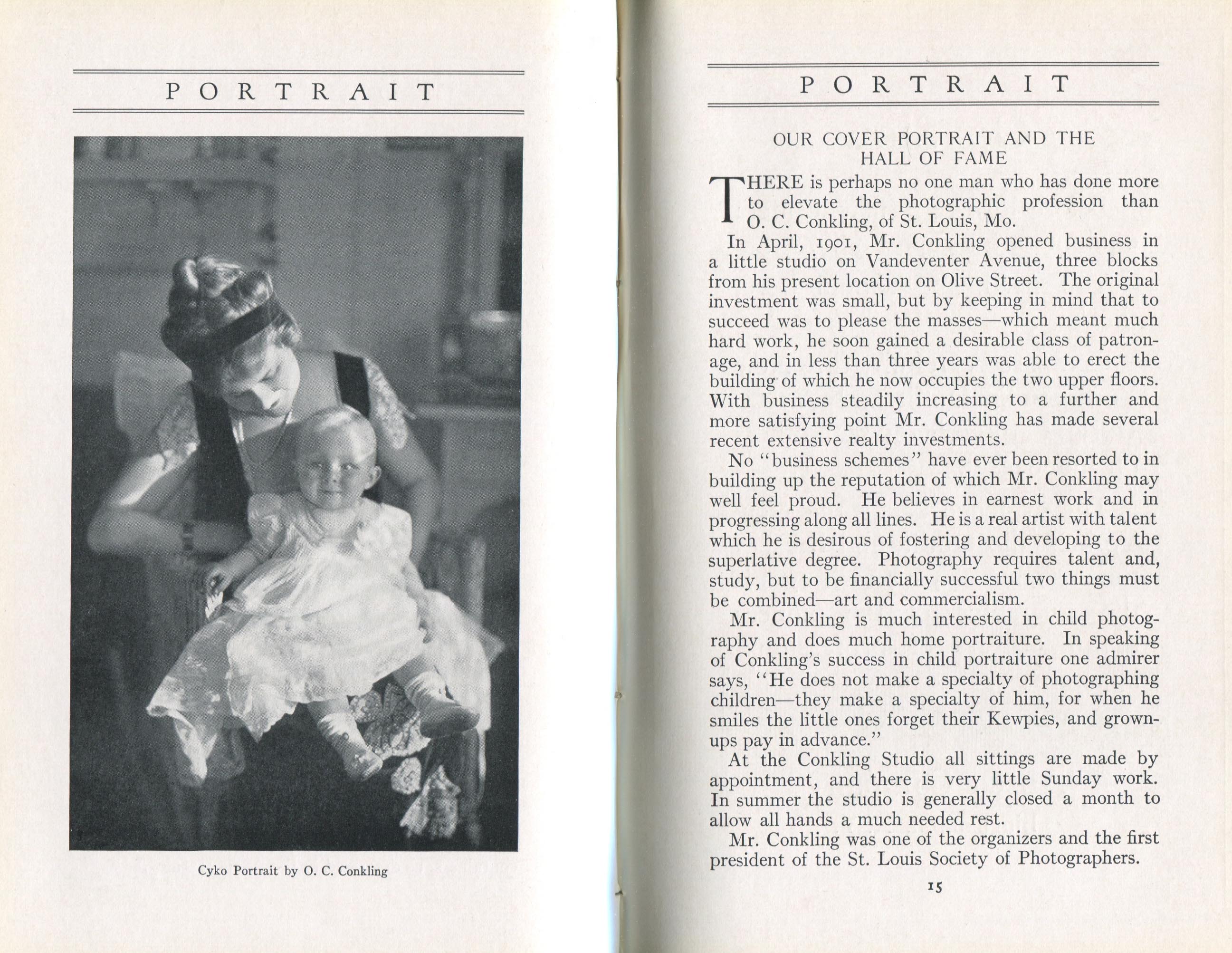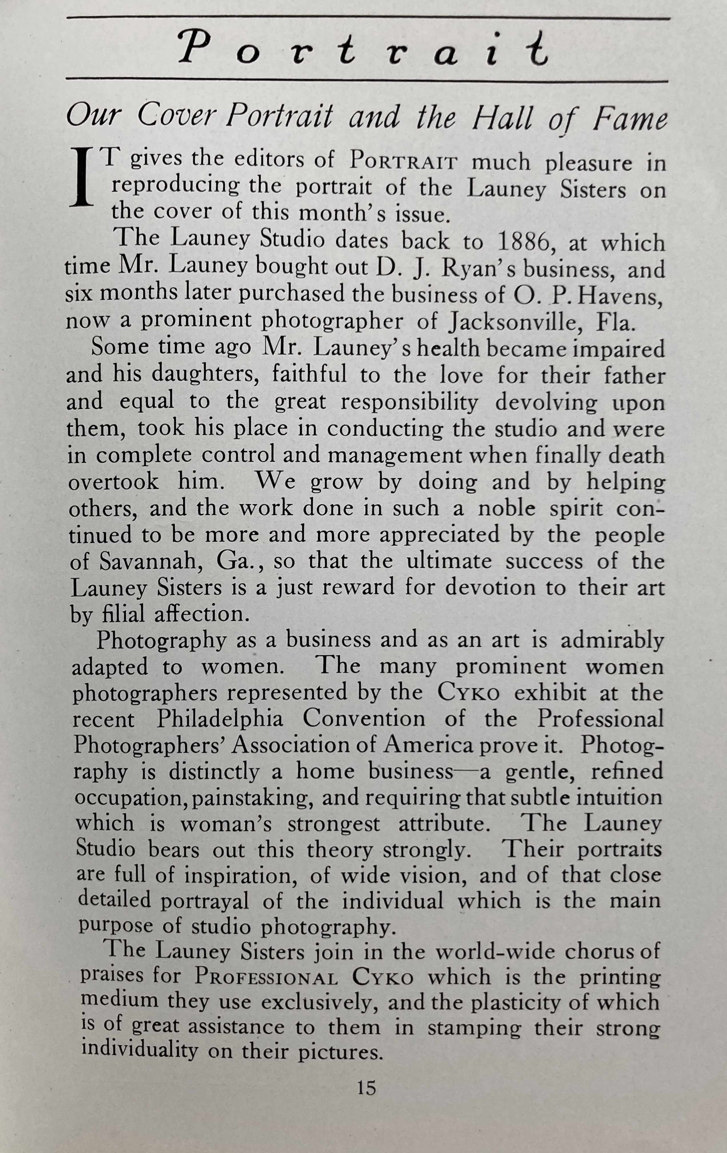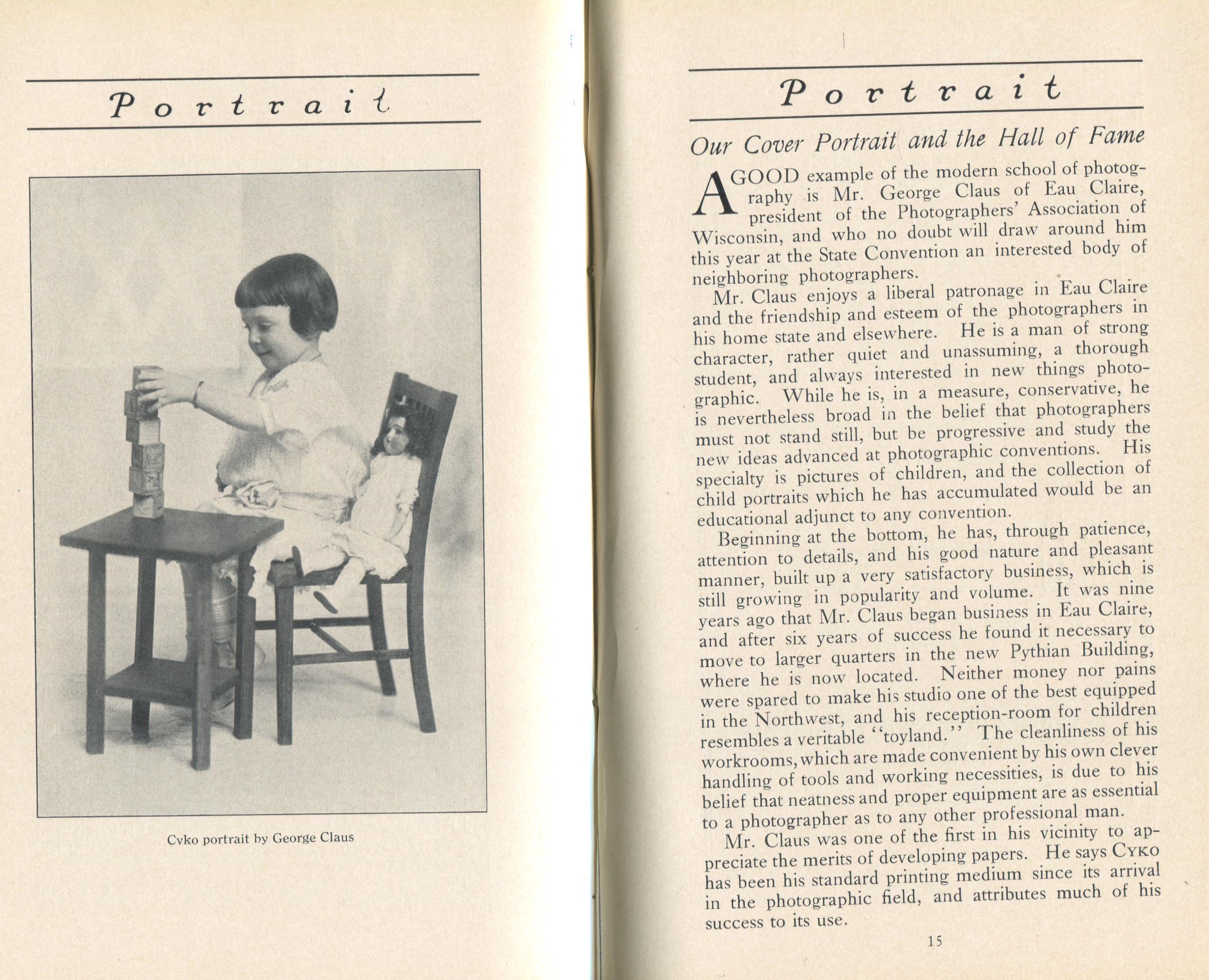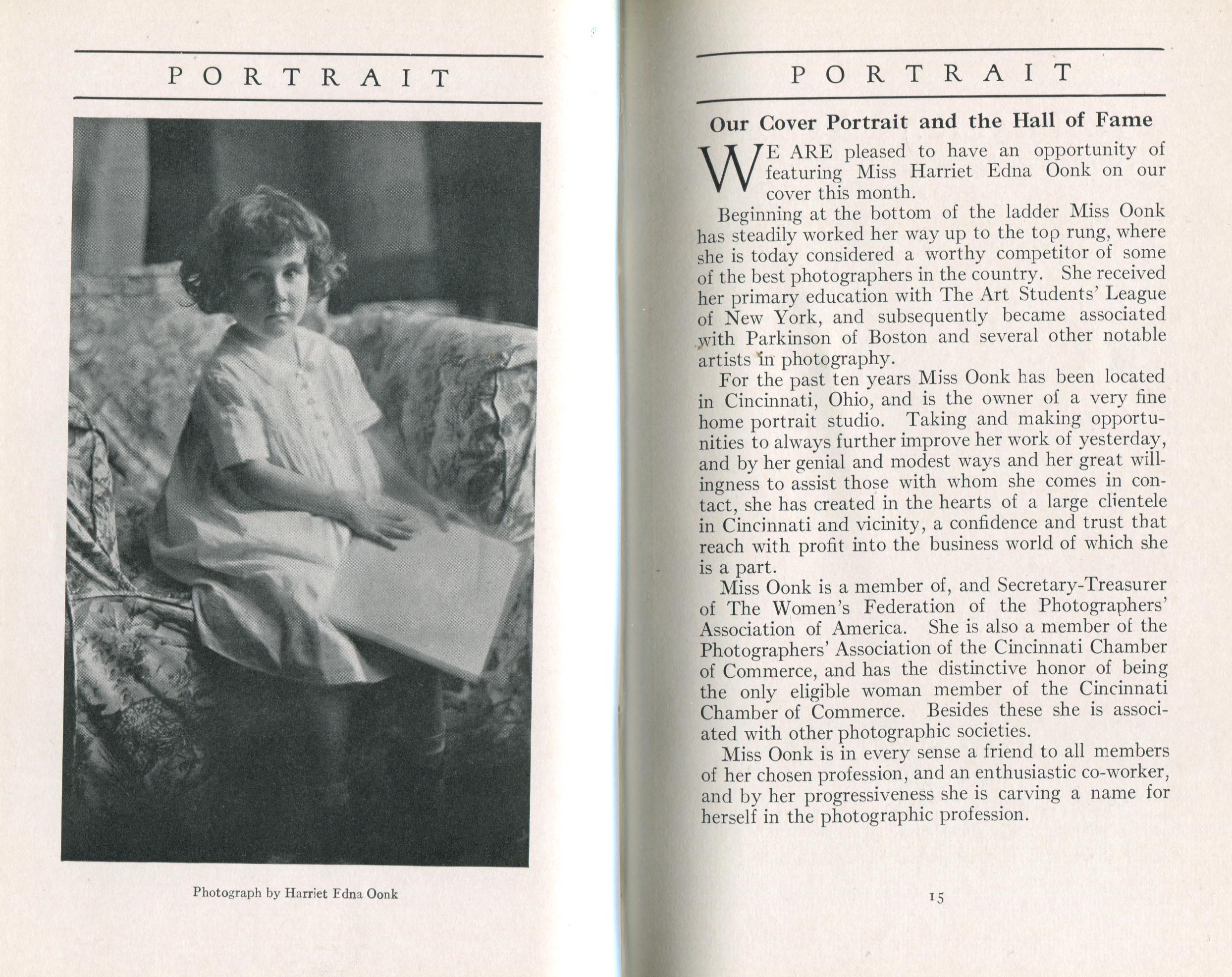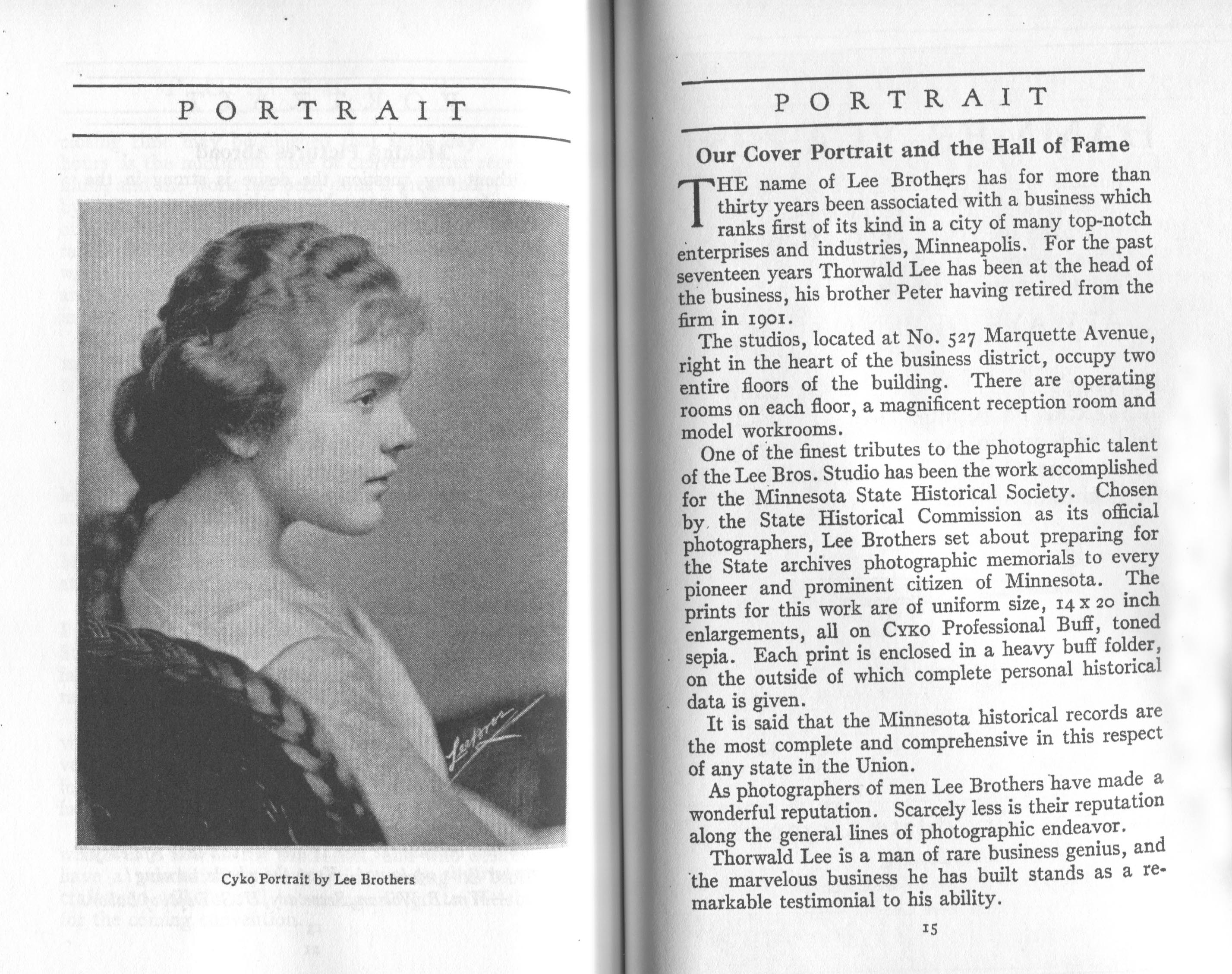 Portrait is also a good source for portraits of, and biographical information concerning, practitioners of `art-in-portraiture.' One hundred and forty-two photographers, including seventeen women, were honored with cover stories. (Since seven photographers had partners, the number of studios involved was 135.) Almost every issue featured a portrait of a U.S. or Canadian photographer on the cover, an appreciative profile, including the photographer's endorsement of ANSCO’s Cyko paper, and one or more examples of the photographer's work.