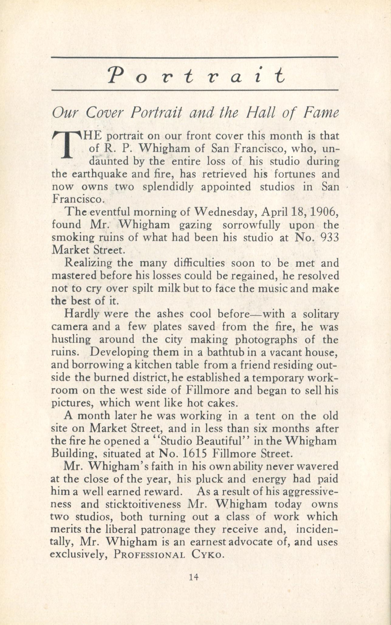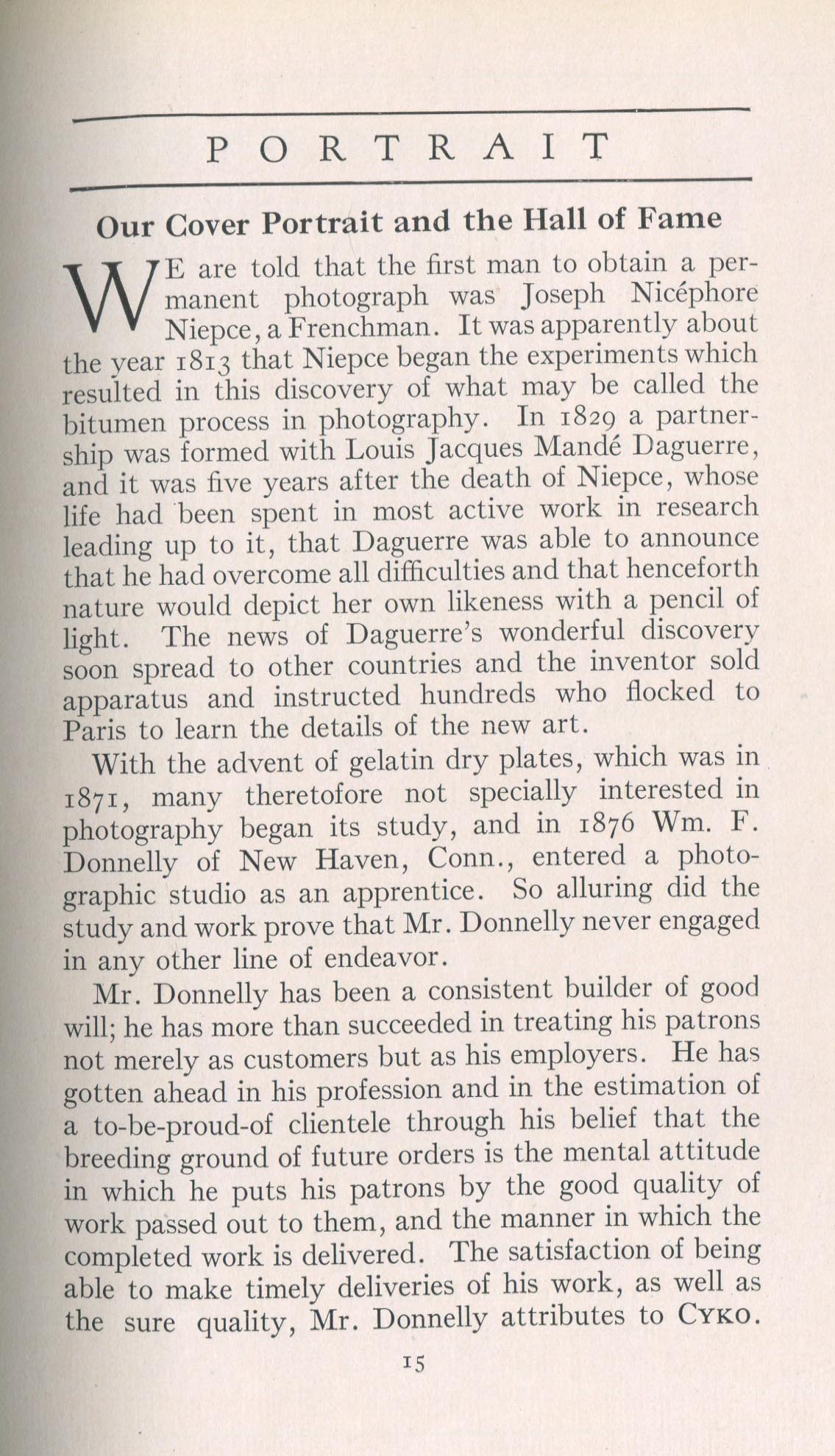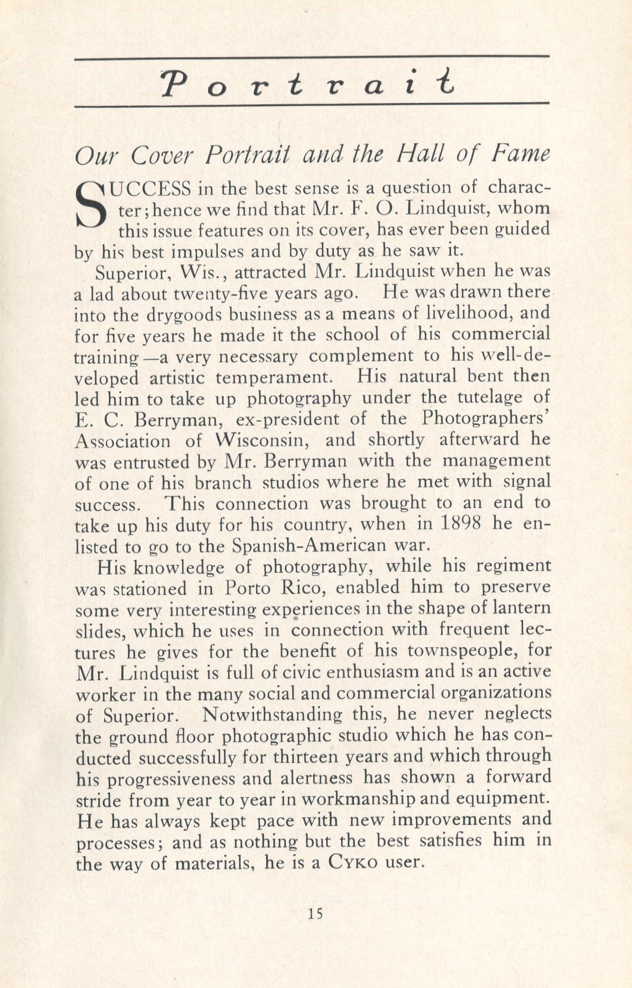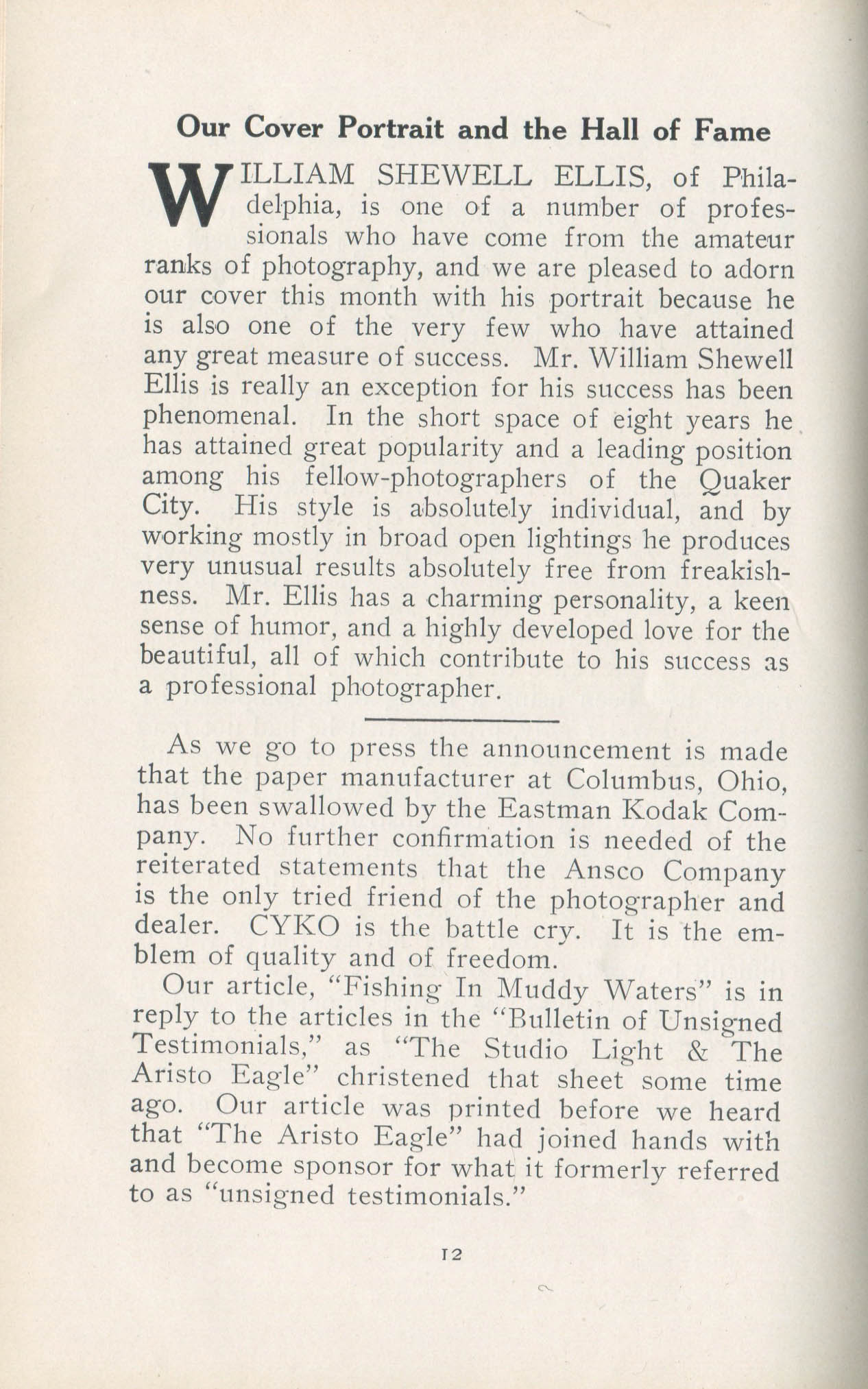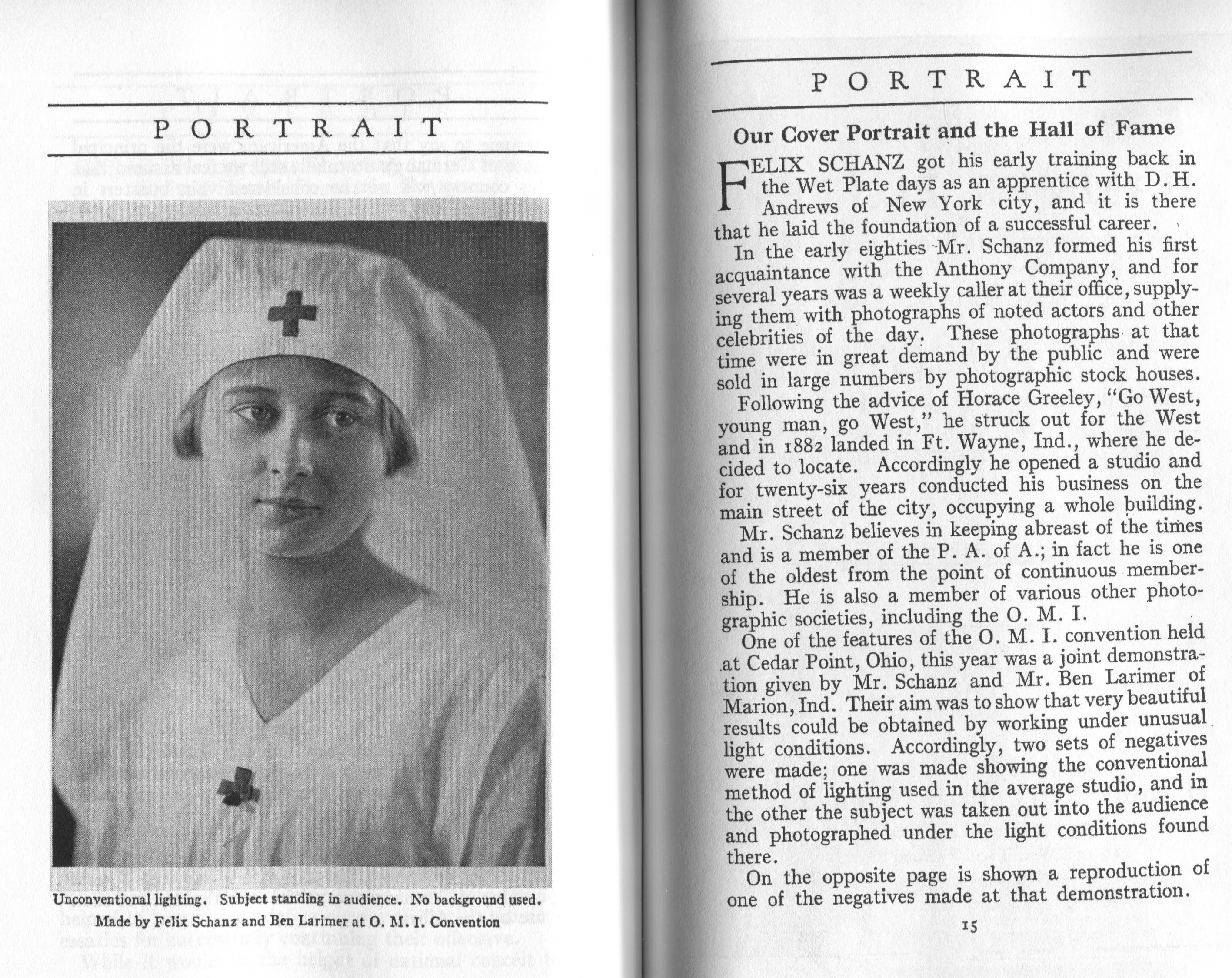 Portrait is also a good source for portraits of, and biographical information concerning, practitioners of `art-in-portraiture.' One hundred and forty-two photographers, including seventeen women, were honored with cover stories. (Since seven photographers had partners, the number of studios involved was 135.) Almost every issue featured a portrait of a U.S. or Canadian photographer on the cover, an appreciative profile, including the photographer's endorsement of ANSCO’s Cyko paper, and one or more examples of the photographer's work.