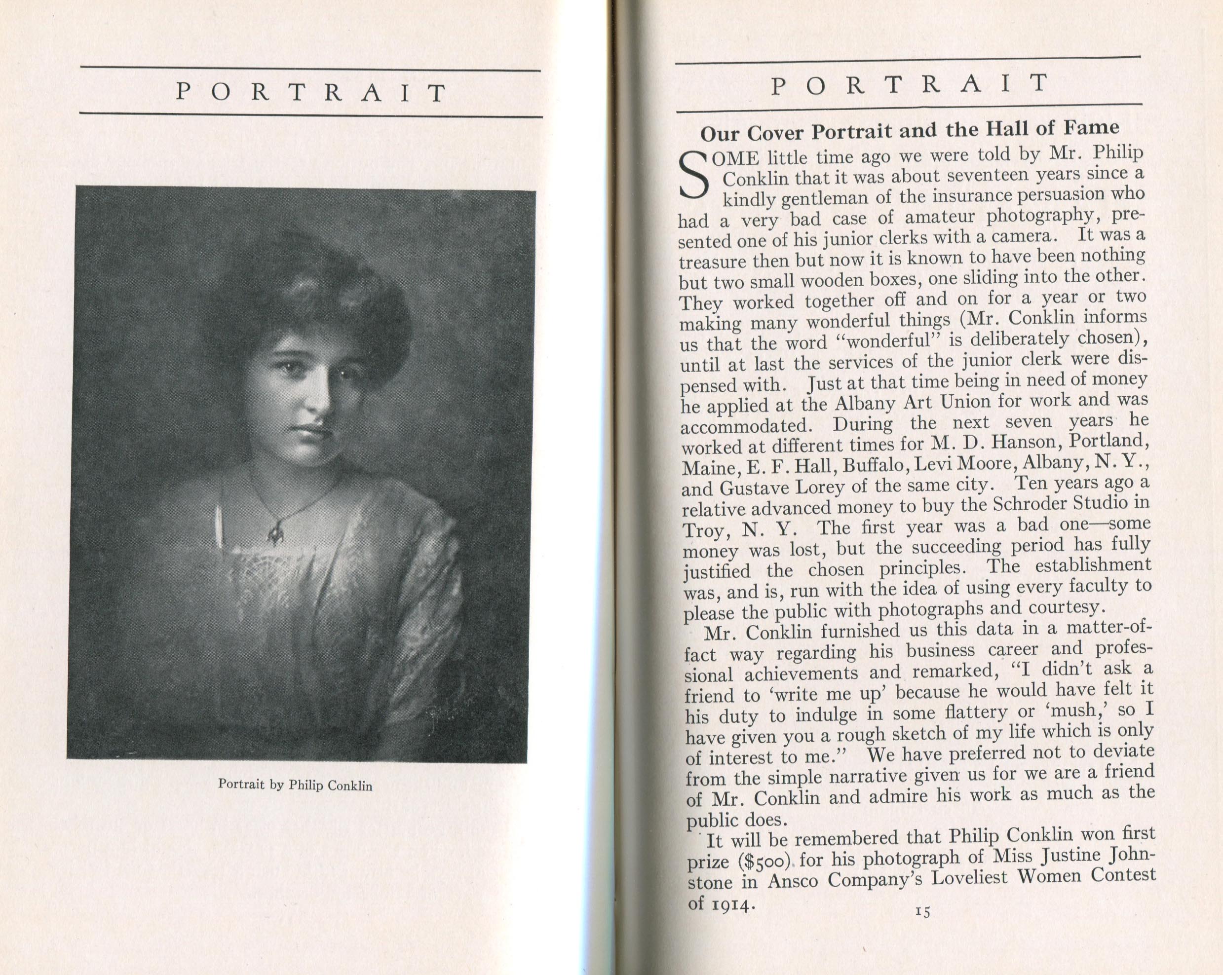 In addition to testimonials, Portrait promoted the use of Cyko paper through contests, notably the one announced in March 1914 called, "America's Fifty Loveliest Women Contest." To encourage women to pose, ANSCO offered posters and other promotional literature to photographers. Among the judges was Alfred Stieglitz. The winners were reported in the March 1915 issue; Philip Conklin of Troy, New York, received the first prize. One of the few prize winners whose name is familiar today was E.O. Hoppé, who won three lesser prizes.