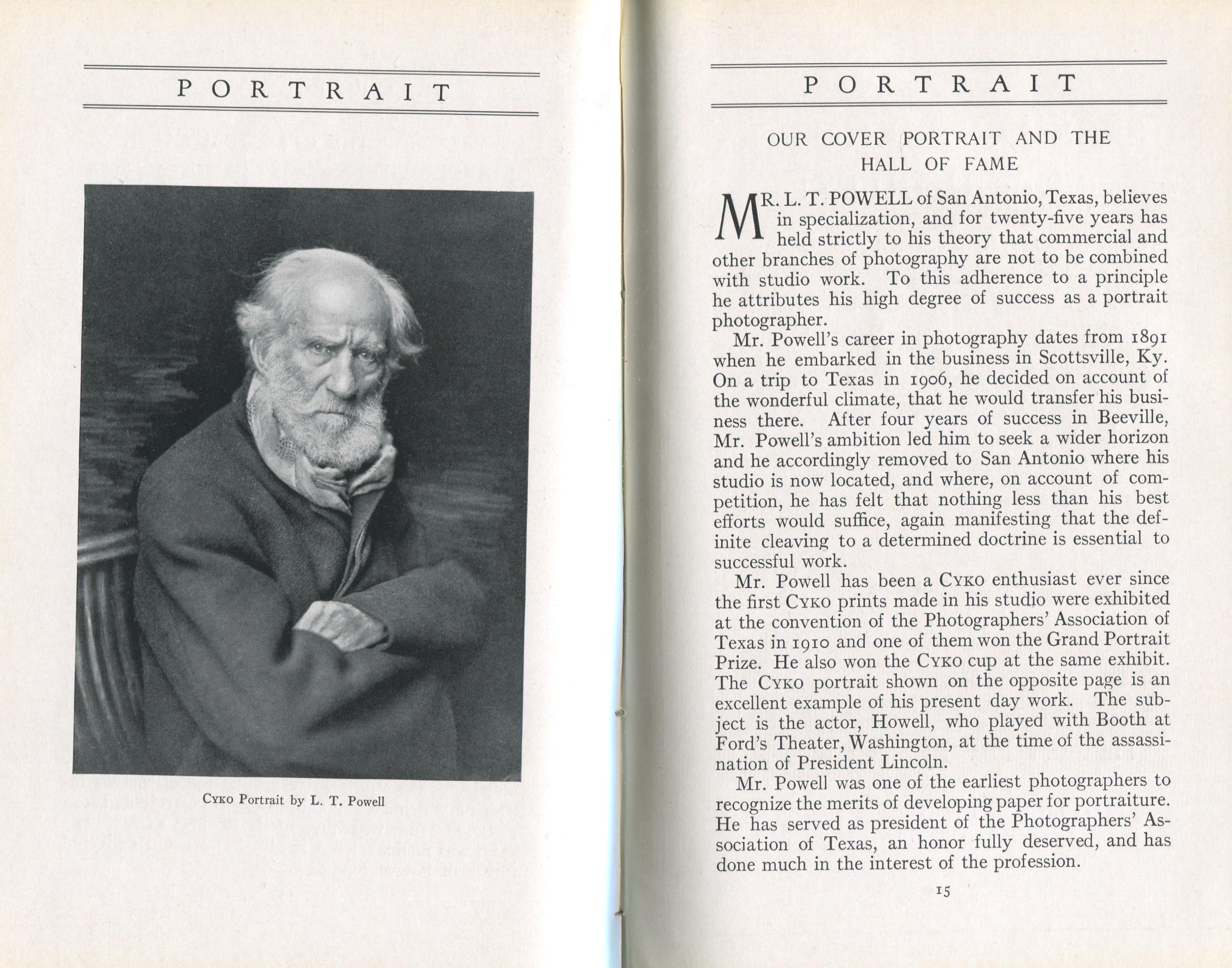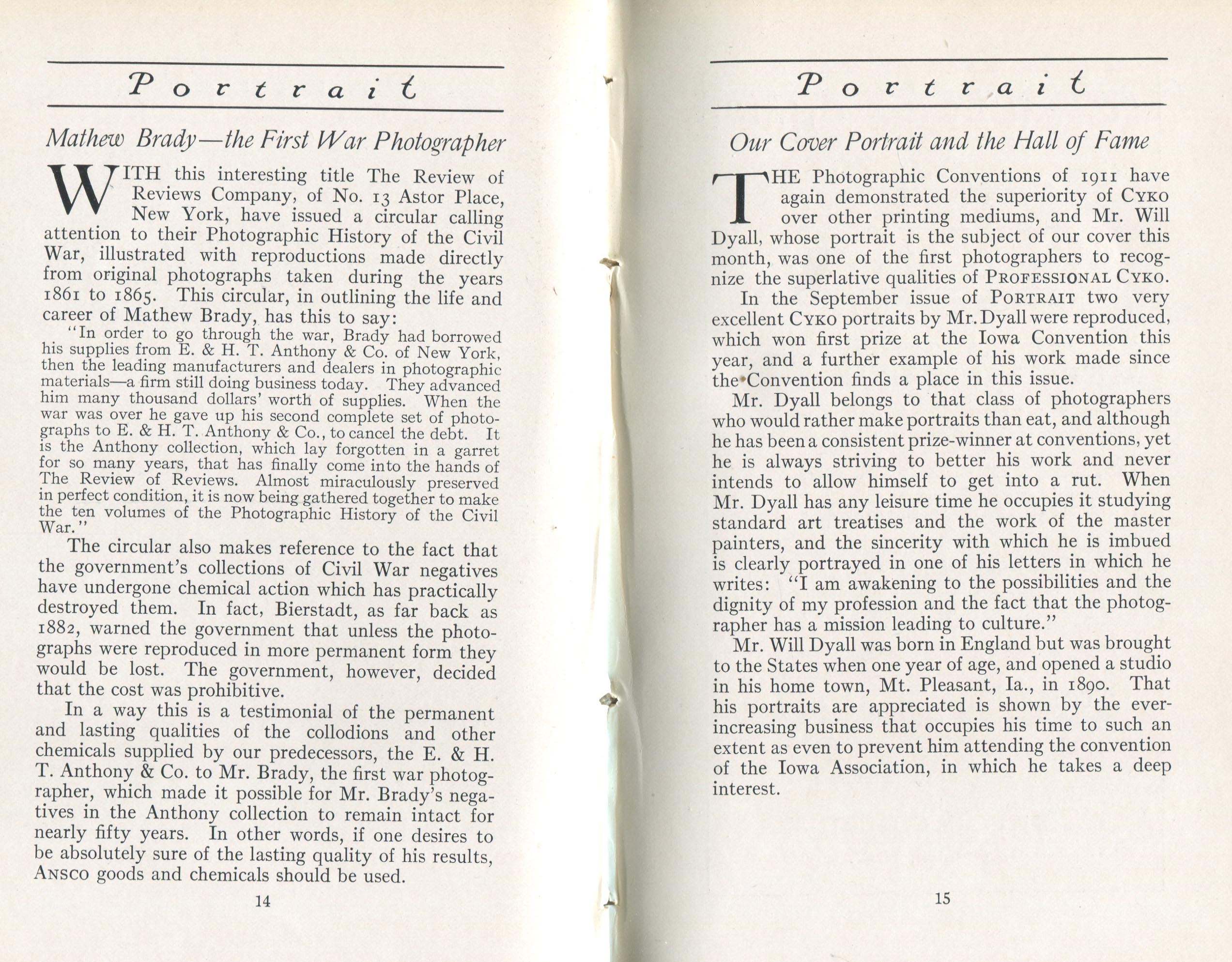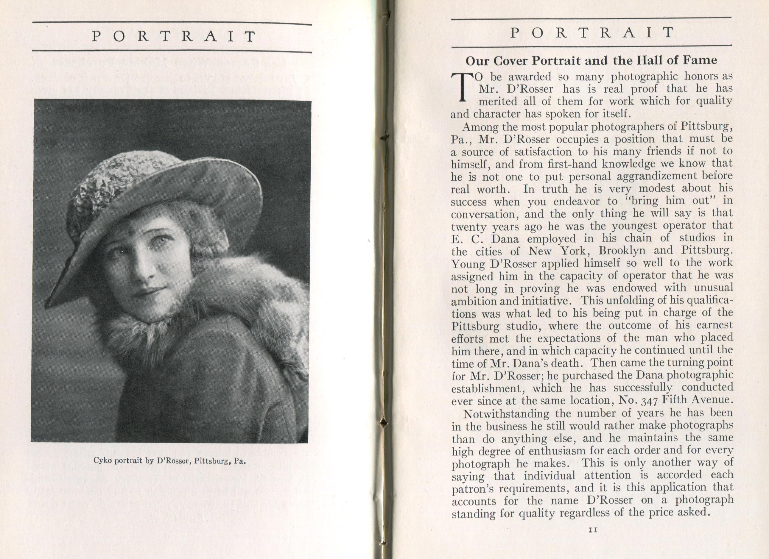 According to its masthead, Portrait, a monthly journal published by the ANSCO Company in Binghamton, New York, from 1909 to 1921, was "a magazine devoted to art-in-portraiture, also profit-in-photography and committed to a `square deal.'" Portrait coincided with the golden age of commercial portraiture, when the influence of amateur art photography combined with market demand to encourage the development of studios where individuals could obtain portraits that went well beyond mere likenesses. In keeping with the artistic aspirations of these photographers, such portraits were printed using controlled processes such as gum bichromate or on commercially available papers, such as ANSCO’s Cyko, for which several variants, including a `linen' surface, was available. Cyko, especially when toned, could resemble gum or platinum prints and was much faster to process.