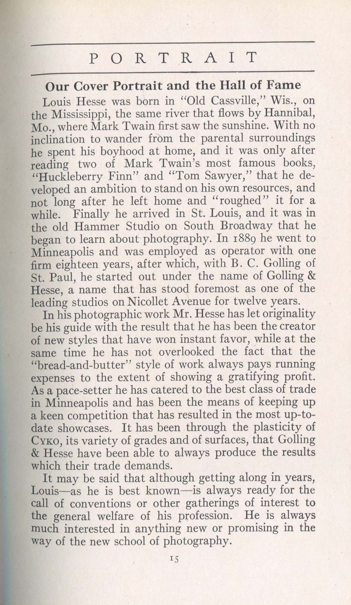 Hesse, Louis. Minneapolis MN – September 1917 Cover Profile