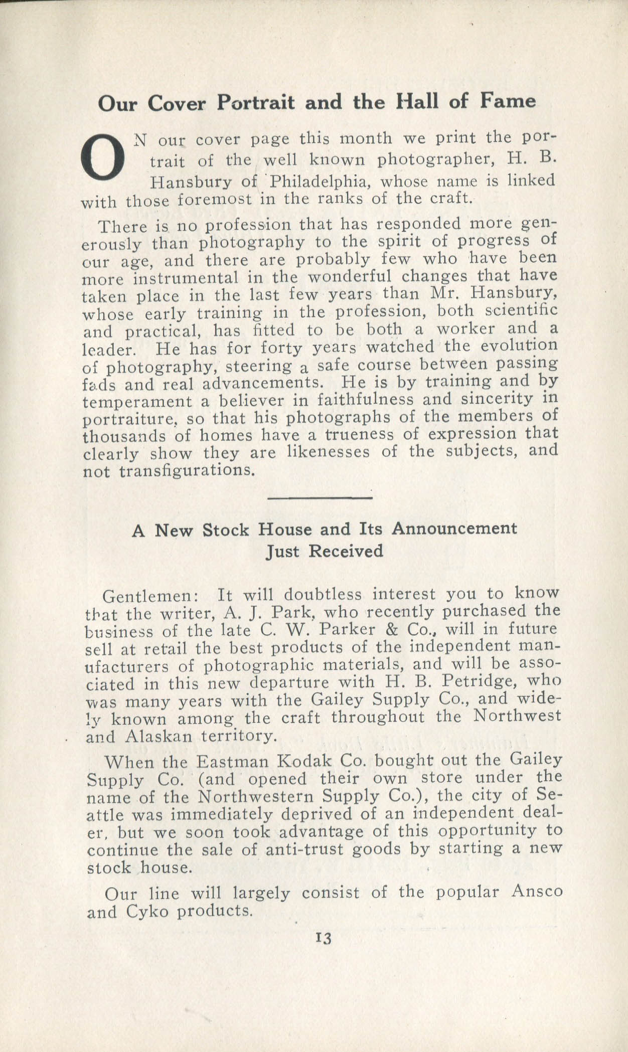 Although the journal's obvious purpose was to promote the use of ANSCO products, in particular Cyko paper, it also published articles containing news and advice. News features concerned such topics as advances in artificial lighting, the erection of the Hannibal Goodwin monument, and recruitment of photographers for service in World War I. Schedules for, and reports on, professional photographers' conventions were also provided regularly. Published photographs of photographic supply stores and advertisements for a variety of products provide additional historically useful information.