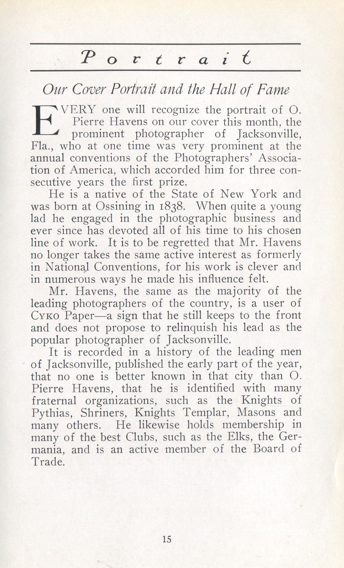 Havens, O. Pierre. Jacksonville FL – February 1911 Cover Profile
