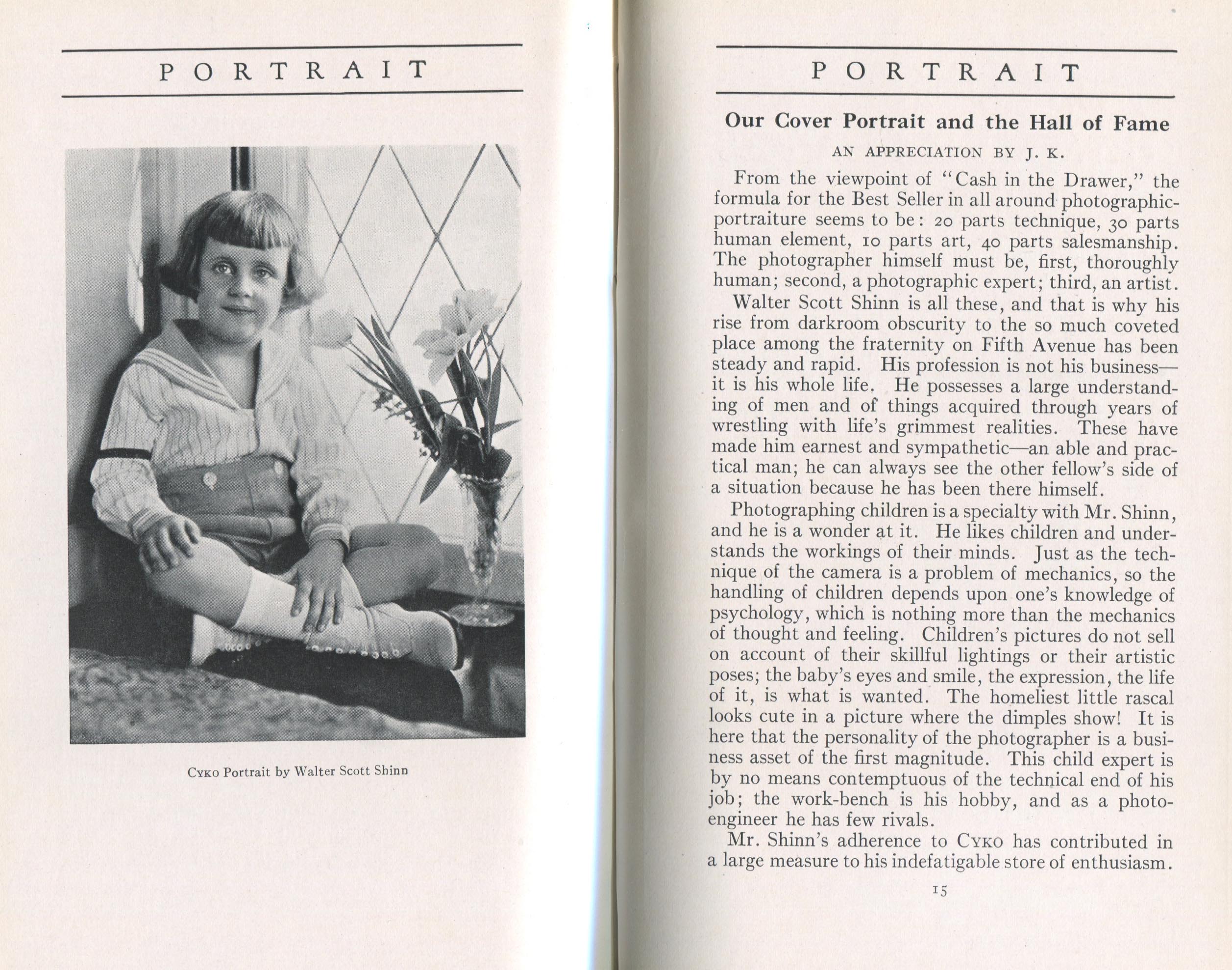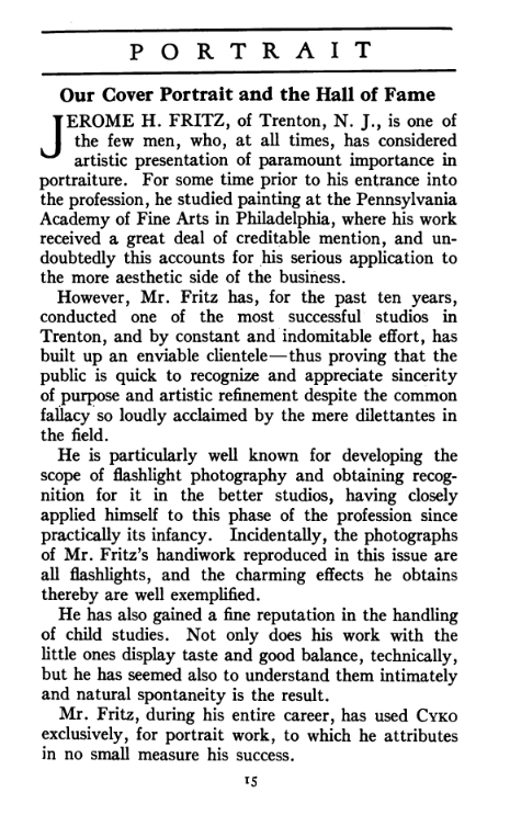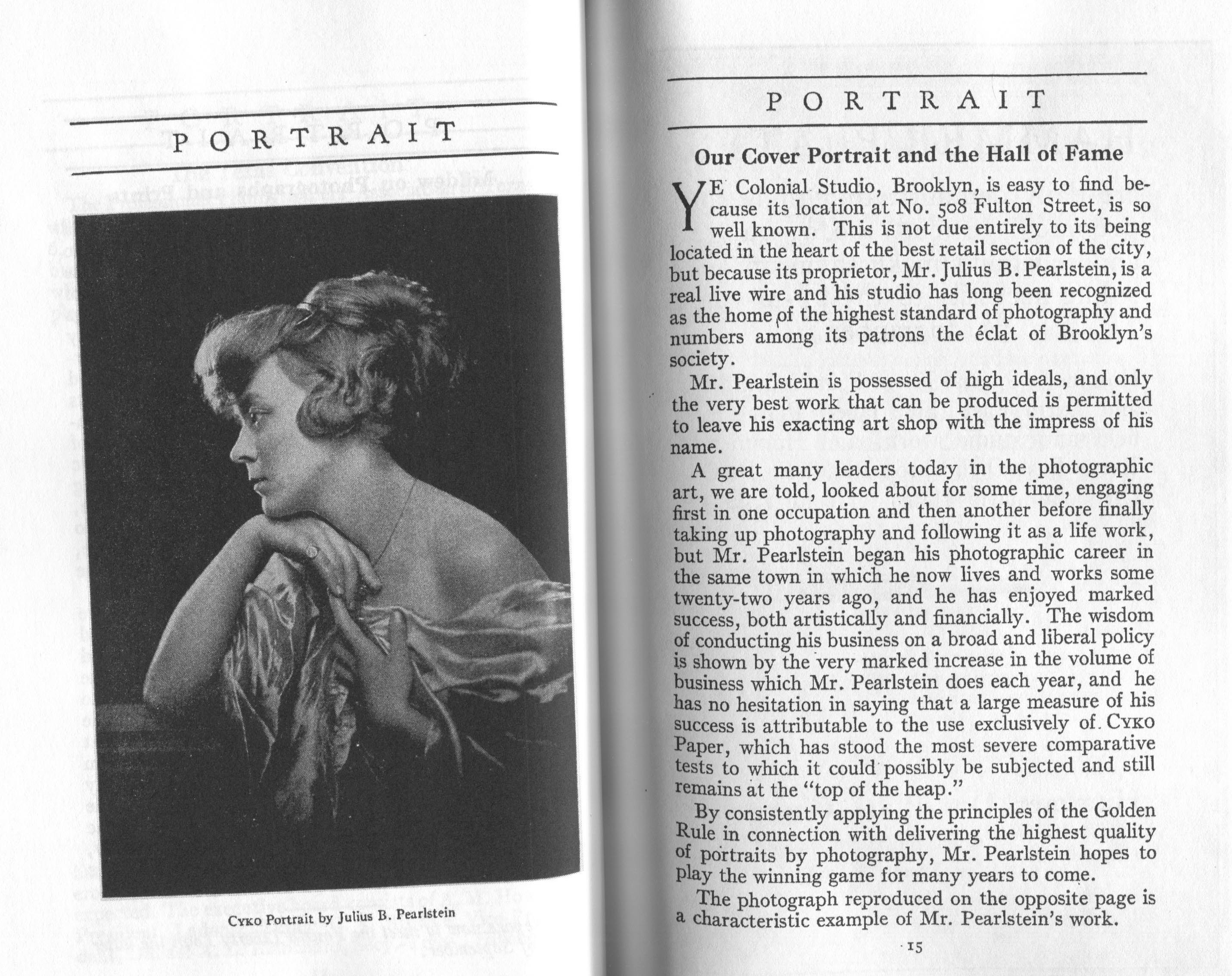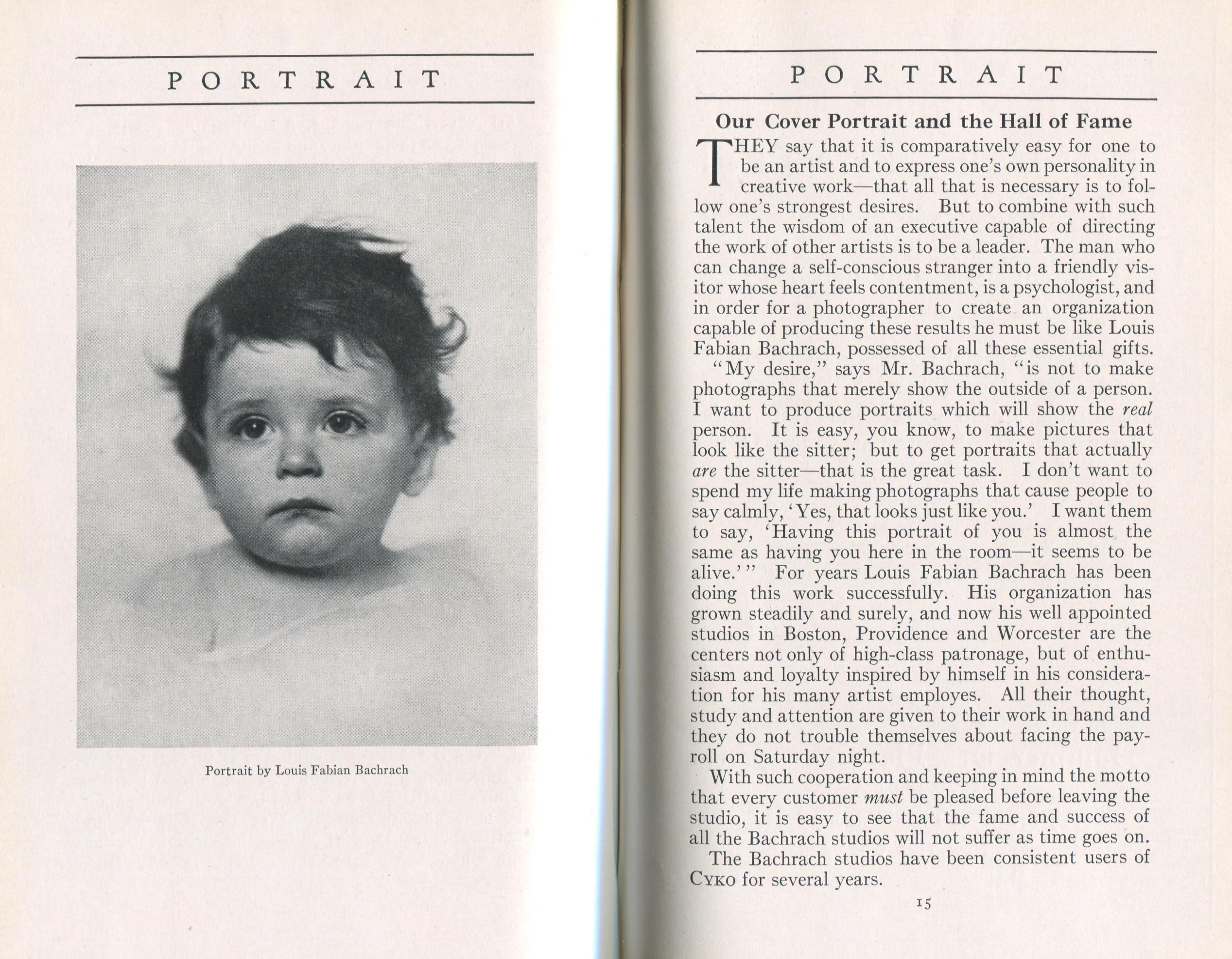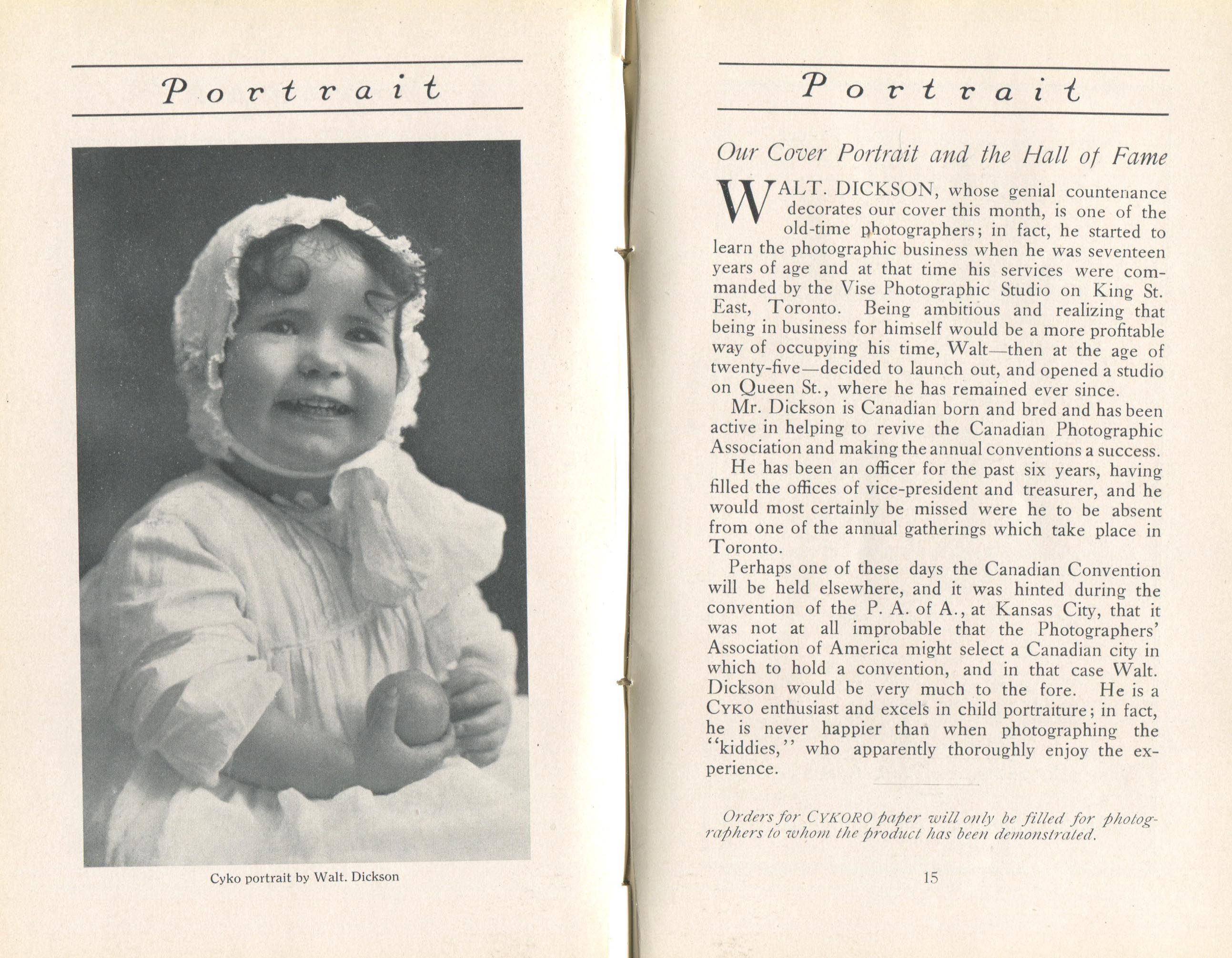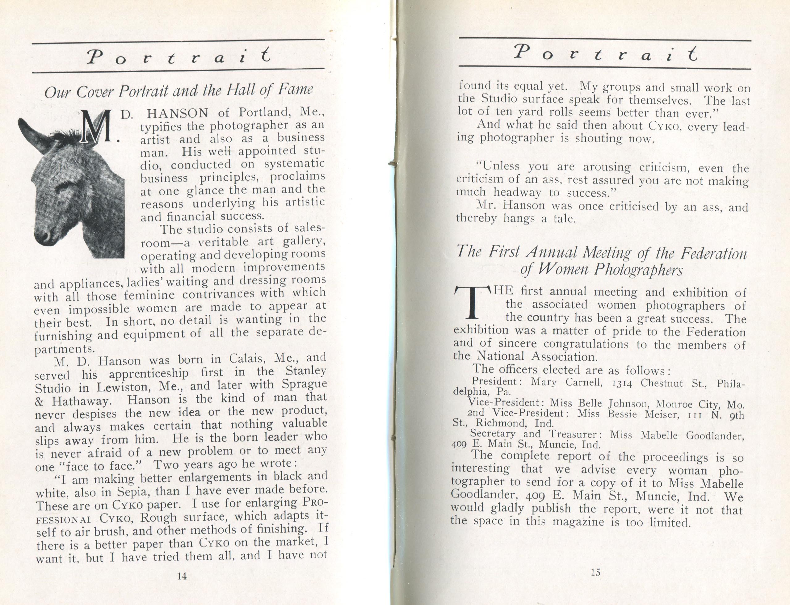 Portrait is also a good source for portraits of, and biographical information concerning, practitioners of `art-in-portraiture.' One hundred and forty-two photographers, including seventeen women, were honored with cover stories. (Since seven photographers had partners, the number of studios involved was 135.) Almost every issue featured a portrait of a U.S. or Canadian photographer on the cover, an appreciative profile, including the photographer's endorsement of ANSCO’s Cyko paper, and one or more examples of the photographer's work.