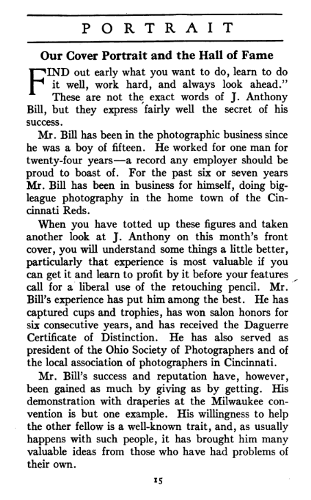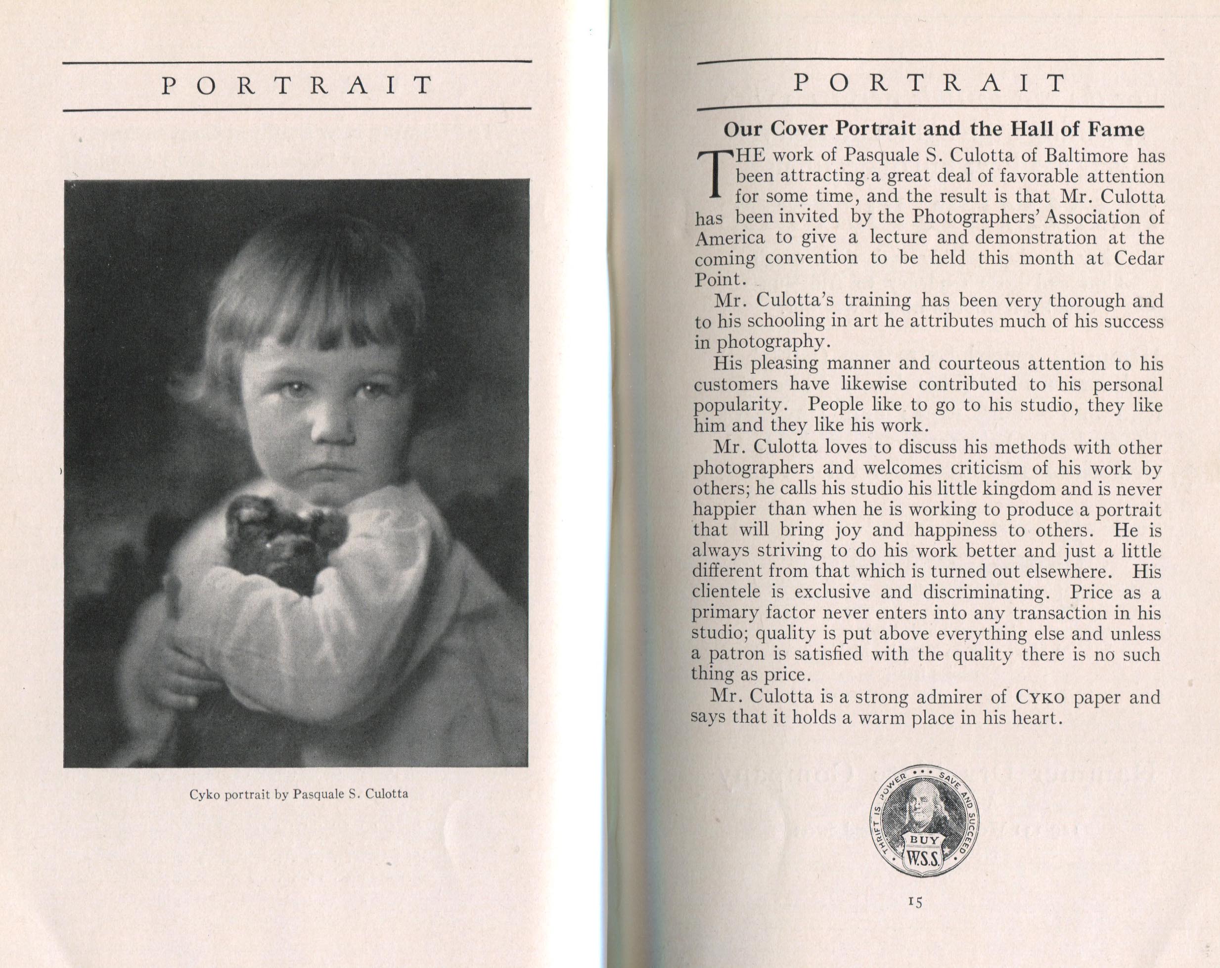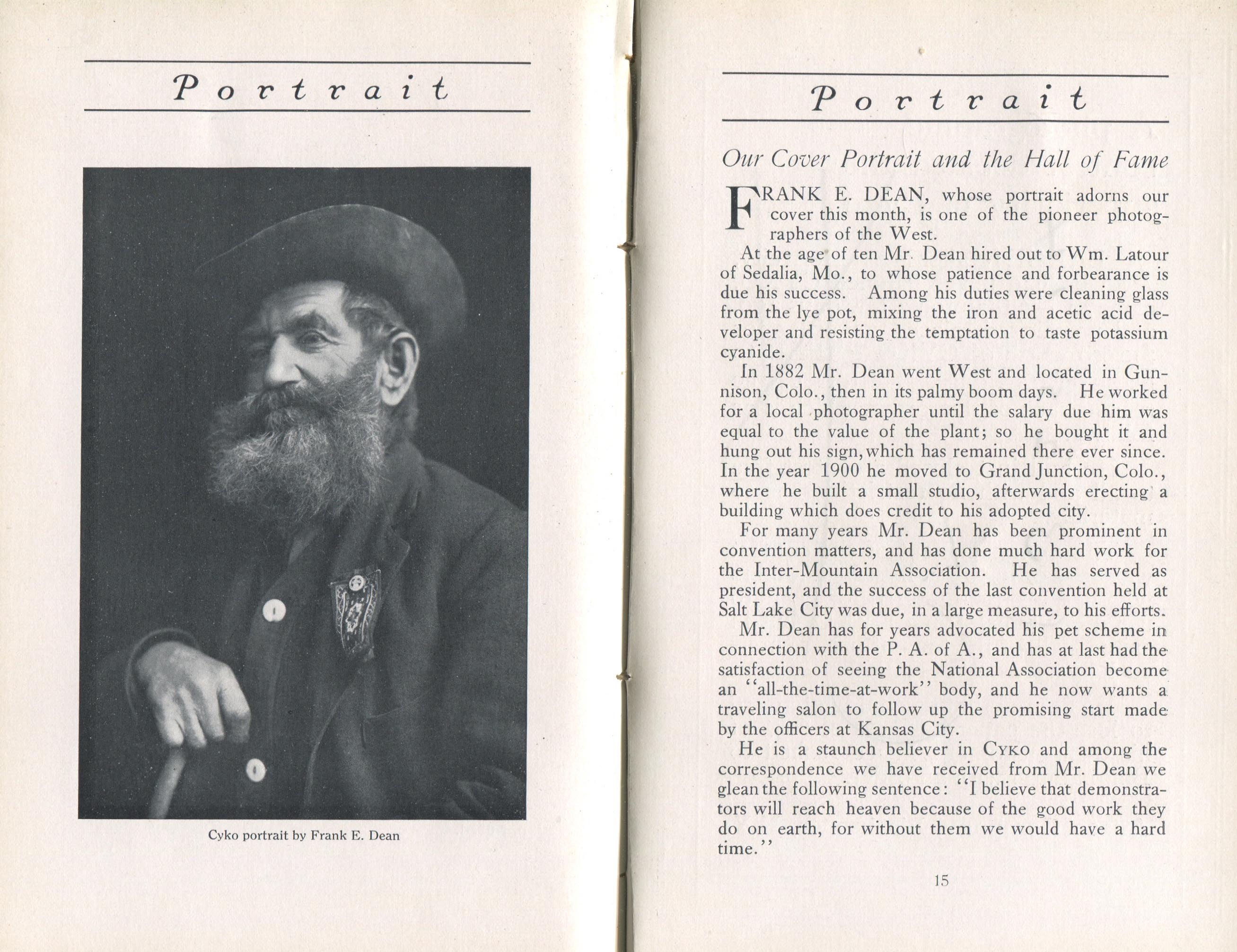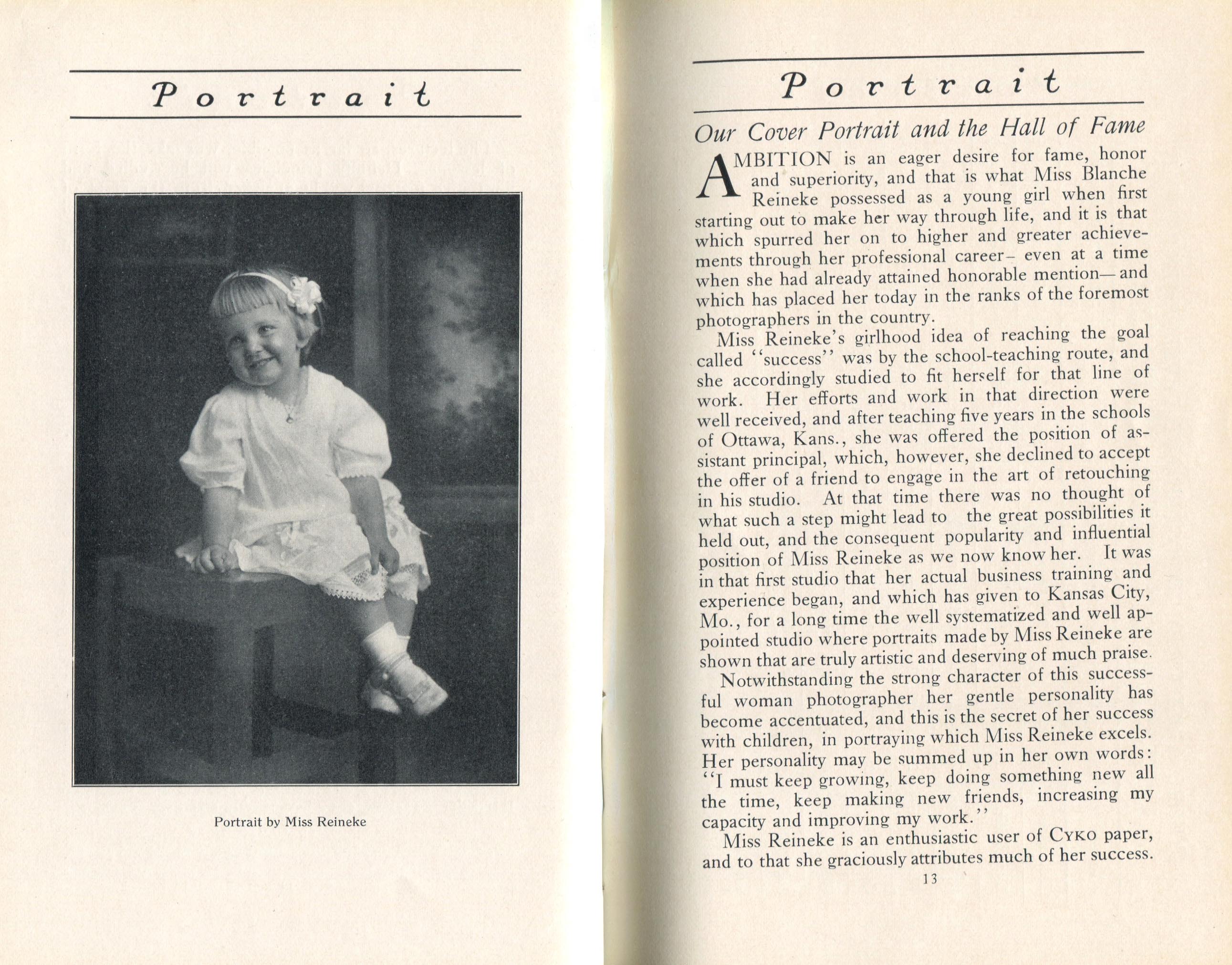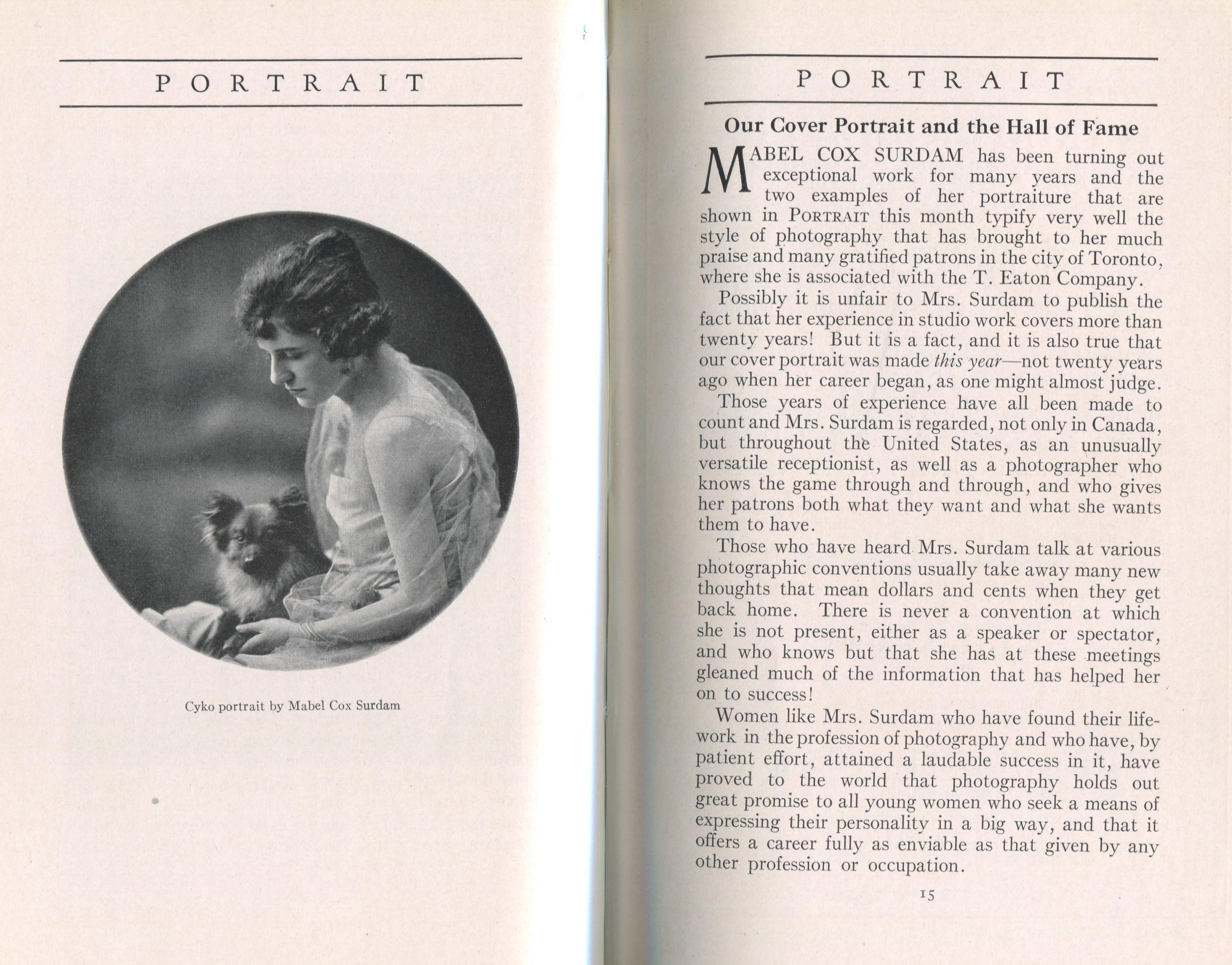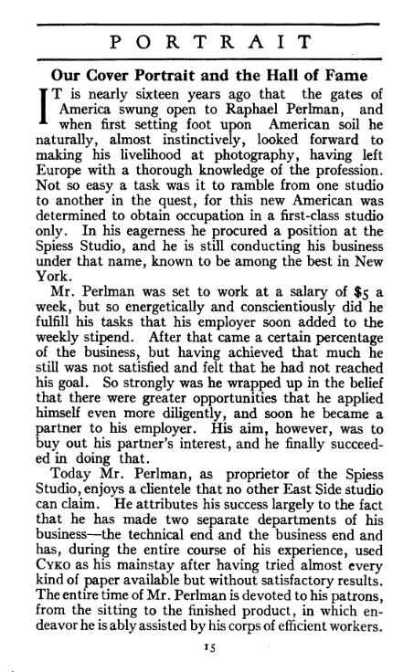 Portrait is also a good source for portraits of, and biographical information concerning, practitioners of `art-in-portraiture.' One hundred and forty-two photographers, including seventeen women, were honored with cover stories. (Since seven photographers had partners, the number of studios involved was 135.) Almost every issue featured a portrait of a U.S. or Canadian photographer on the cover, an appreciative profile, including the photographer's endorsement of ANSCO’s Cyko paper, and one or more examples of the photographer's work.