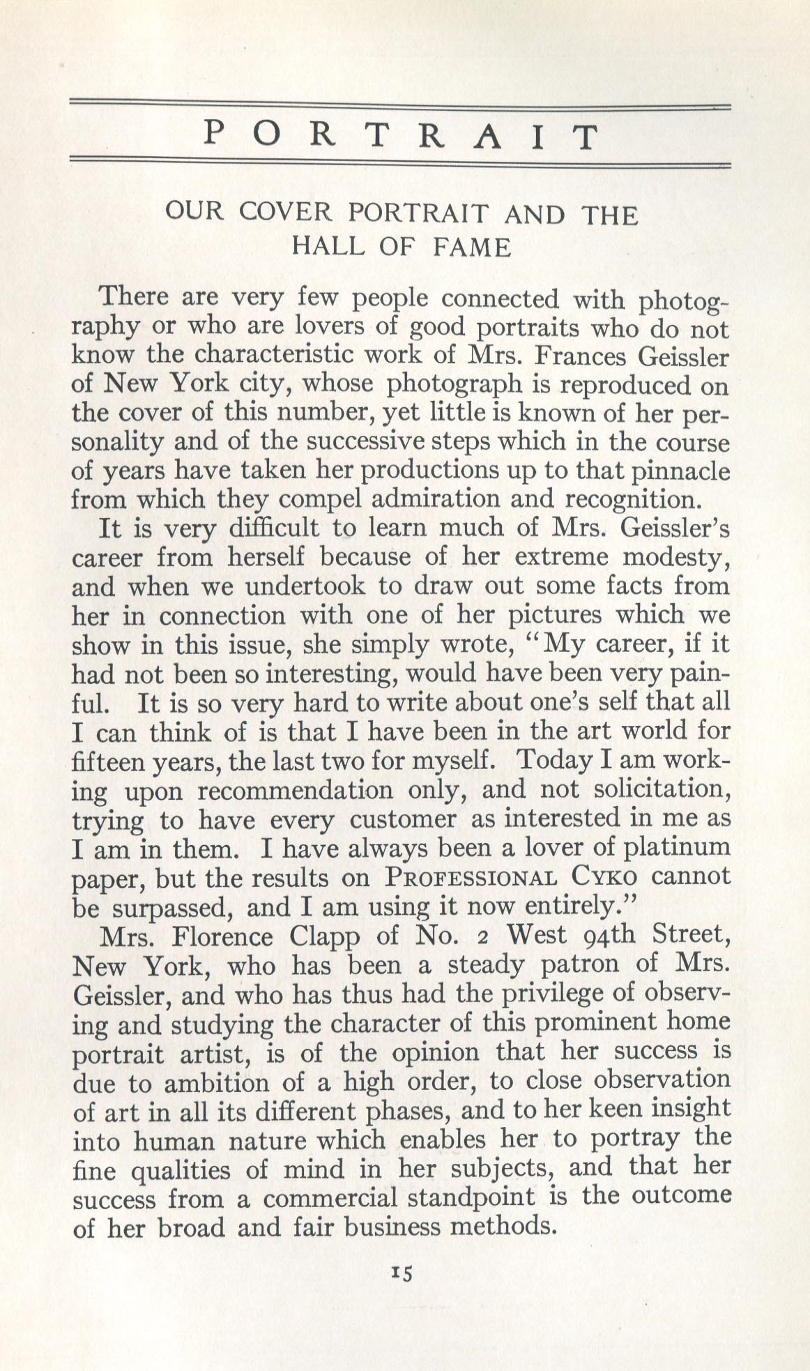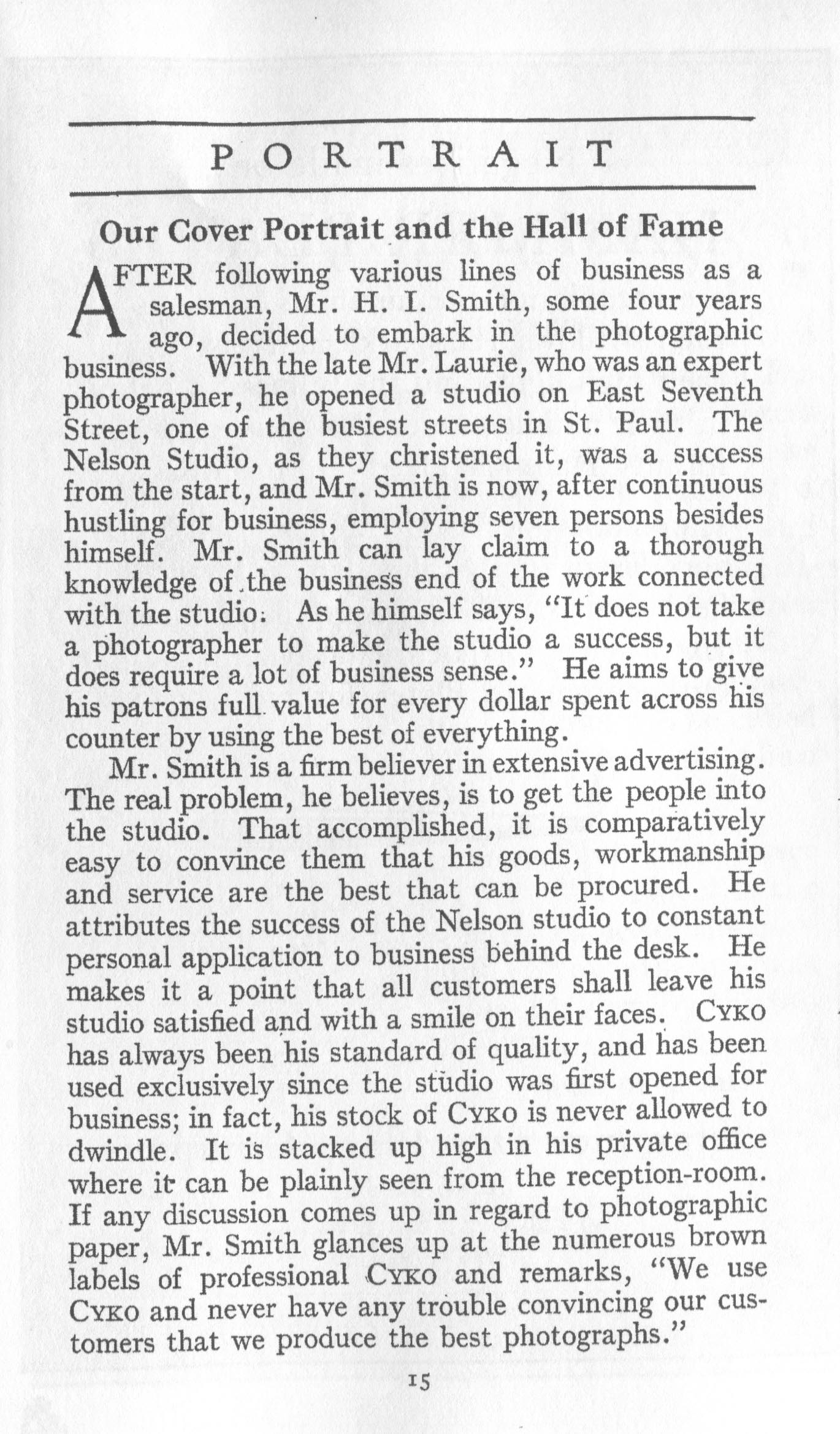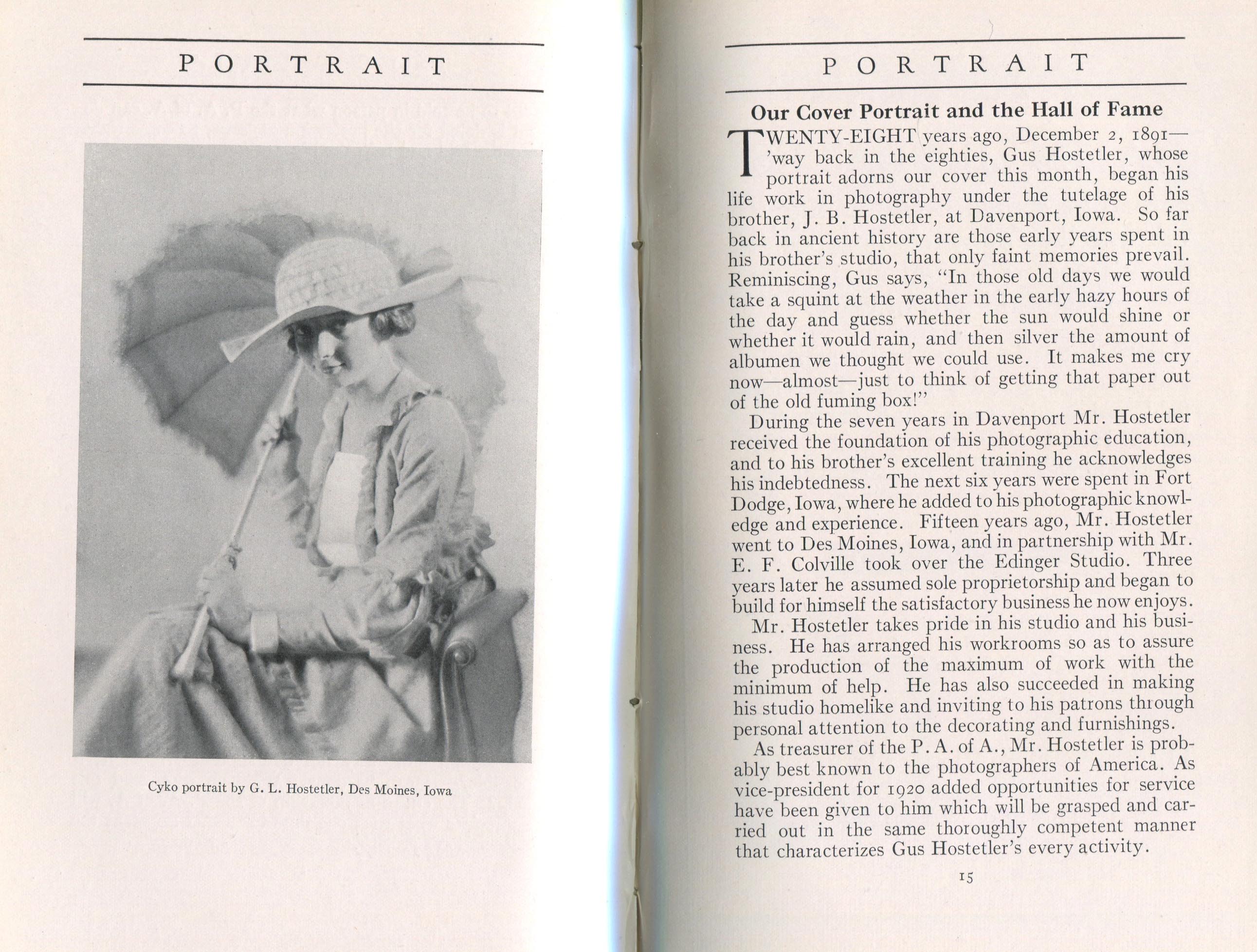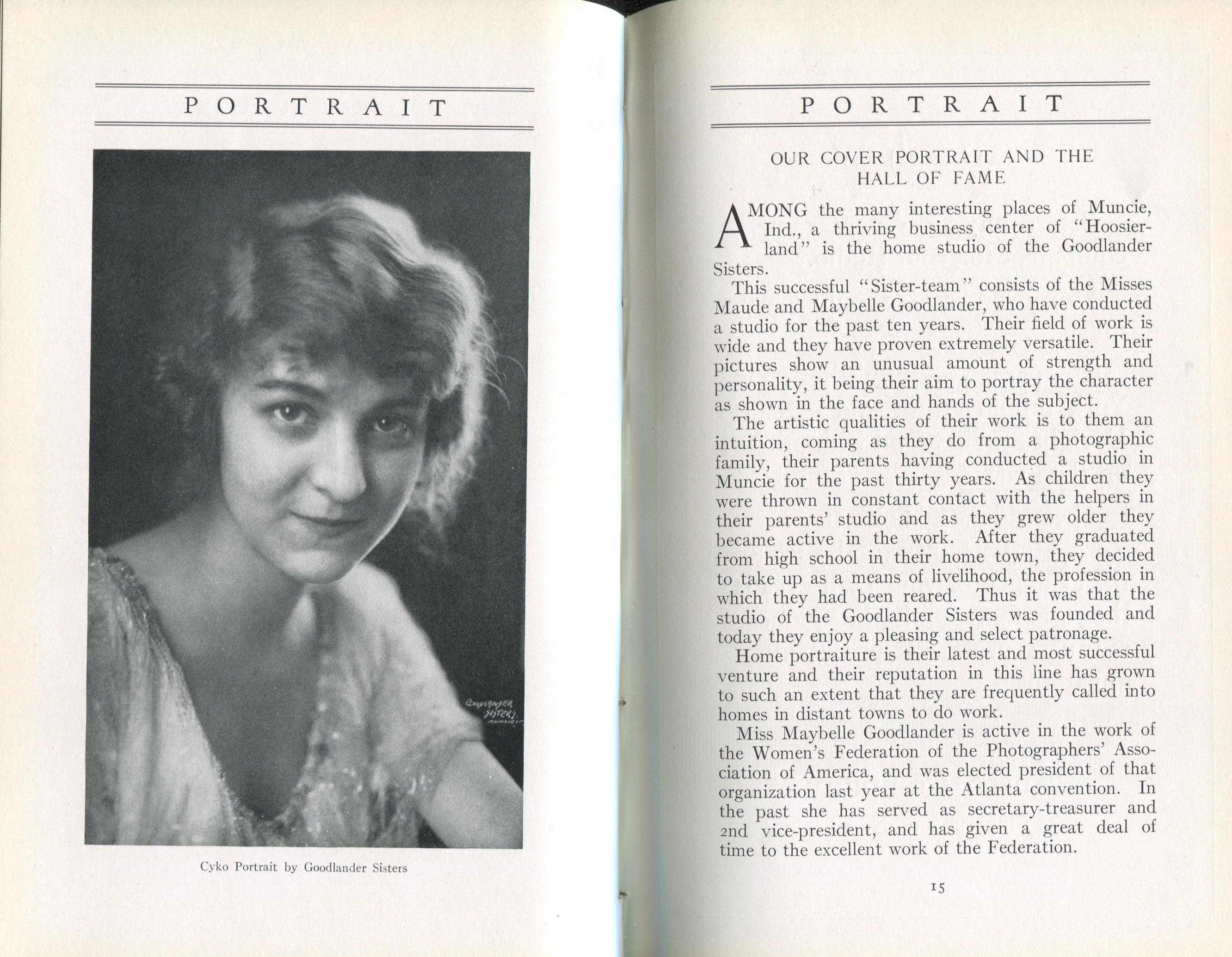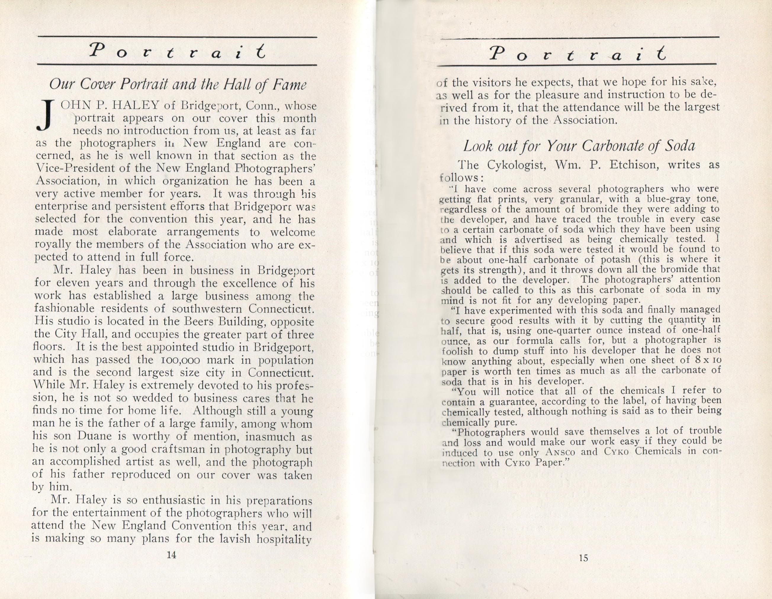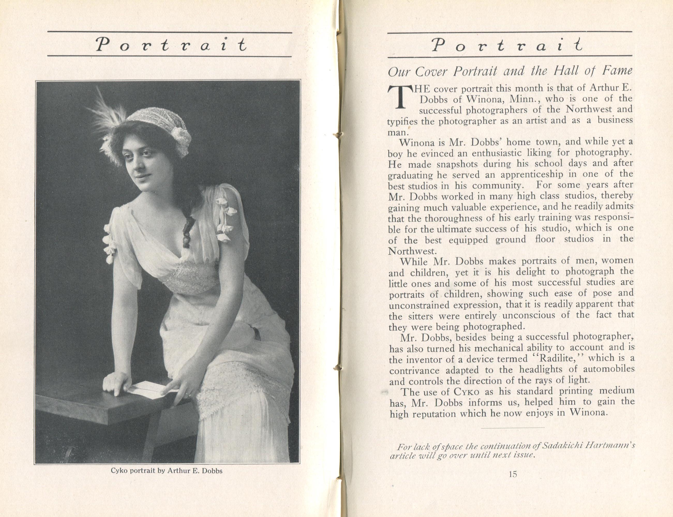 Portrait is also a good source for portraits of, and biographical information concerning, practitioners of `art-in-portraiture.' One hundred and forty-two photographers, including seventeen women, were honored with cover stories. (Since seven photographers had partners, the number of studios involved was 135.) Almost every issue featured a portrait of a U.S. or Canadian photographer on the cover, an appreciative profile, including the photographer's endorsement of ANSCO’s Cyko paper, and one or more examples of the photographer's work.