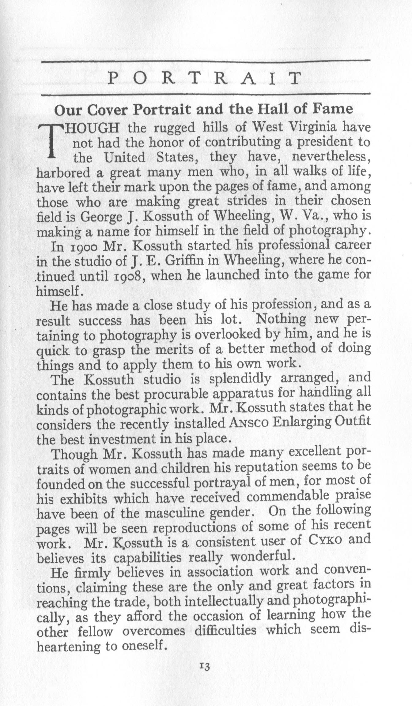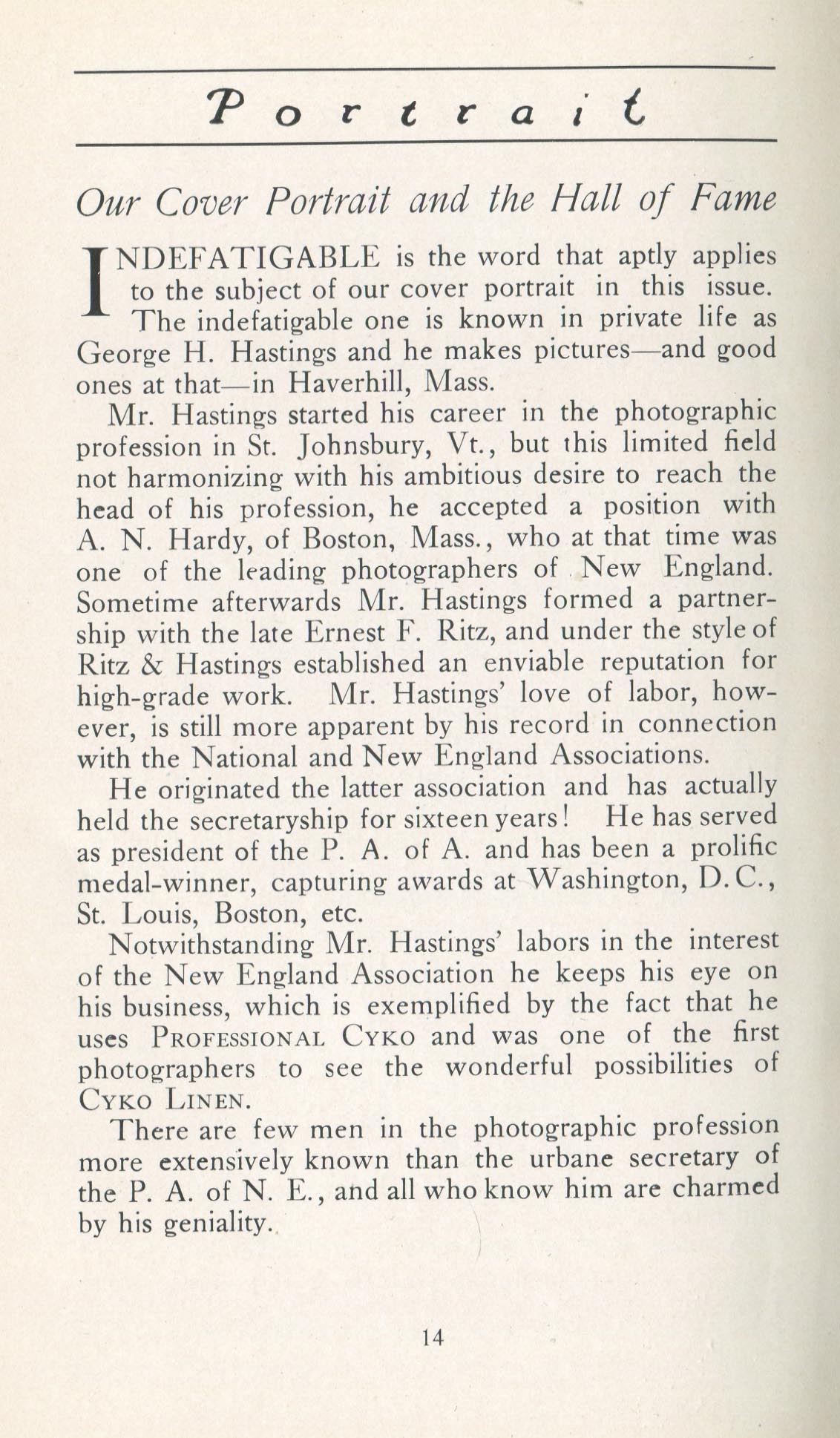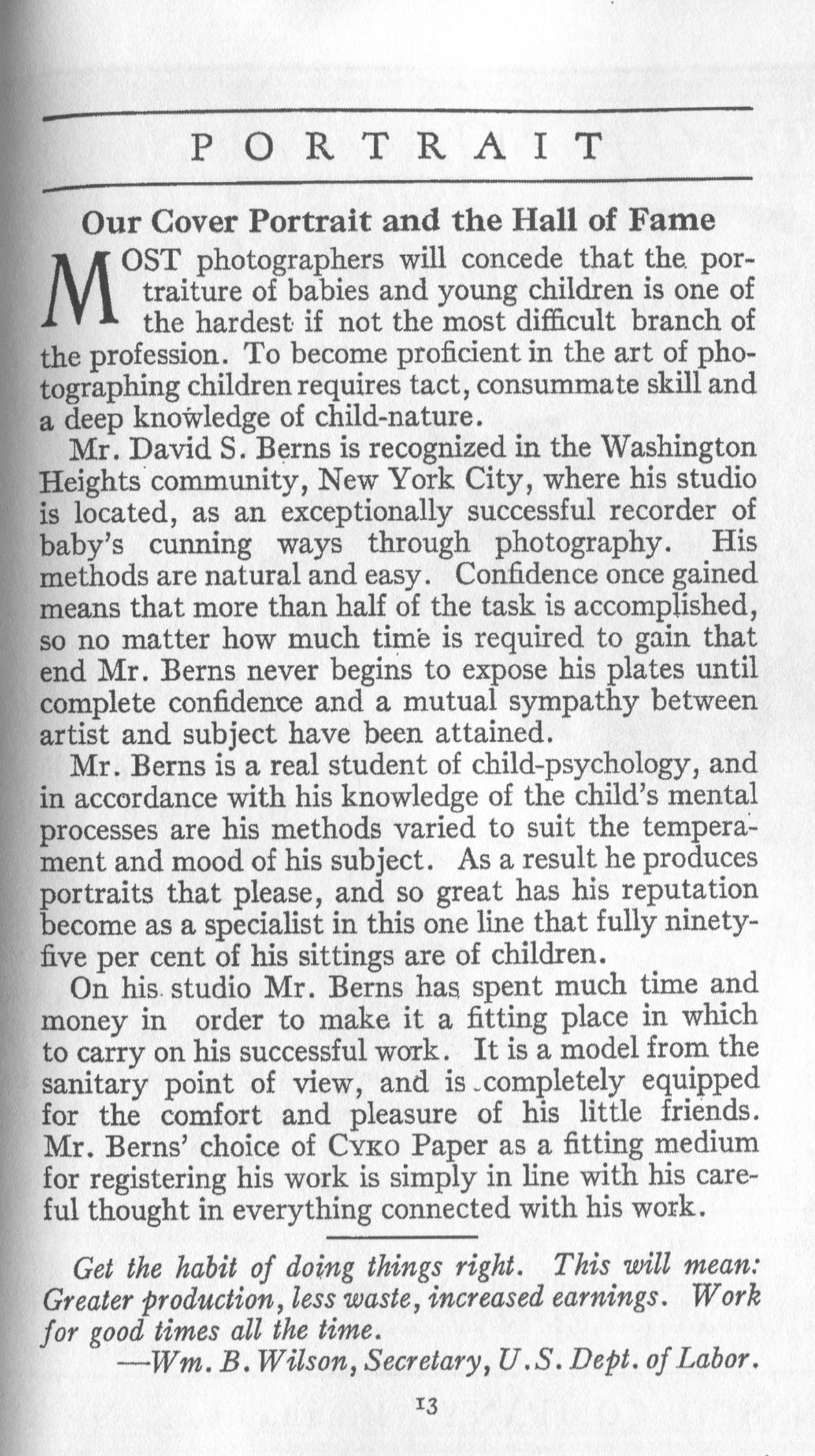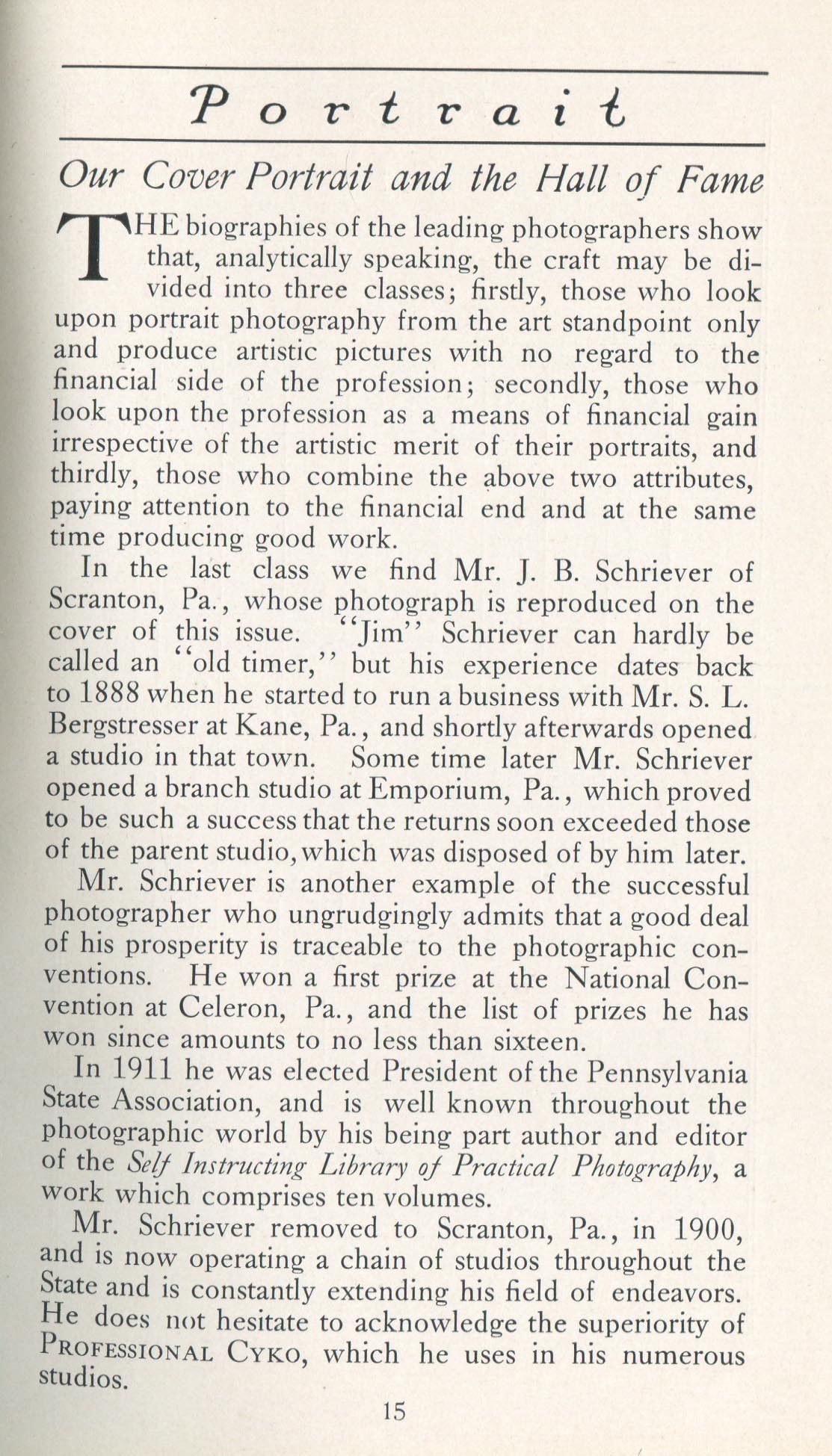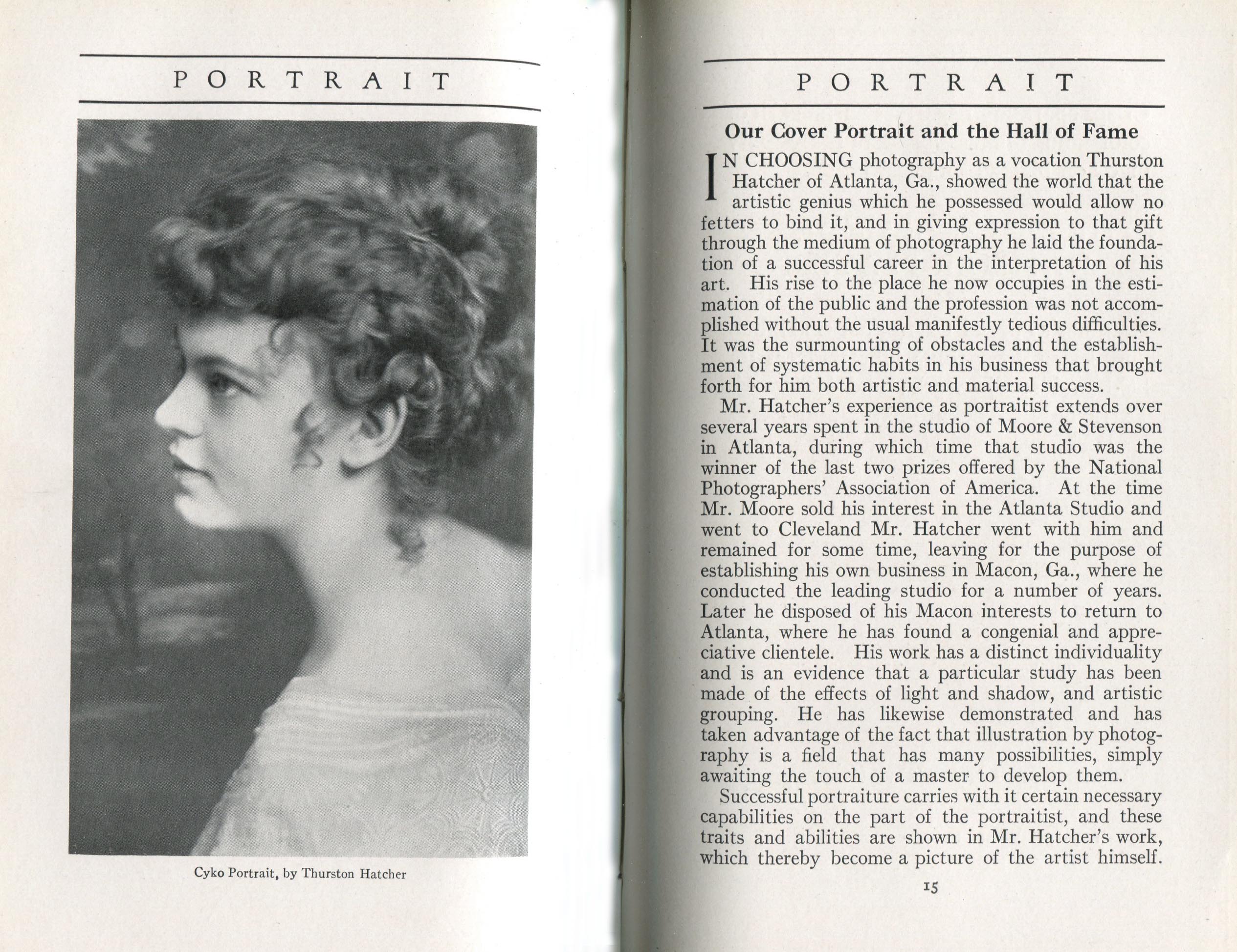 Portrait is also a good source for portraits of, and biographical information concerning, practitioners of `art-in-portraiture.' One hundred and forty-two photographers, including seventeen women, were honored with cover stories. (Since seven photographers had partners, the number of studios involved was 135.) Almost every issue featured a portrait of a U.S. or Canadian photographer on the cover, an appreciative profile, including the photographer's endorsement of ANSCO’s Cyko paper, and one or more examples of the photographer's work.