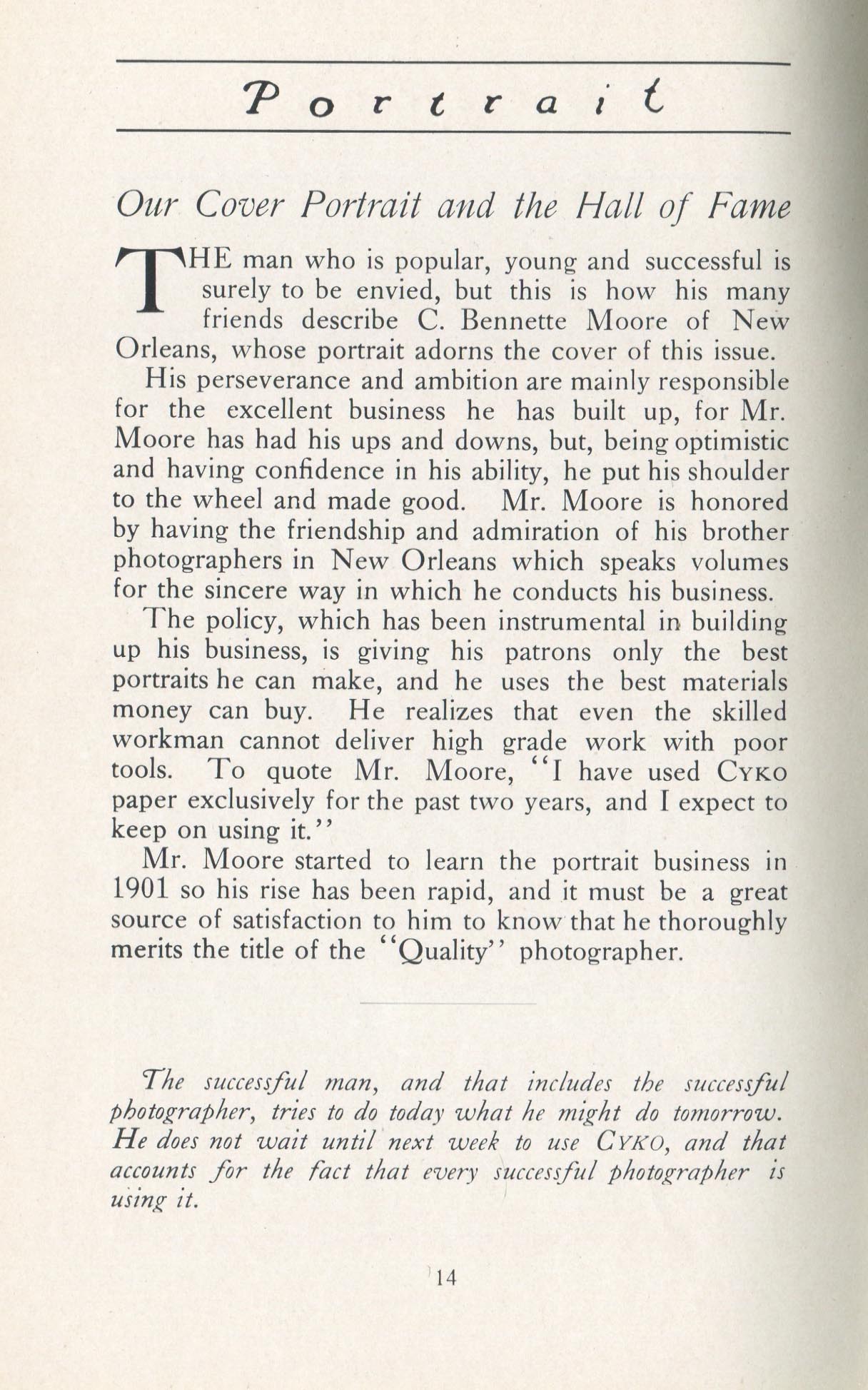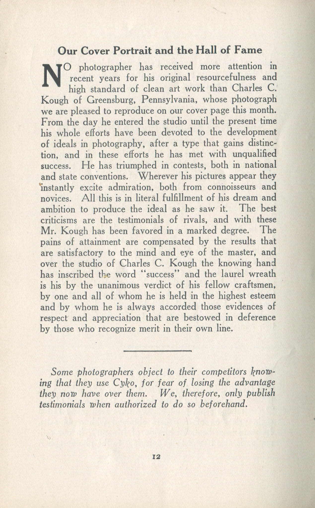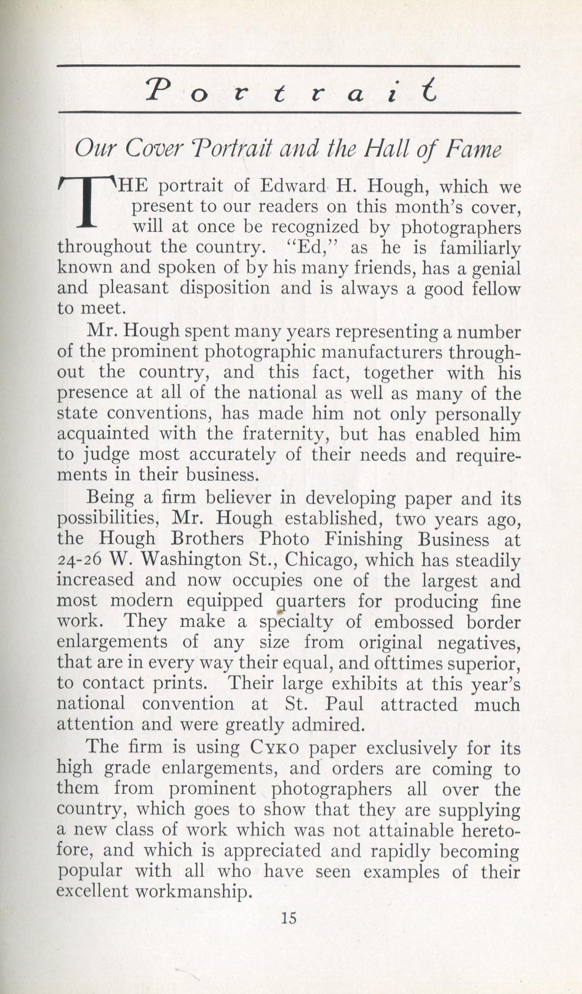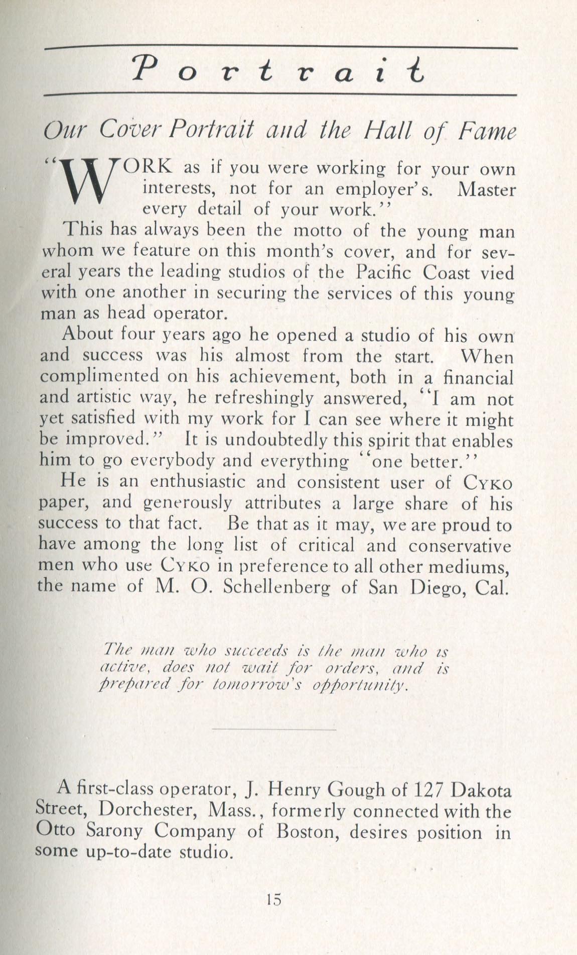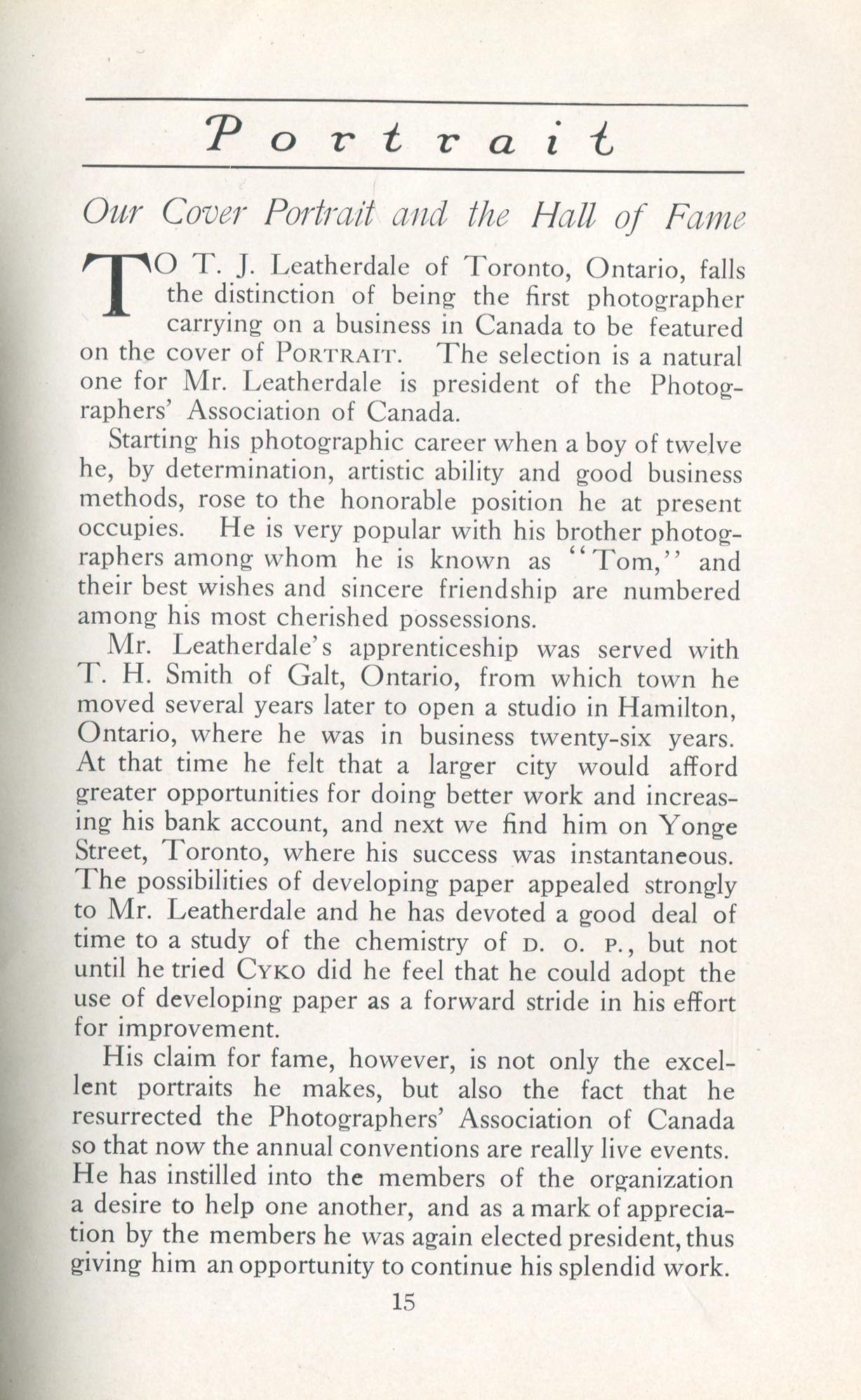 Portrait is also a good source for portraits of, and biographical information concerning, practitioners of `art-in-portraiture.' One hundred and forty-two photographers, including seventeen women, were honored with cover stories. (Since seven photographers had partners, the number of studios involved was 135.) Almost every issue featured a portrait of a U.S. or Canadian photographer on the cover, an appreciative profile, including the photographer's endorsement of ANSCO’s Cyko paper, and one or more examples of the photographer's work.