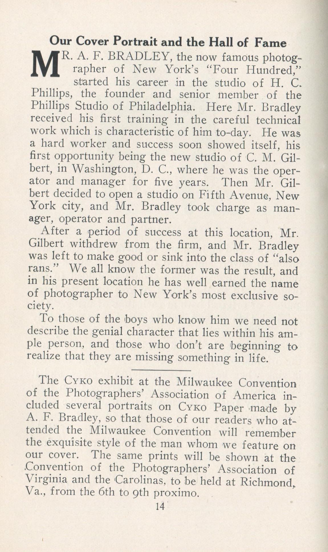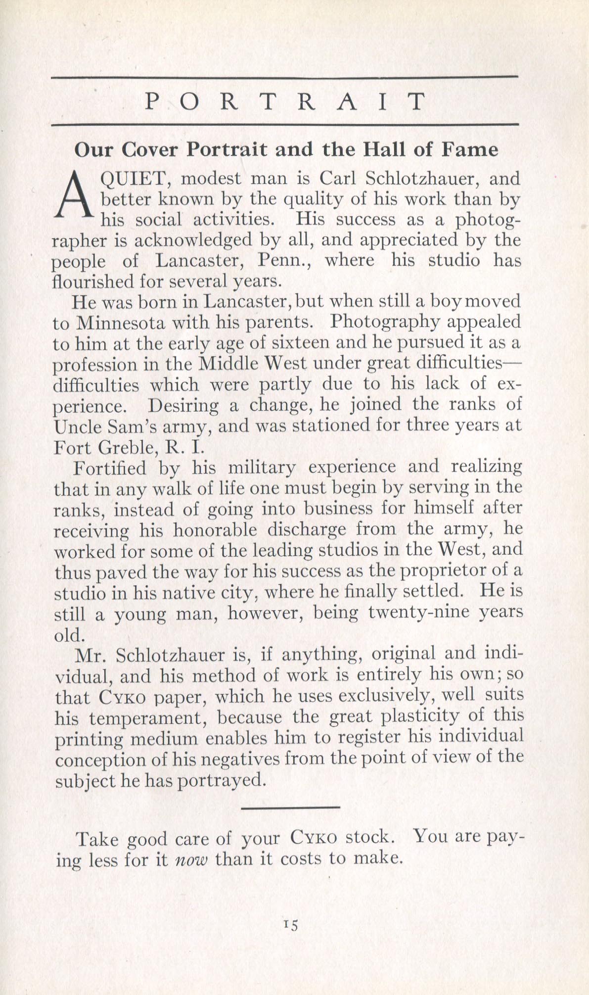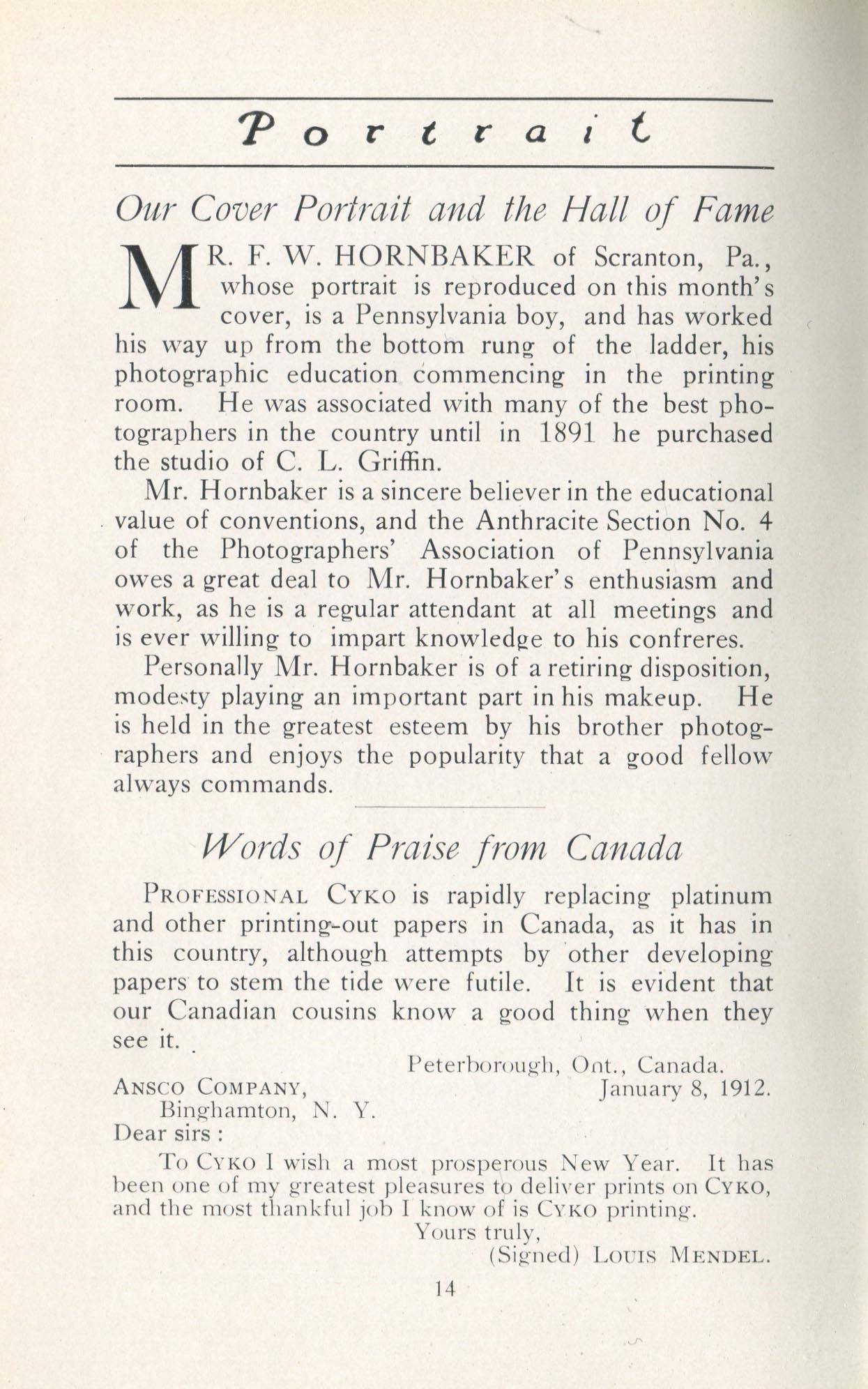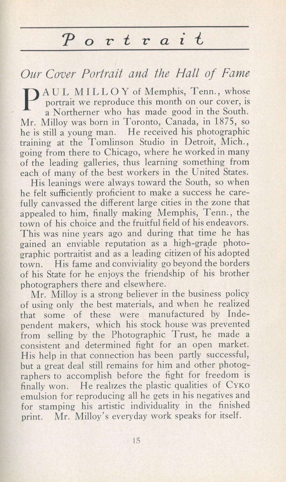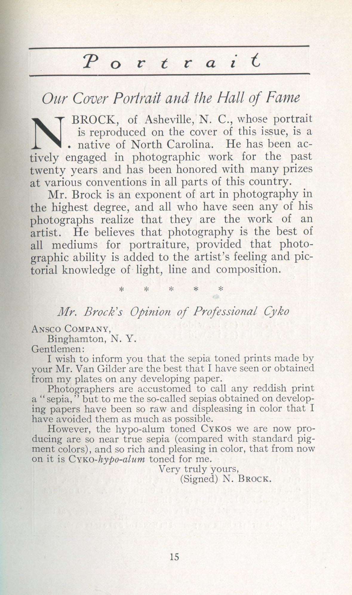Portrait is also a good source for portraits of, and biographical information concerning, practitioners of `art-in-portraiture.' One hundred and forty-two photographers, including seventeen women, were honored with cover stories. (Since seven photographers had partners, the number of studios involved was 135.) Almost every issue featured a portrait of a U.S. or Canadian photographer on the cover, an appreciative profile, including the photographer's endorsement of ANSCO’s Cyko paper, and one or more examples of the photographer's work.