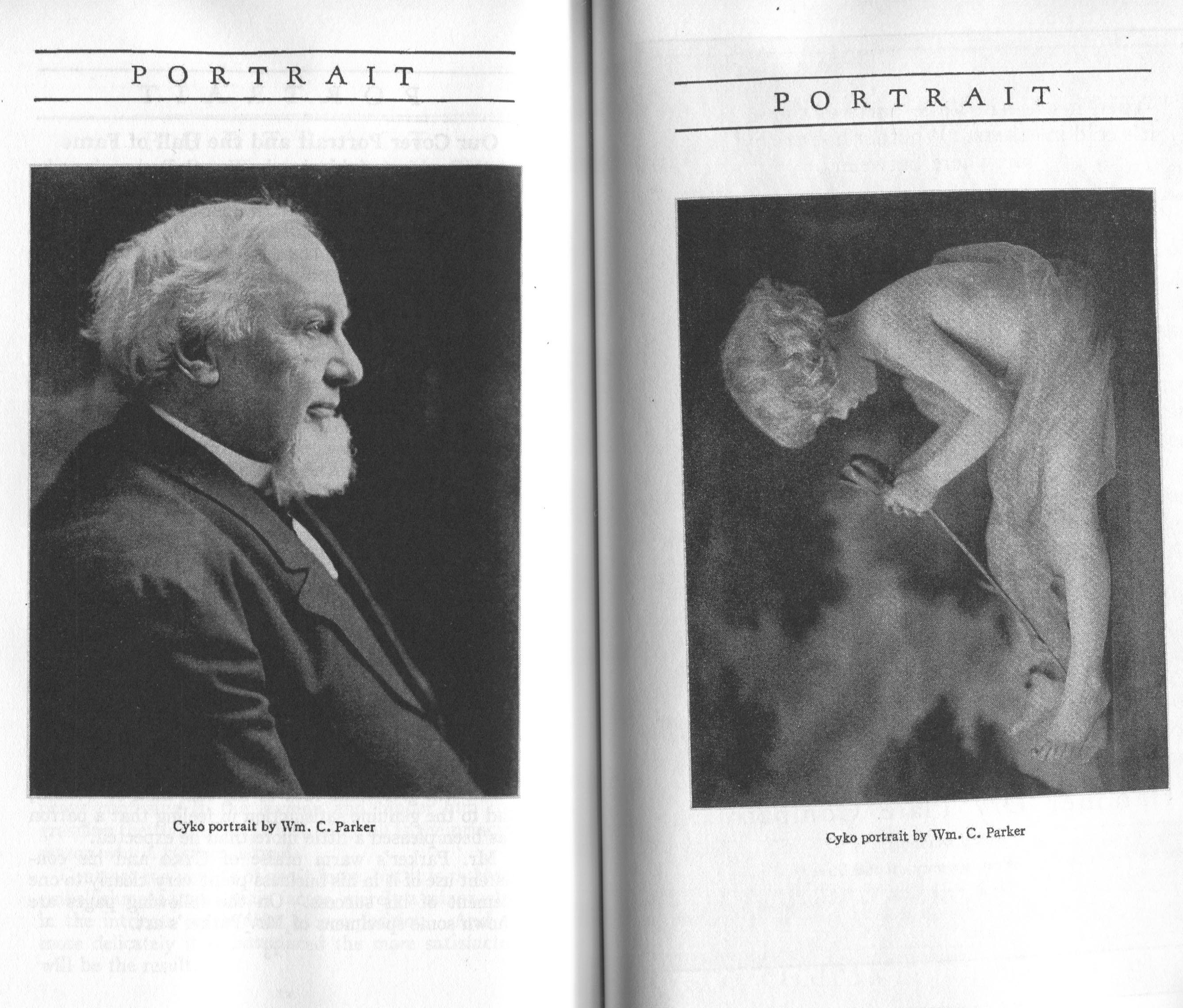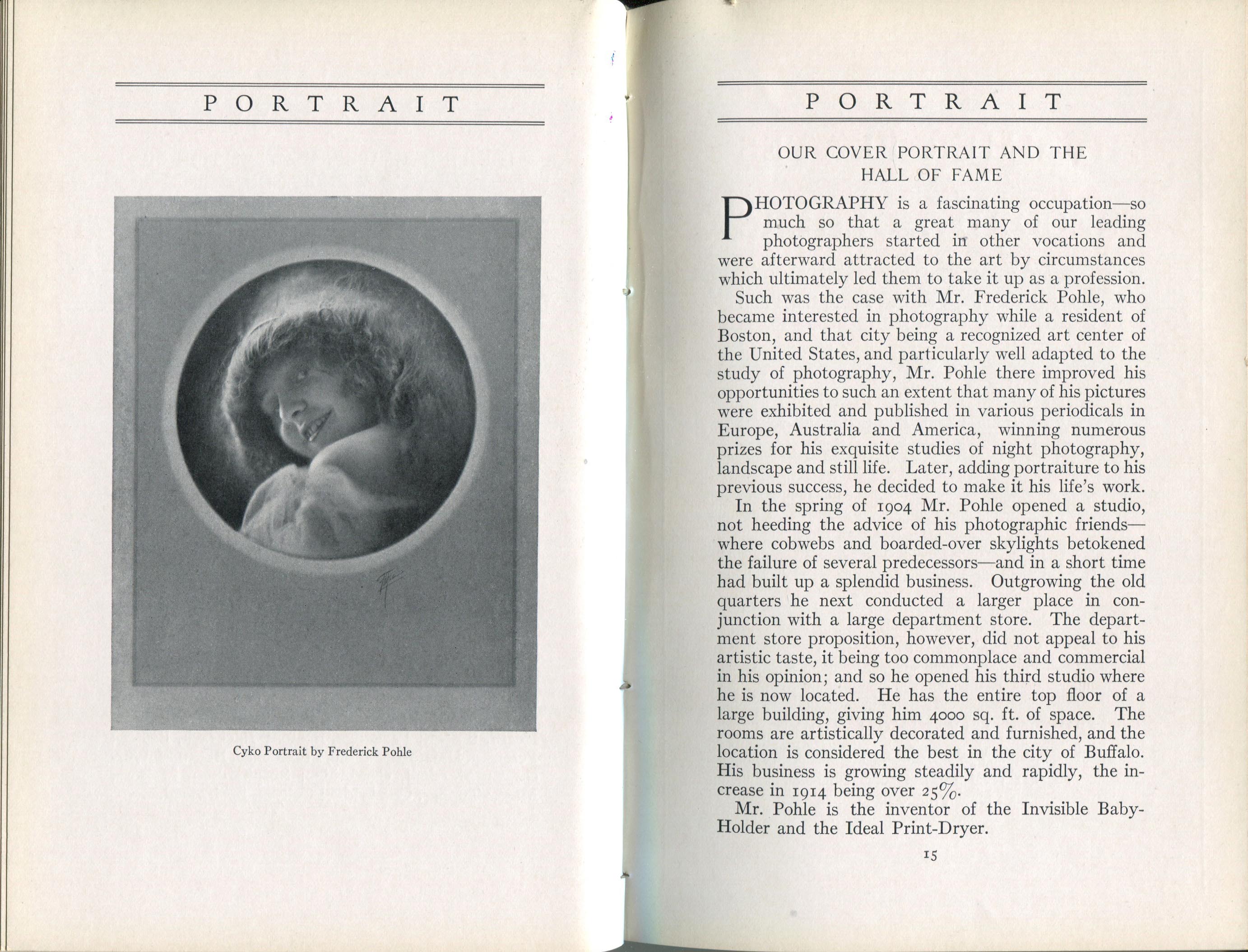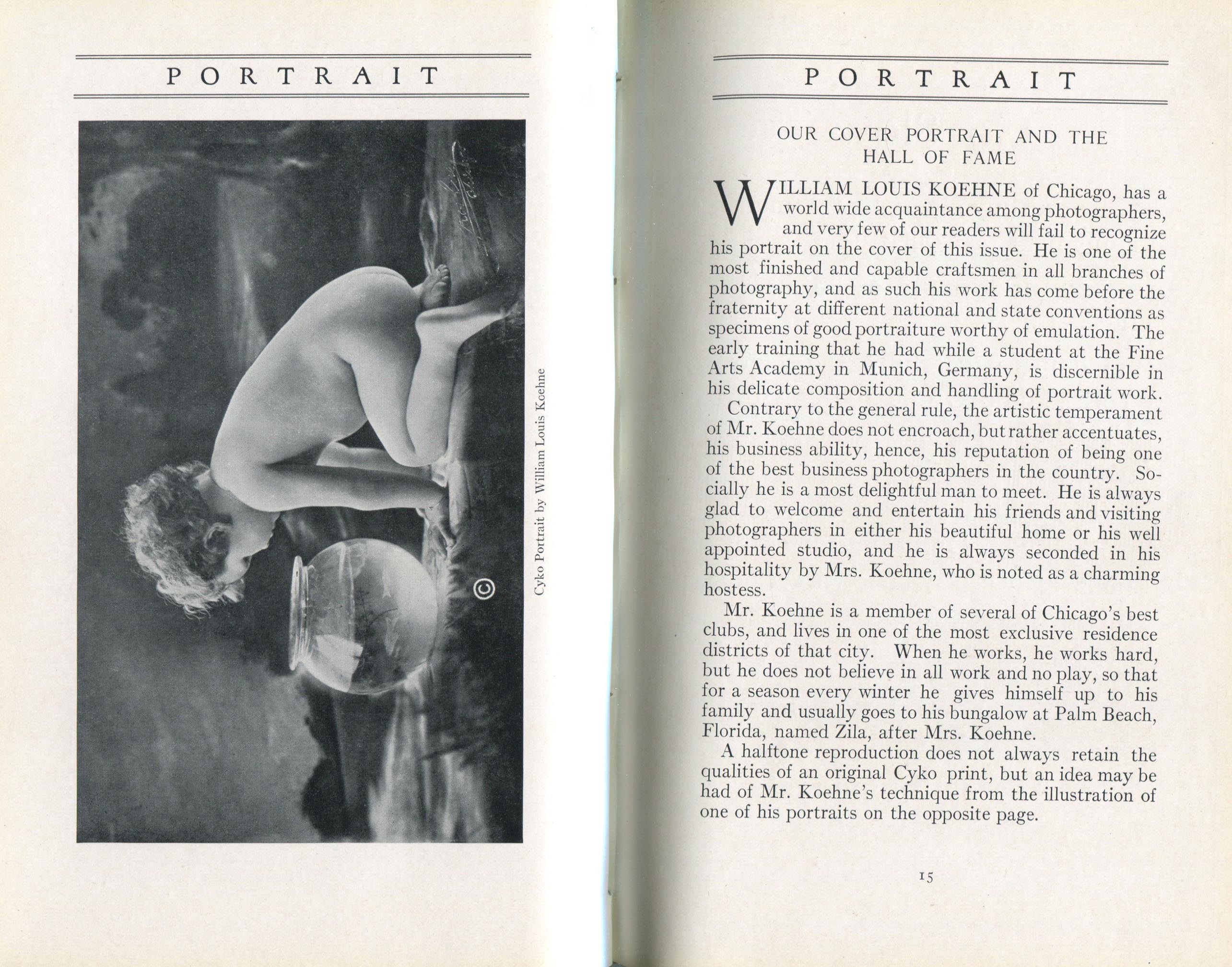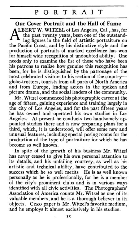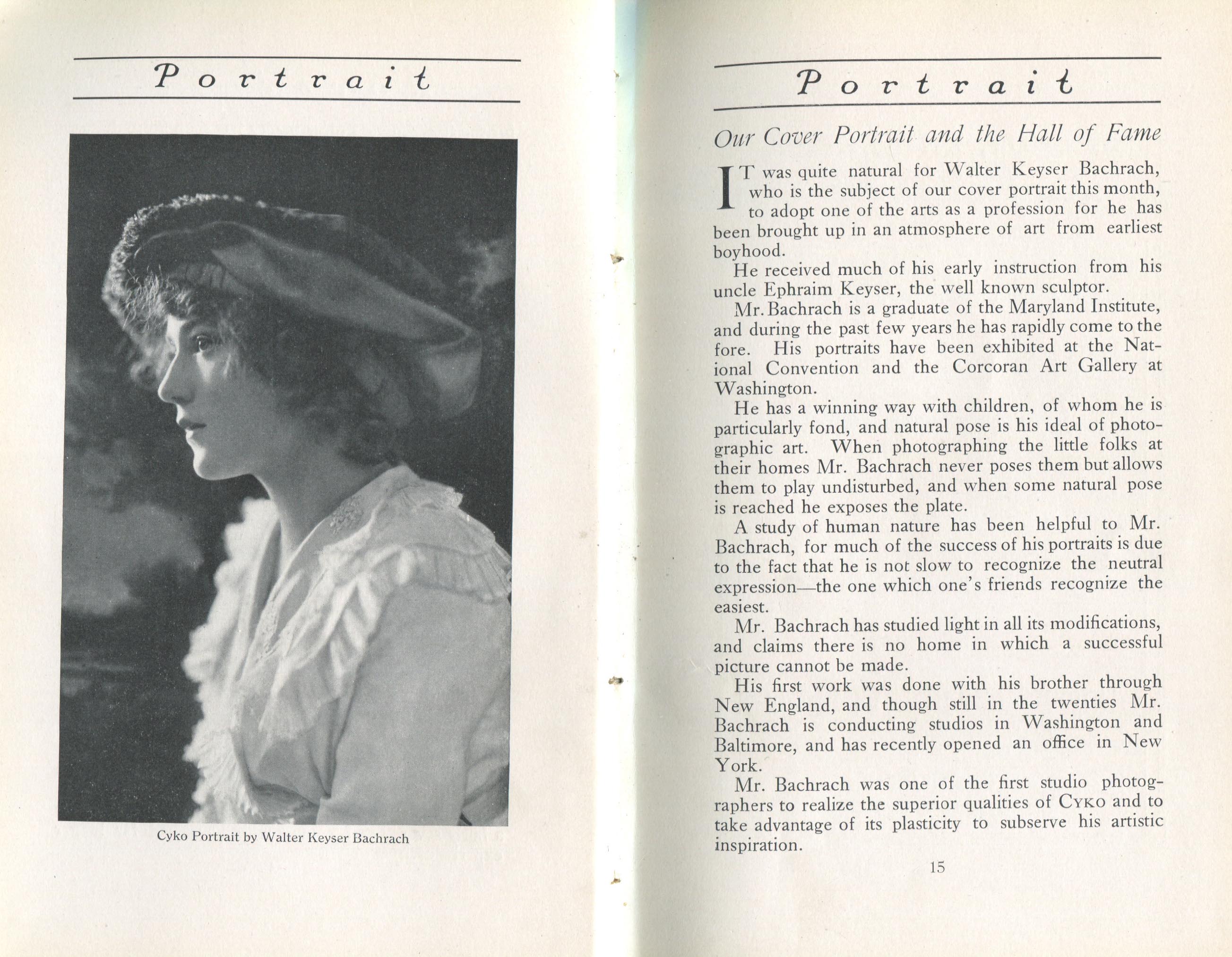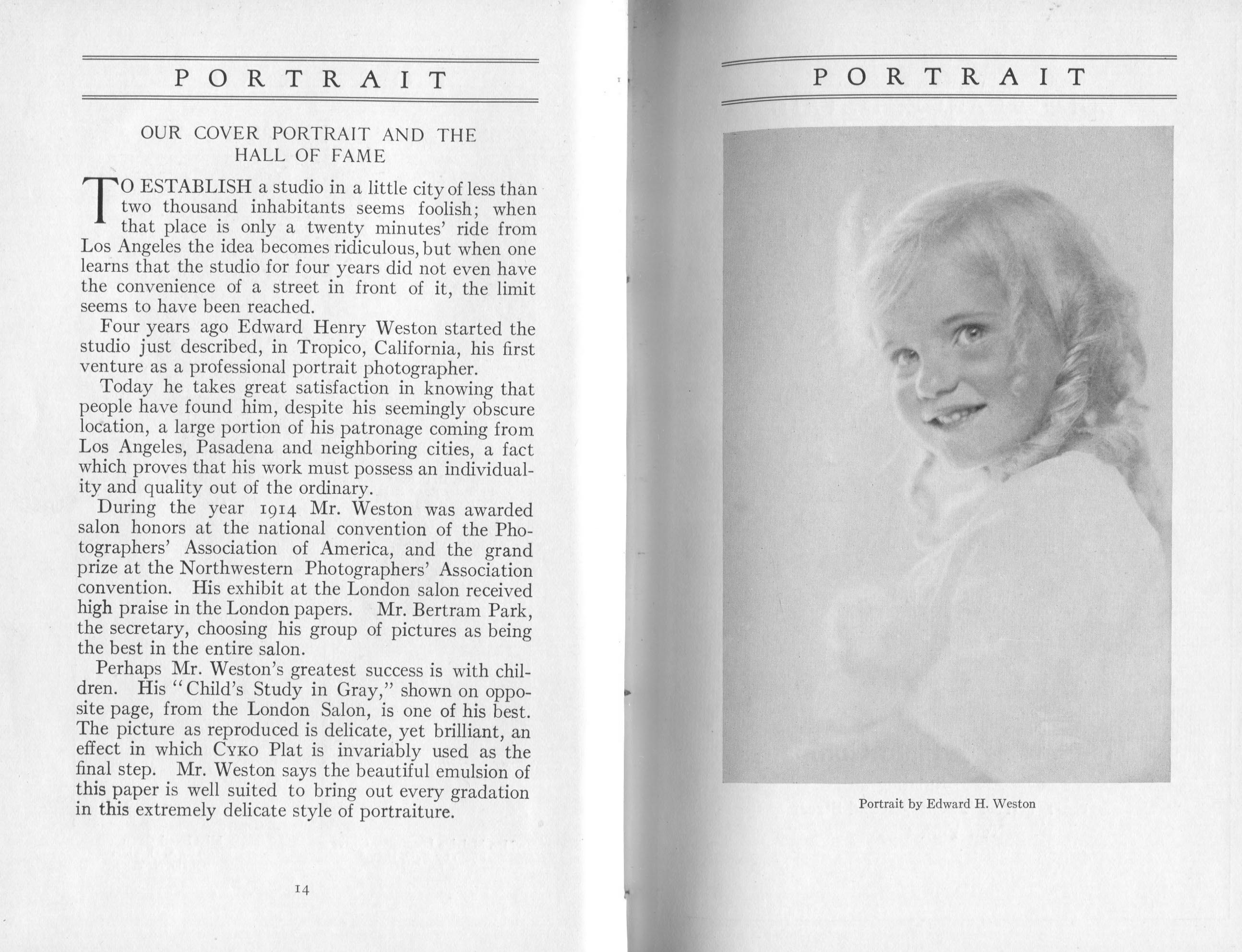 Featured photographers included several members of the Coterie, an informal group of the leading professional portrait photographers in the United States: E.B. ("Pop") Core, Pirie MacDonald, Commodore M.J. Steffens, and Julius C. Strauss. Others, well known in their own day if not our own, included Louis F. and Walter K. Bachrach; Alice Boughton; Mary Carnell; William Shewell Ellis; John Garo; O. Pierre Havens; Lejaren à Hiller; Dudley Hoyt; Gertrude Kaesebier; Alexander L. and Gotthelf Pach; Ryland W. Phillips; George G. Rockwood; and Edward Weston. (The reproductions of Weston's photographs in 1915 are of considerable interest because he later tried to suppress this early work.) A few of those featured were not known particularly for portraiture, such as L.F. Hammer, of Hammer Dry Plates fame, and William H. Rau, more renowned for his production of lantern slides. Dozens of other photographers honored in Portrait's `Hall of Fame' are now rather obscure and their profiles may be among the few sources available on them.