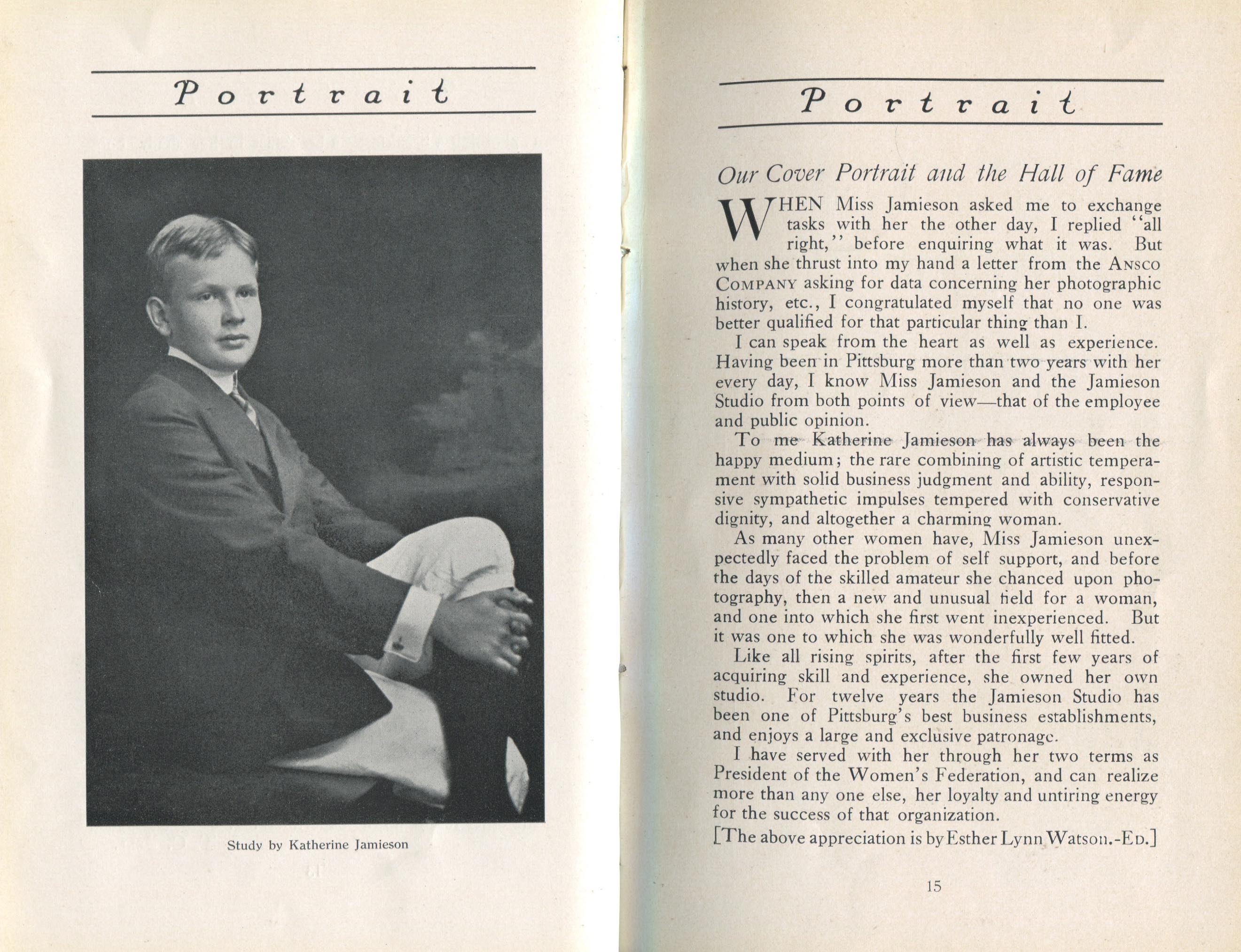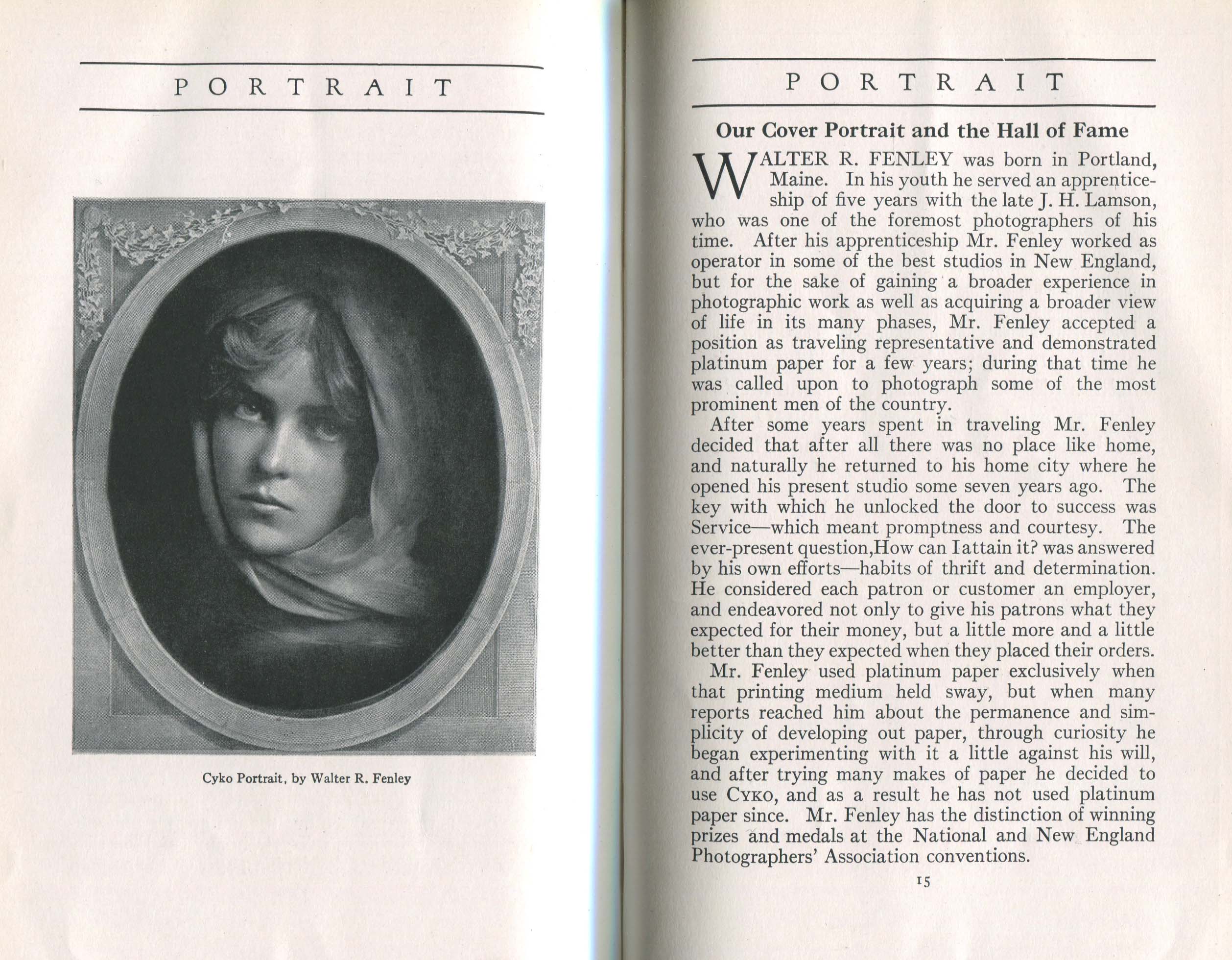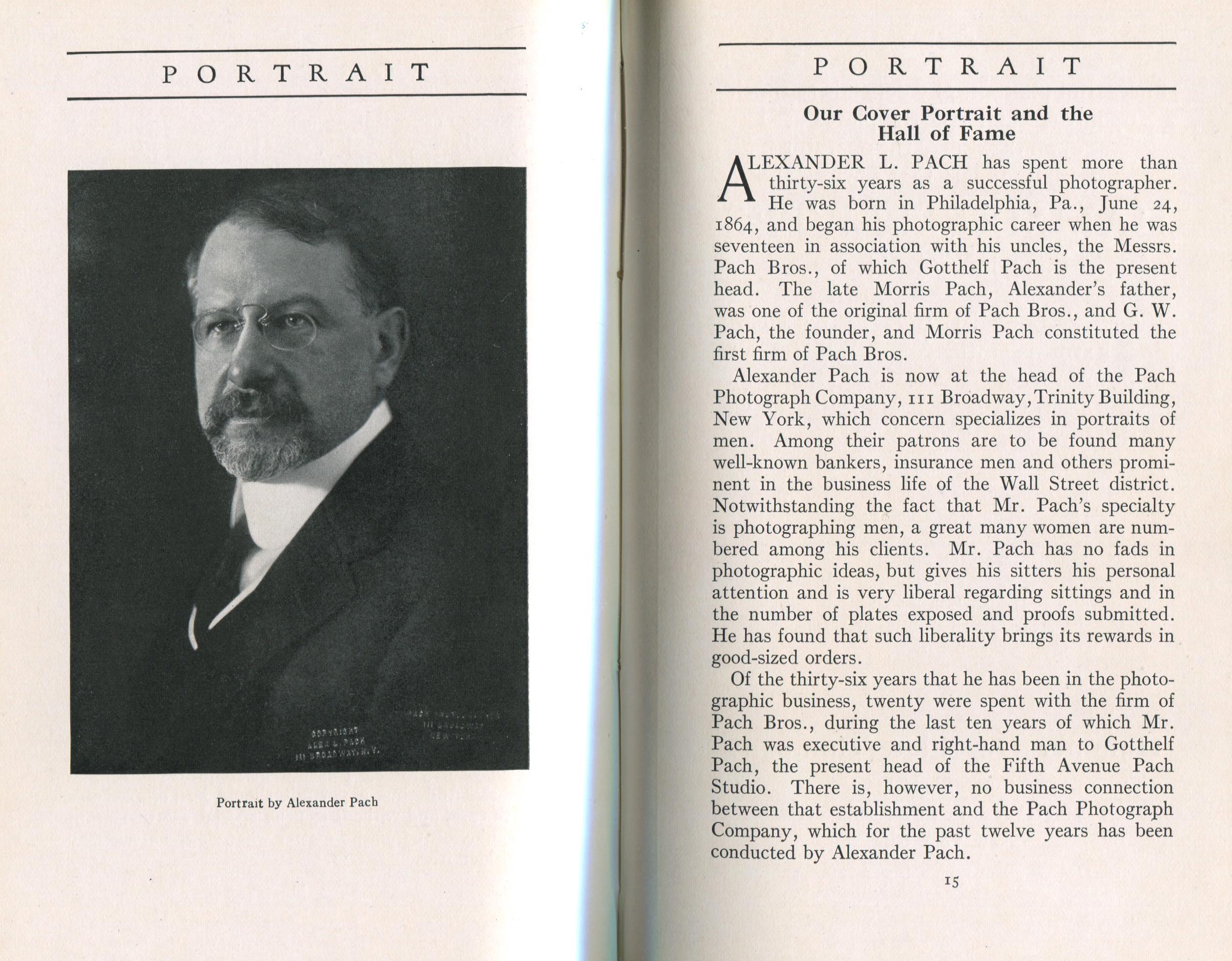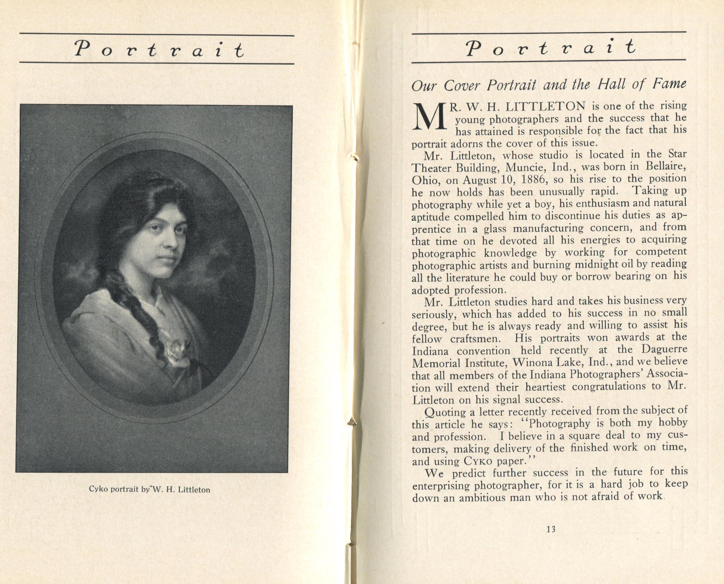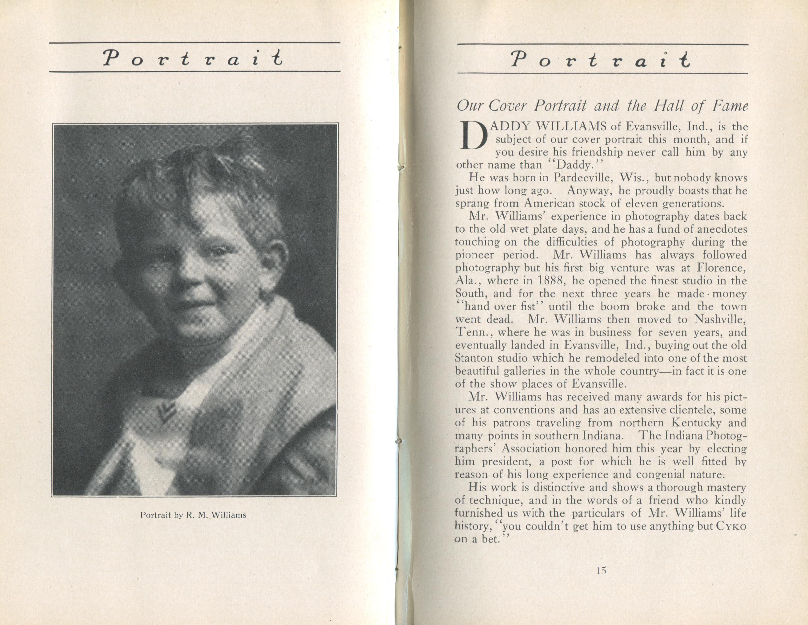 Featured photographers included several members of the Coterie, an informal group of the leading professional portrait photographers in the United States: E.B. ("Pop") Core, Pirie MacDonald, Commodore M.J. Steffens, and Julius C. Strauss. Others, well known in their own day if not our own, included Louis F. and Walter K. Bachrach; Alice Boughton; Mary Carnell; William Shewell Ellis; John Garo; O. Pierre Havens; Lejaren à Hiller; Dudley Hoyt; Gertrude Kaesebier; Alexander L. and Gotthelf Pach; Ryland W. Phillips; George G. Rockwood; and Edward Weston. (The reproductions of Weston's photographs in 1915 are of considerable interest because he later tried to suppress this early work.) A few of those featured were not known particularly for portraiture, such as L.F. Hammer, of Hammer Dry Plates fame, and William H. Rau, more renowned for his production of lantern slides. Dozens of other photographers honored in Portrait's `Hall of Fame' are now rather obscure and their profiles may be among the few sources available on them.