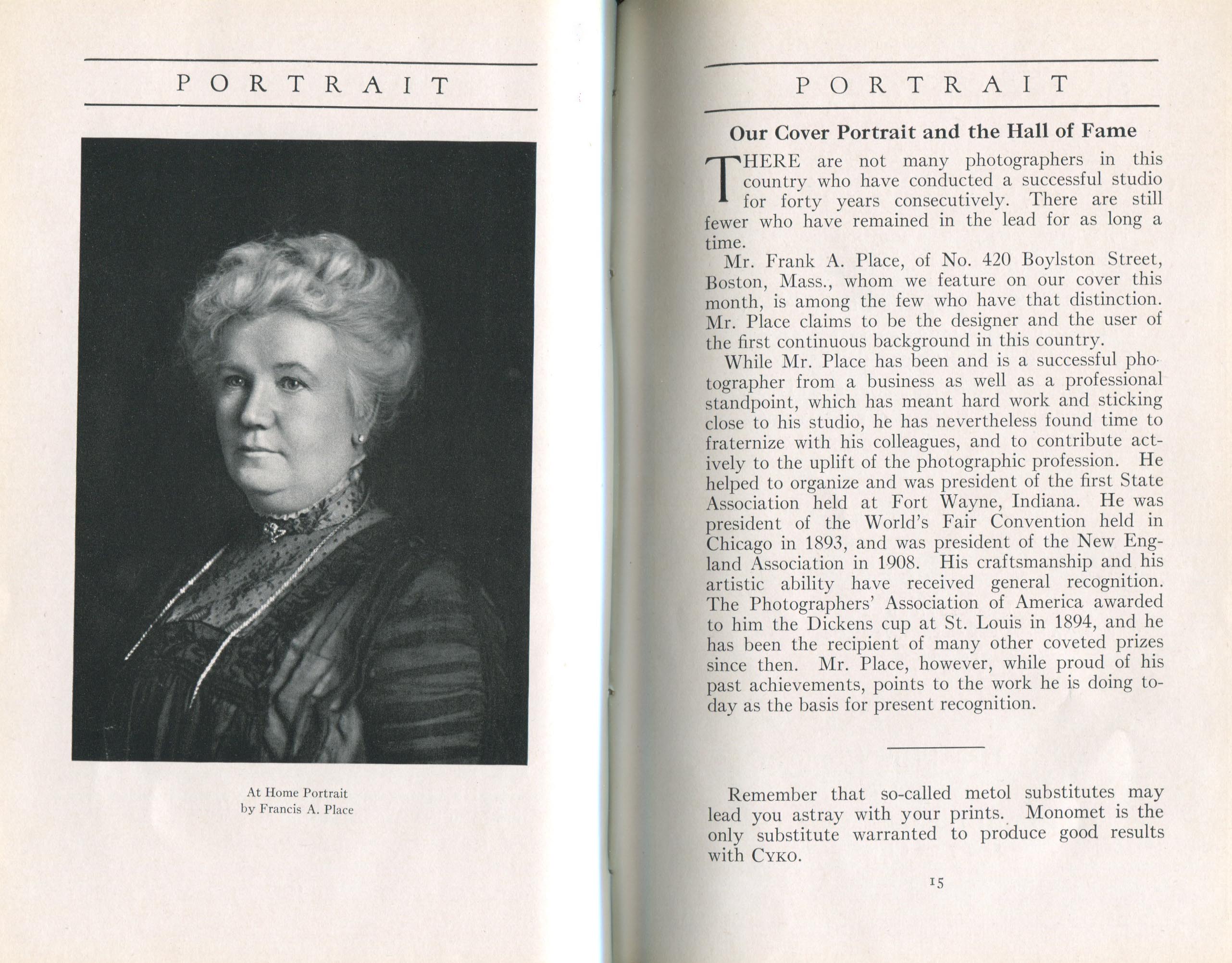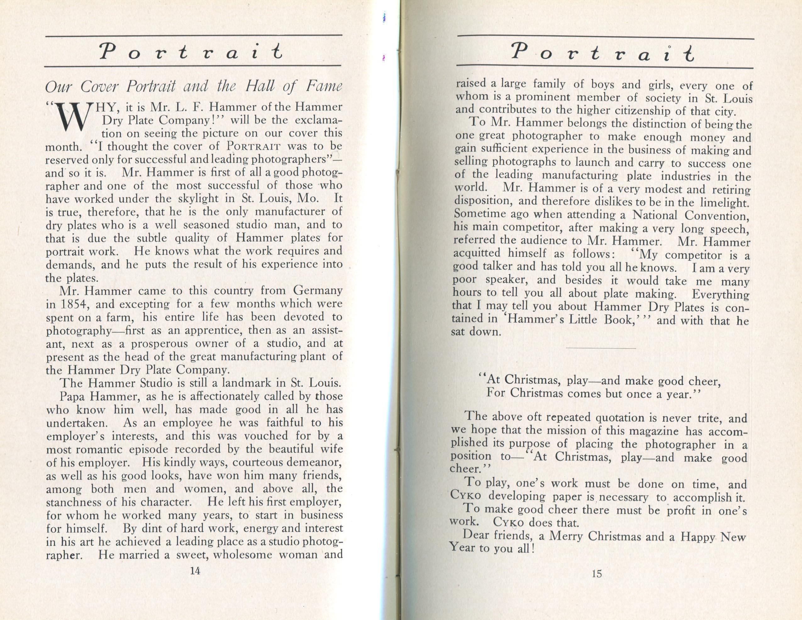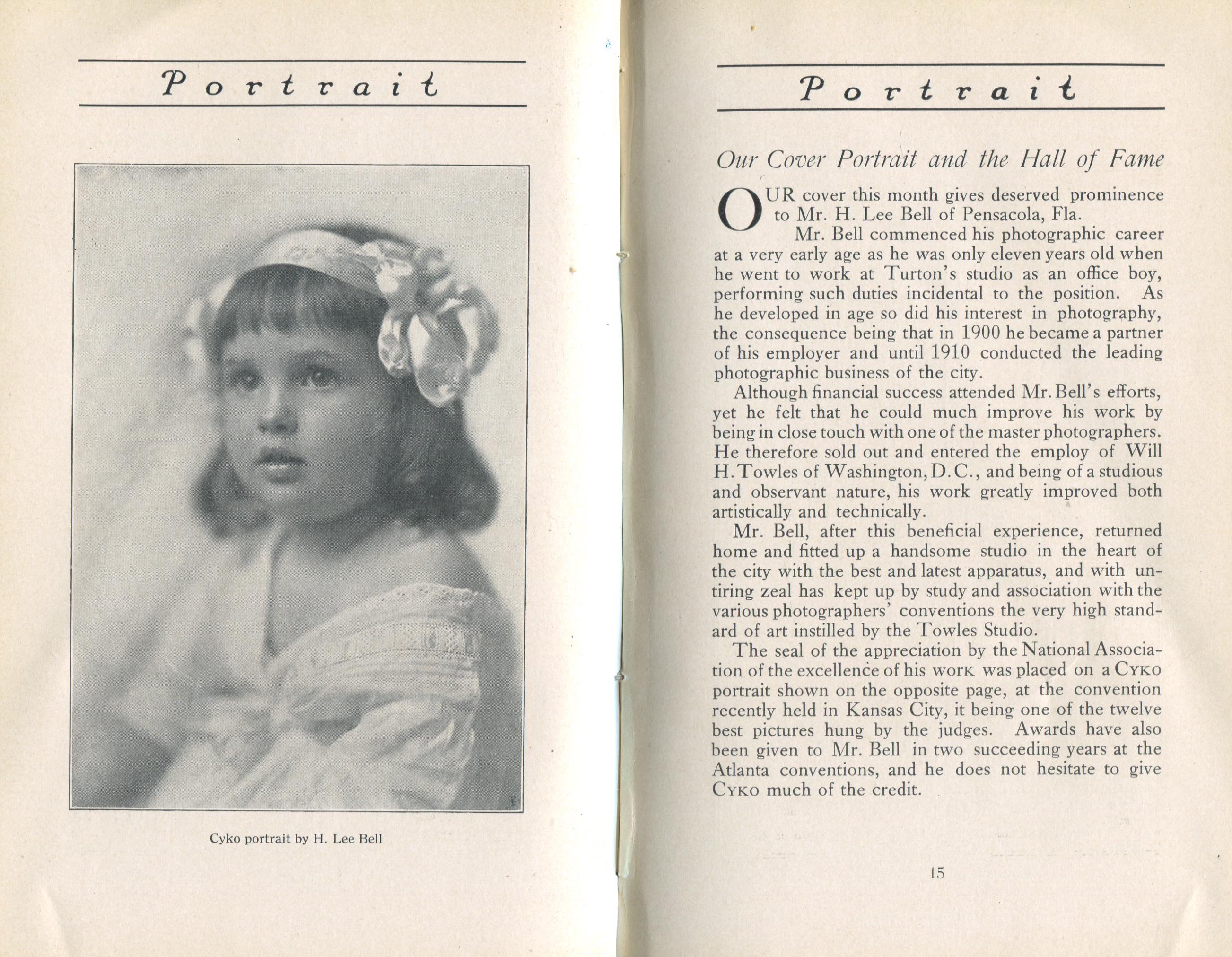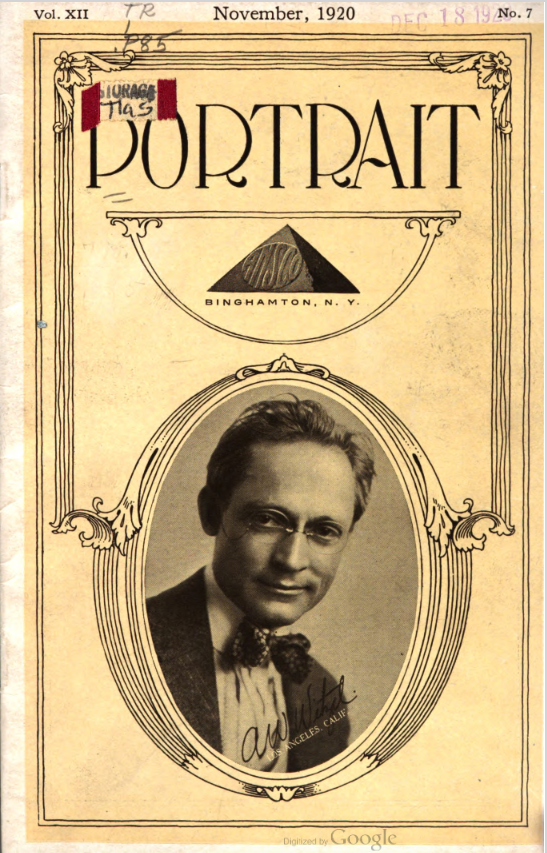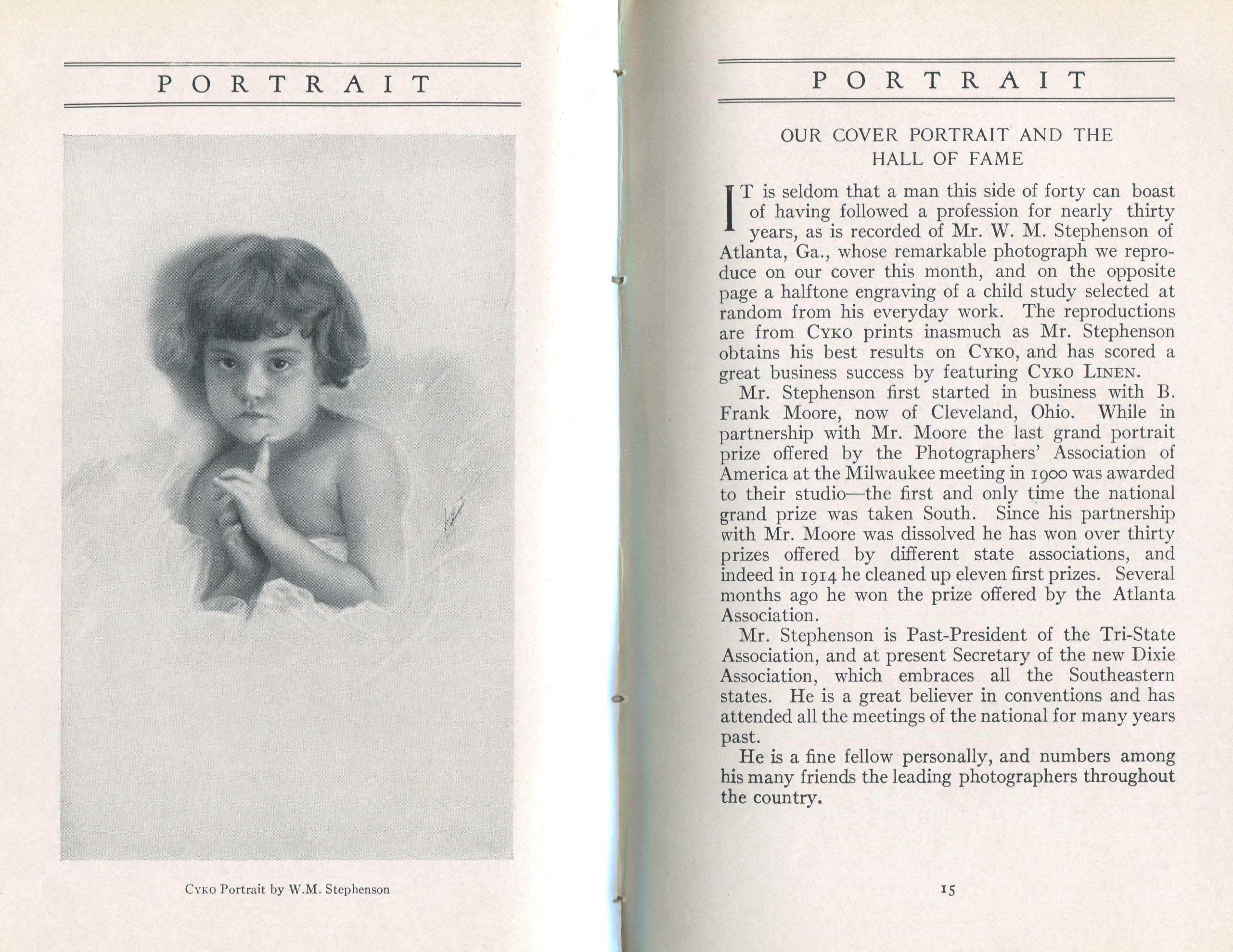 Featured photographers included several members of the Coterie, an informal group of the leading professional portrait photographers in the United States: E.B. ("Pop") Core, Pirie MacDonald, Commodore M.J. Steffens, and Julius C. Strauss. Others, well known in their own day if not our own, included Louis F. and Walter K. Bachrach; Alice Boughton; Mary Carnell; William Shewell Ellis; John Garo; O. Pierre Havens; Lejaren à Hiller; Dudley Hoyt; Gertrude Kaesebier; Alexander L. and Gotthelf Pach; Ryland W. Phillips; George G. Rockwood; and Edward Weston. (The reproductions of Weston's photographs in 1915 are of considerable interest because he later tried to suppress this early work.) A few of those featured were not known particularly for portraiture, such as L.F. Hammer, of Hammer Dry Plates fame, and William H. Rau, more renowned for his production of lantern slides. Dozens of other photographers honored in Portrait's `Hall of Fame' are now rather obscure and their profiles may be among the few sources available on them.