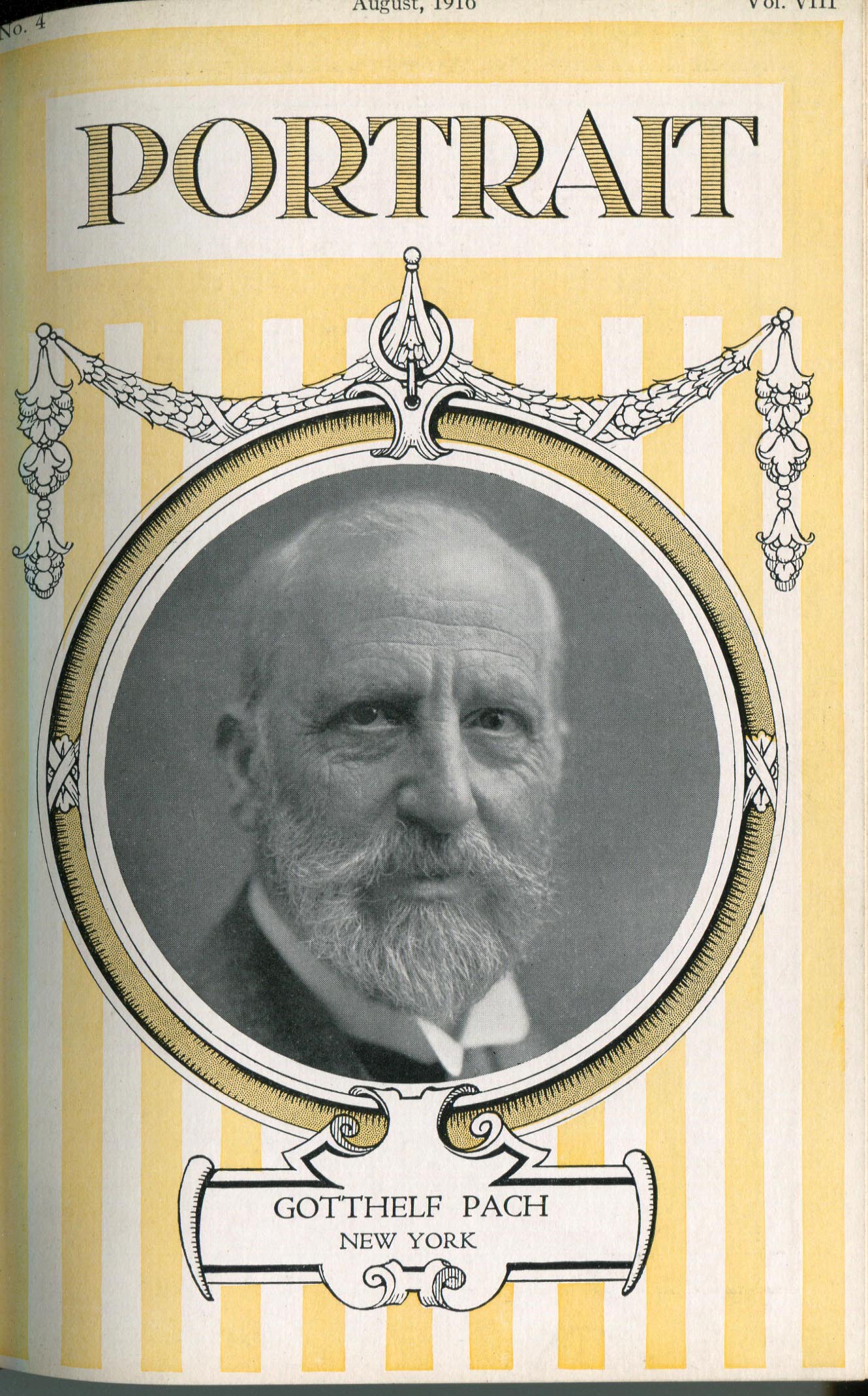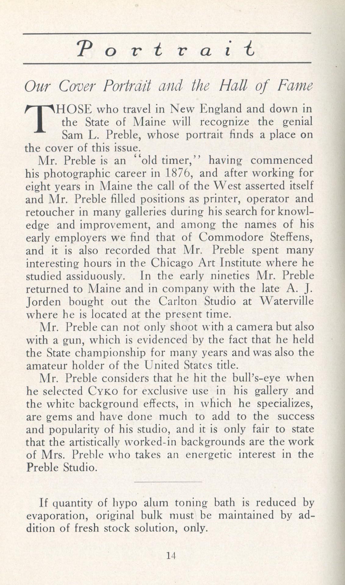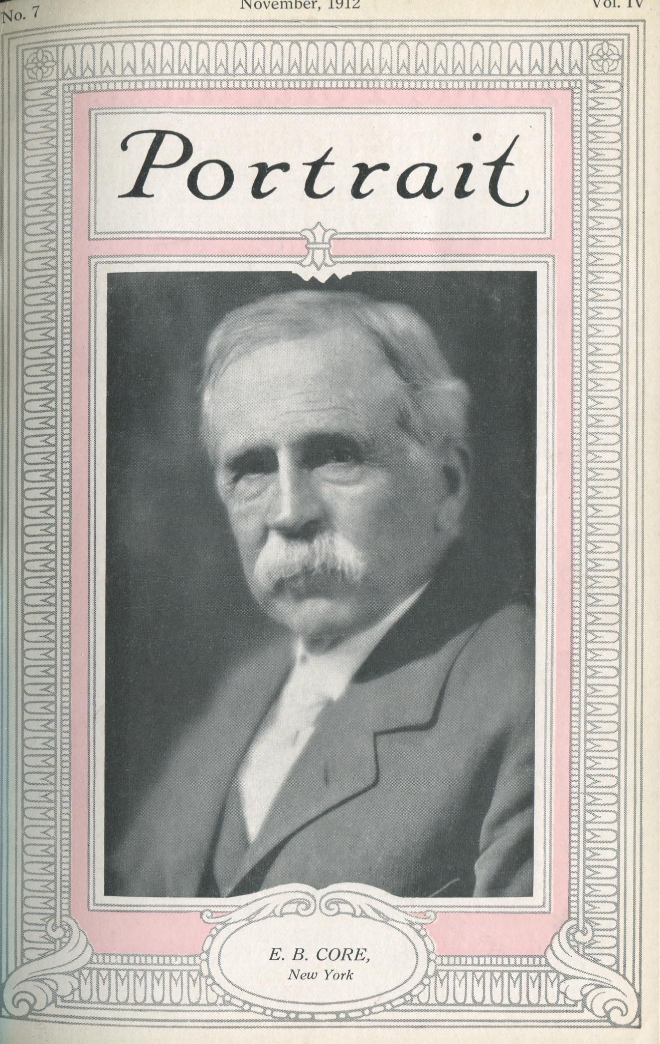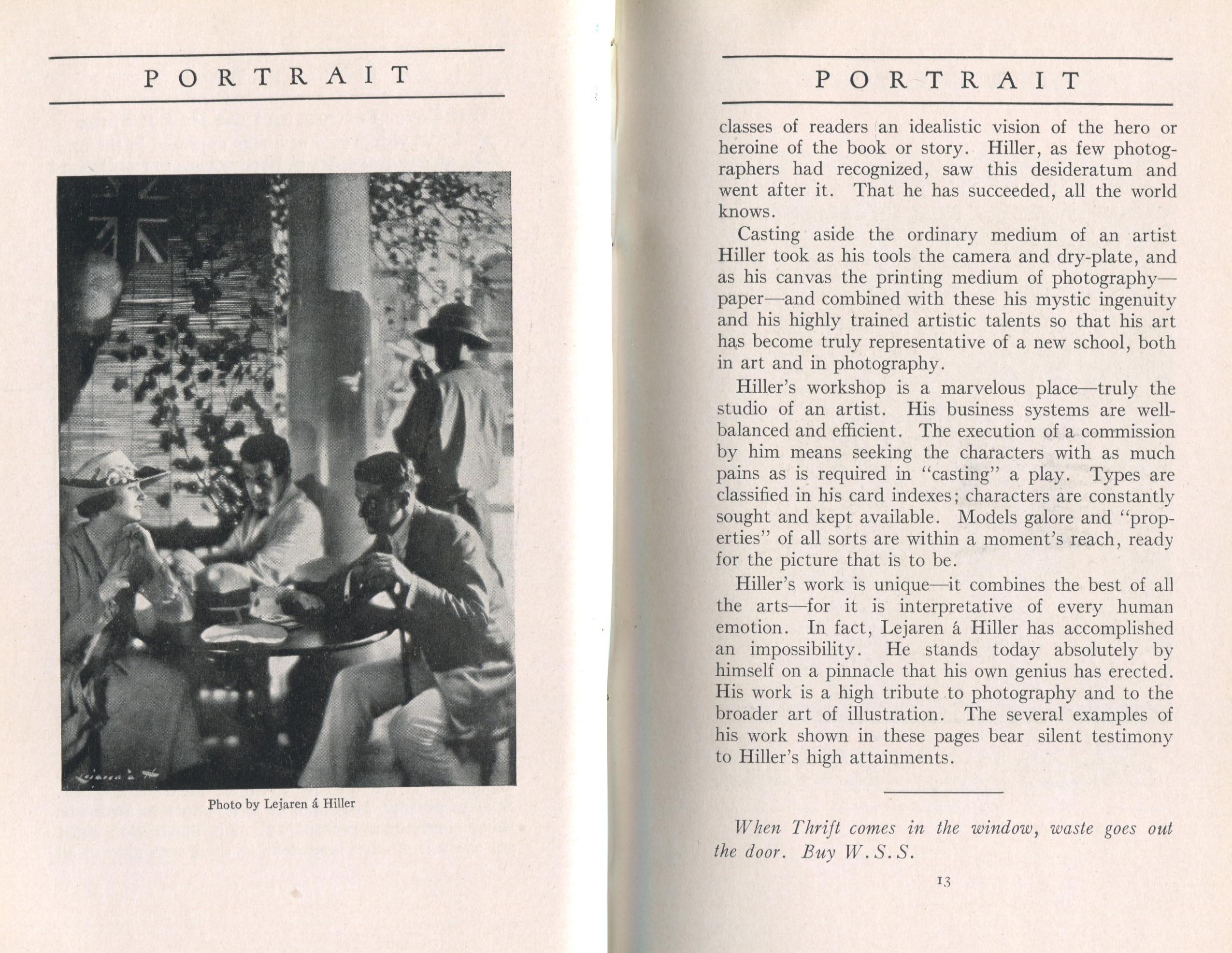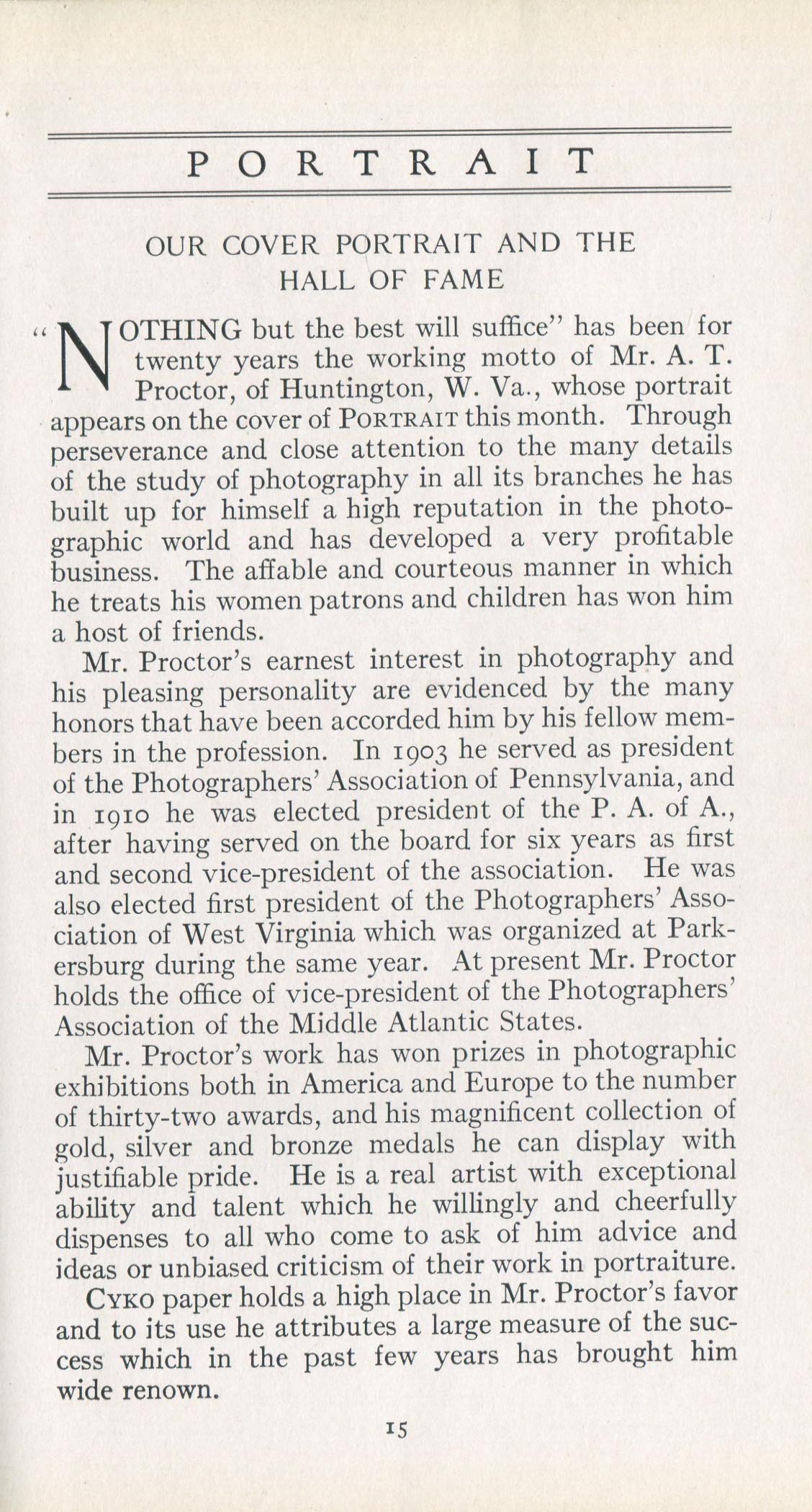 Featured photographers included several members of the Coterie, an informal group of the leading professional portrait photographers in the United States: E.B. ("Pop") Core, Pirie MacDonald, Commodore M.J. Steffens, and Julius C. Strauss. Others, well known in their own day if not our own, included Louis F. and Walter K. Bachrach; Alice Boughton; Mary Carnell; William Shewell Ellis; John Garo; O. Pierre Havens; Lejaren à Hiller; Dudley Hoyt; Gertrude Kaesebier; Alexander L. and Gotthelf Pach; Ryland W. Phillips; George G. Rockwood; and Edward Weston. (The reproductions of Weston's photographs in 1915 are of considerable interest because he later tried to suppress this early work.) A few of those featured were not known particularly for portraiture, such as L.F. Hammer, of Hammer Dry Plates fame, and William H. Rau, more renowned for his production of lantern slides. Dozens of other photographers honored in Portrait's `Hall of Fame' are now rather obscure and their profiles may be among the few sources available on them.