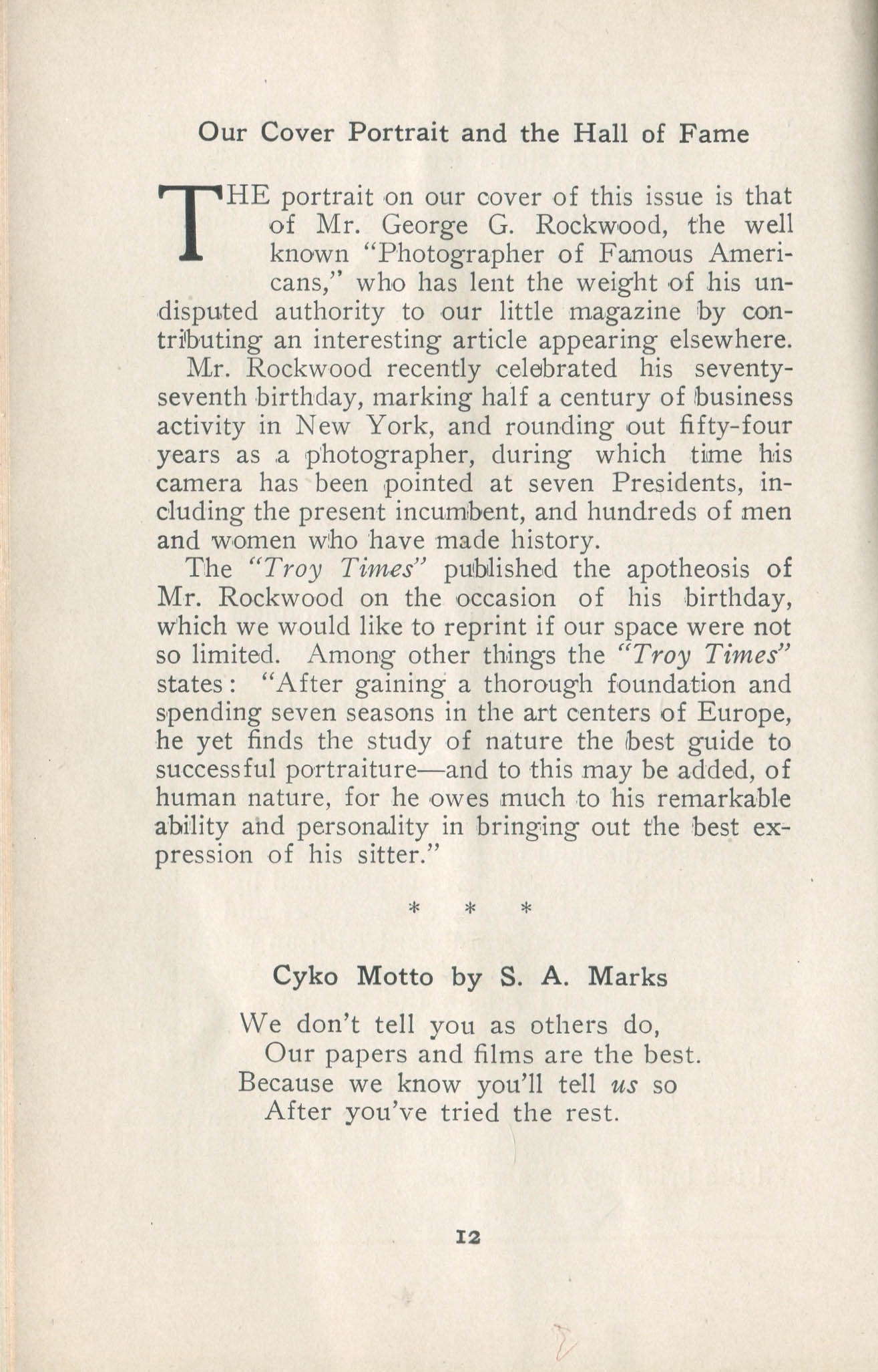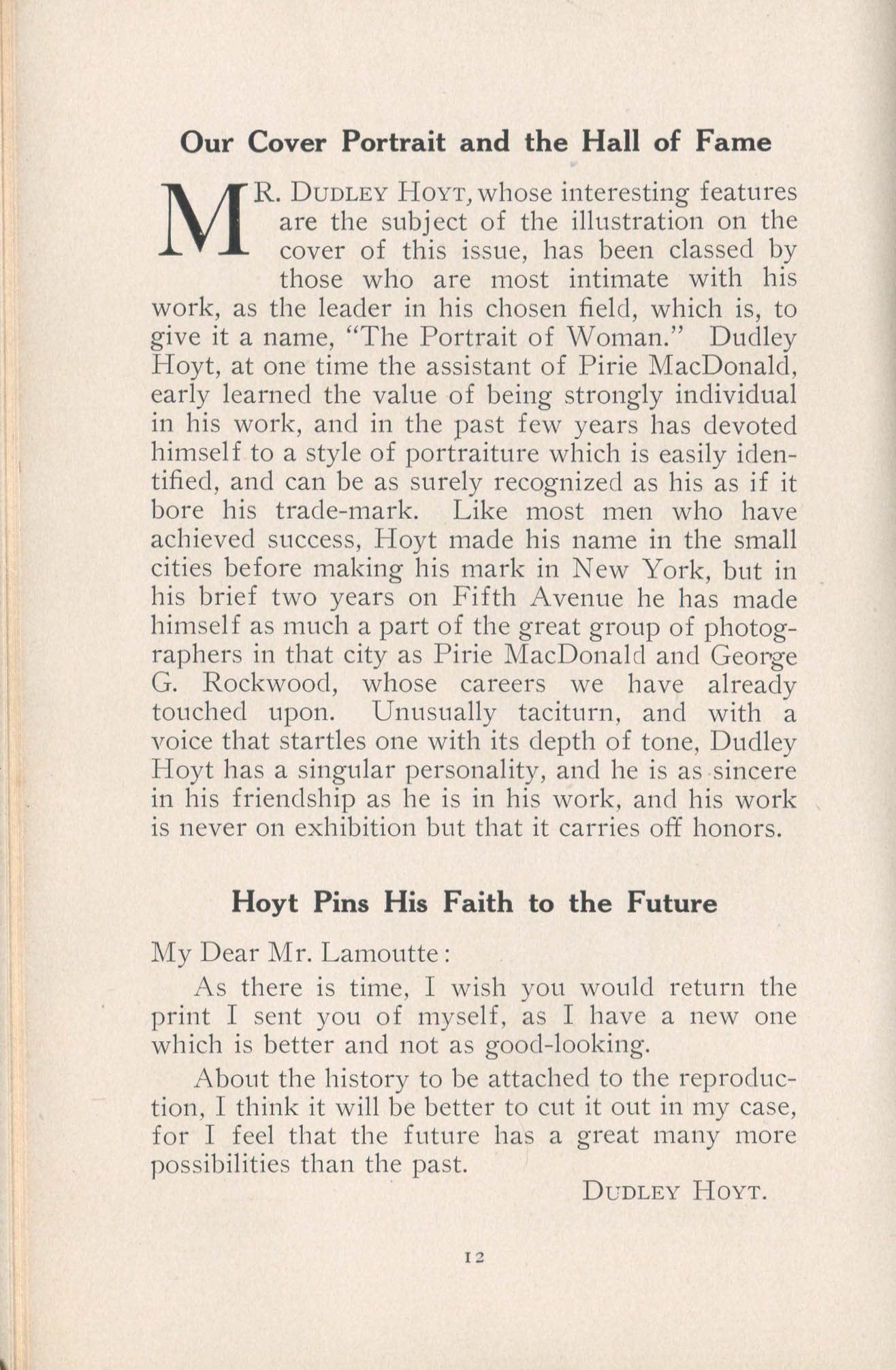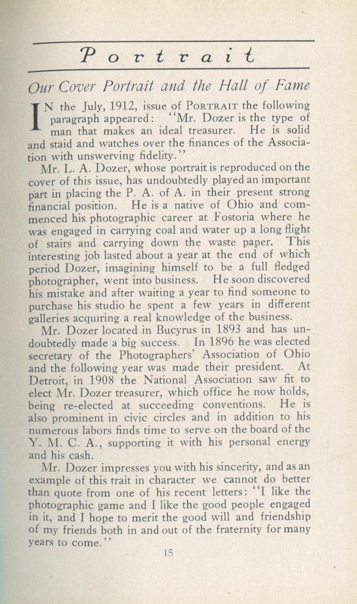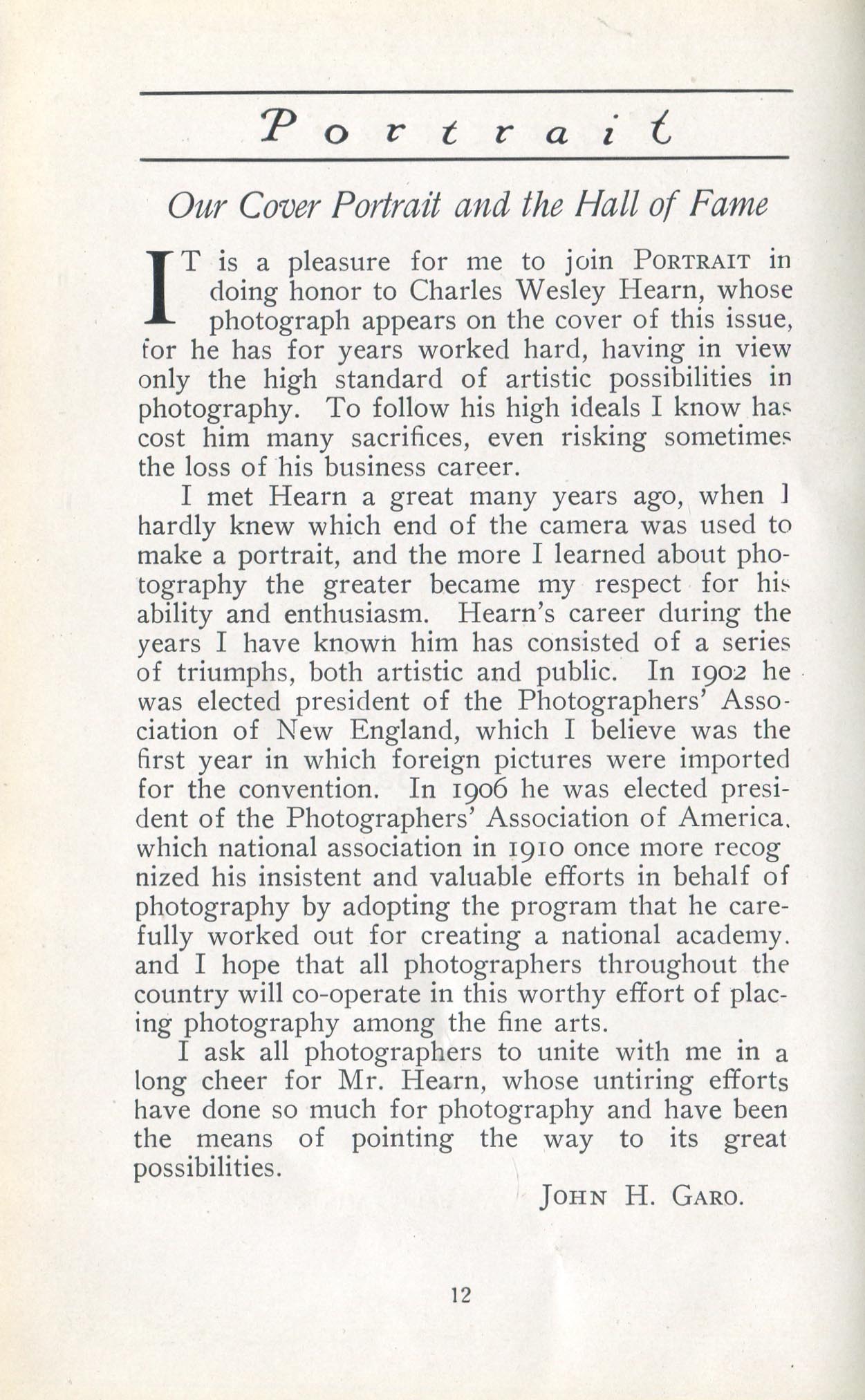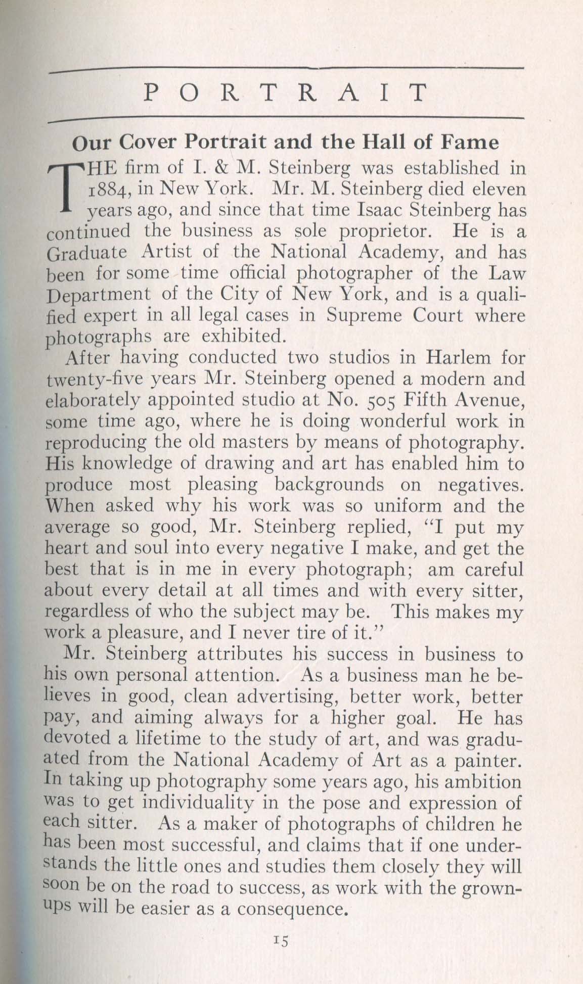 Featured photographers included several members of the Coterie, an informal group of the leading professional portrait photographers in the United States: E.B. ("Pop") Core, Pirie MacDonald, Commodore M.J. Steffens, and Julius C. Strauss. Others, well known in their own day if not our own, included Louis F. and Walter K. Bachrach; Alice Boughton; Mary Carnell; William Shewell Ellis; John Garo; O. Pierre Havens; Lejaren à Hiller; Dudley Hoyt; Gertrude Kaesebier; Alexander L. and Gotthelf Pach; Ryland W. Phillips; George G. Rockwood; and Edward Weston. (The reproductions of Weston's photographs in 1915 are of considerable interest because he later tried to suppress this early work.) A few of those featured were not known particularly for portraiture, such as L.F. Hammer, of Hammer Dry Plates fame, and William H. Rau, more renowned for his production of lantern slides. Dozens of other photographers honored in Portrait's `Hall of Fame' are now rather obscure and their profiles may be among the few sources available on them.
