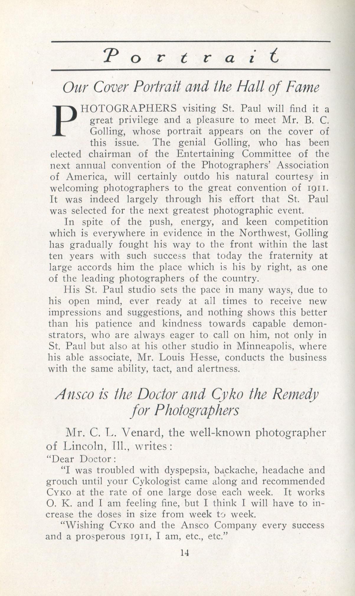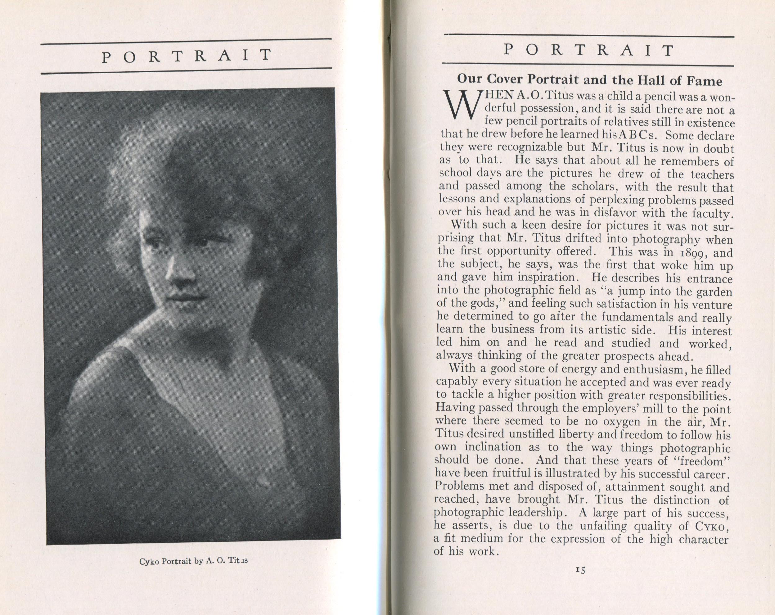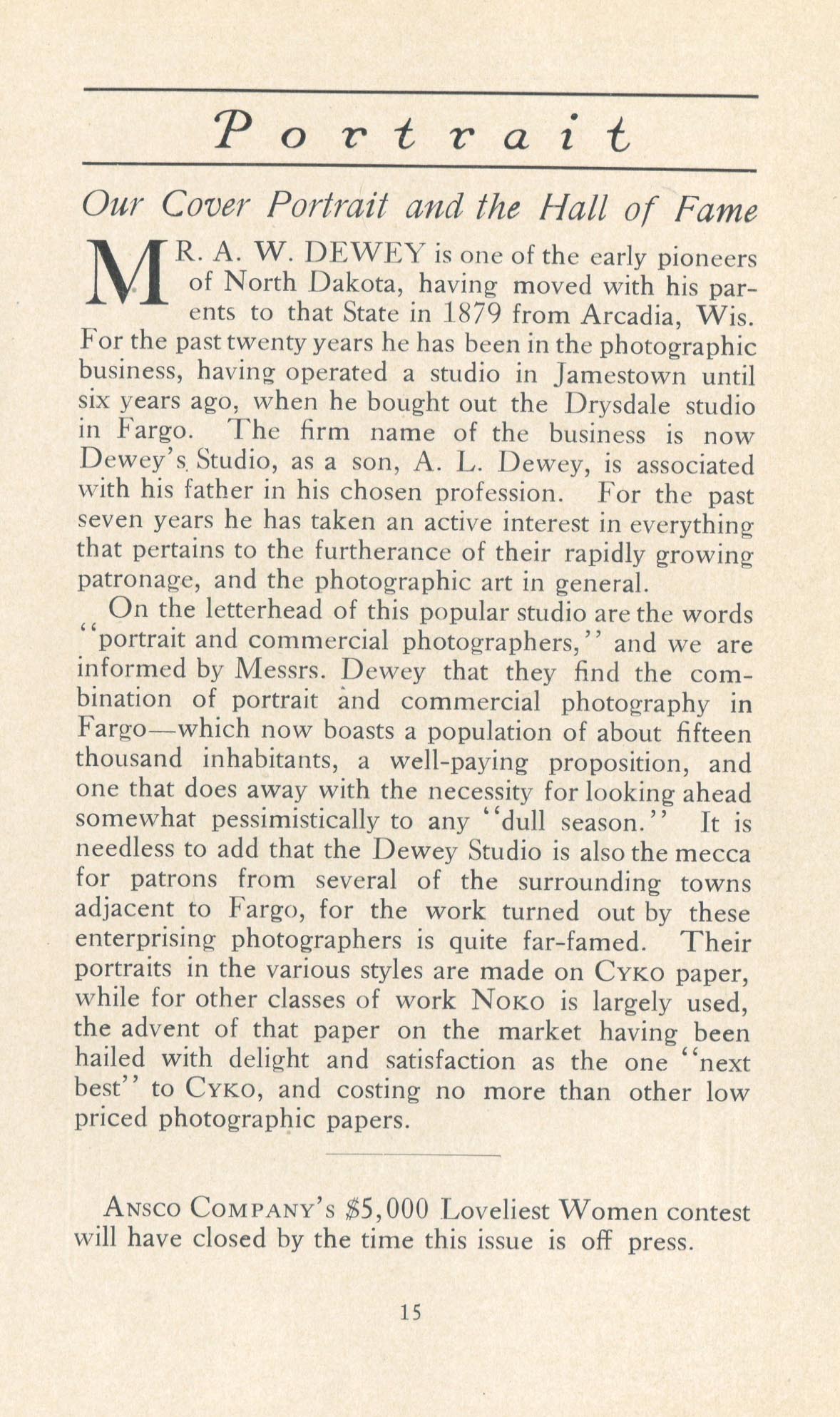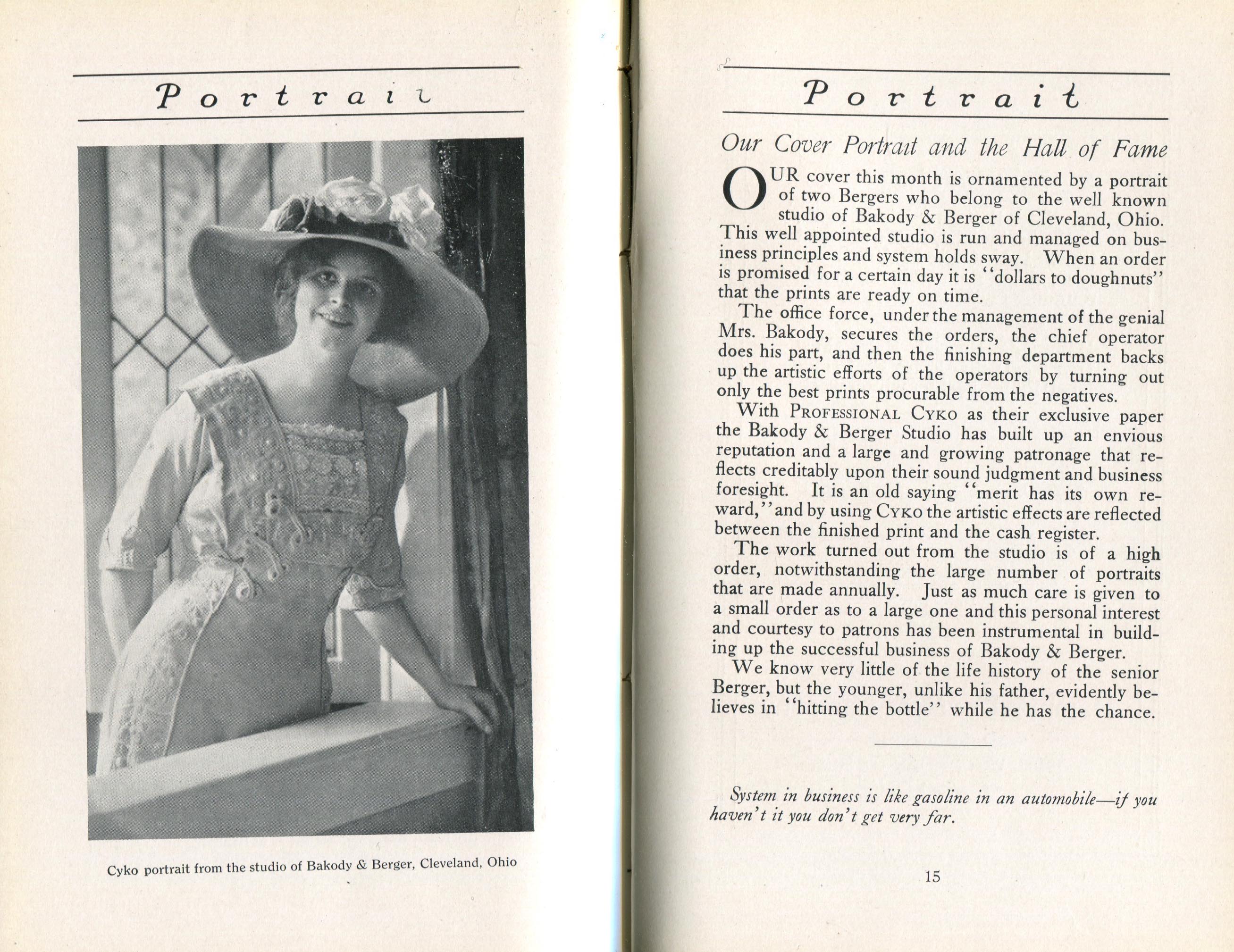 In addition to testimonials, Portrait promoted the use of Cyko paper through contests, notably the one announced in March 1914 called, "America's Fifty Loveliest Women Contest." To encourage women to pose, ANSCO offered posters and other promotional literature to photographers. Among the judges was Alfred Stieglitz. The winners were reported in the March 1915 issue; Philip Conklin of Troy, New York, received the first prize. One of the few prize winners whose name is familiar today was E.O. Hoppé, who won three lesser prizes.