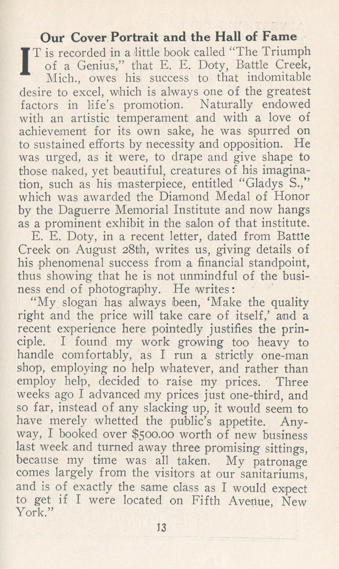 Doty, E.E. Battle Creek MI – October 1910 Cover Profile