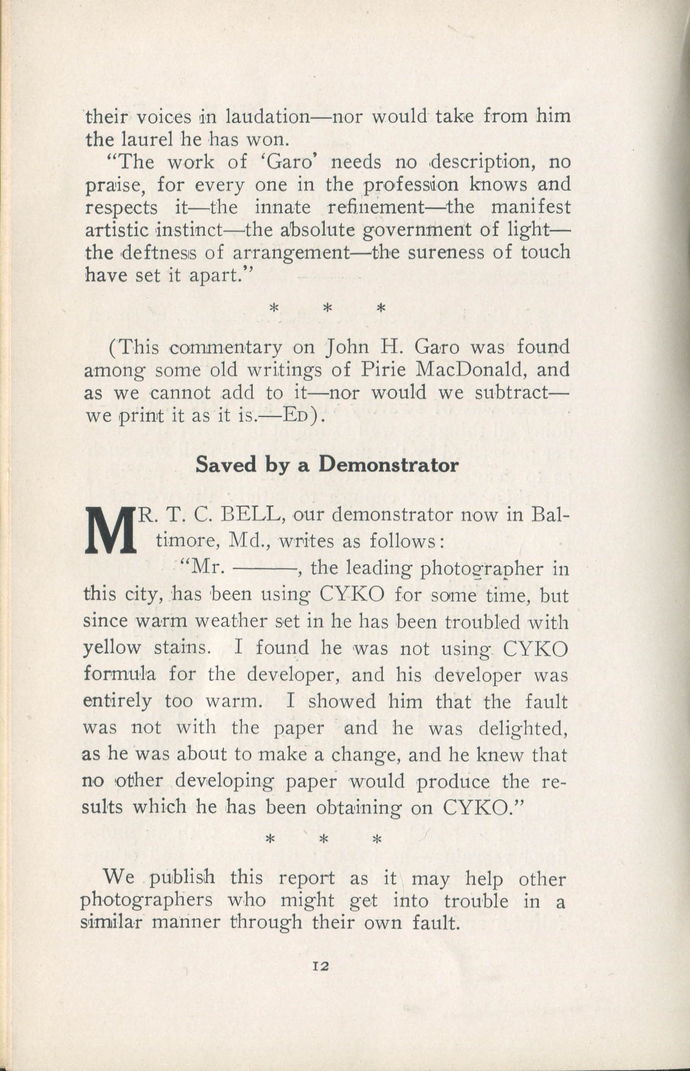 Although the journal's obvious purpose was to promote the use of ANSCO products, in particular Cyko paper, it also published articles containing news and advice. News features concerned such topics as advances in artificial lighting, the erection of the Hannibal Goodwin monument, and recruitment of photographers for service in World War I. Schedules for, and reports on, professional photographers' conventions were also provided regularly. Published photographs of photographic supply stores and advertisements for a variety of products provide additional historically useful information.