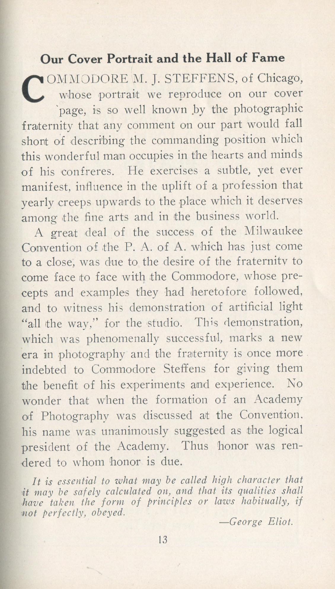 Steffens, M.J., Commodore. Chicago IL – August 1910 Cover Profile